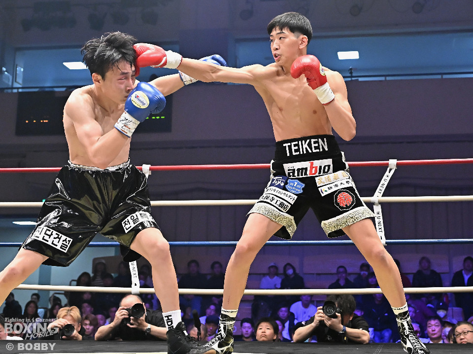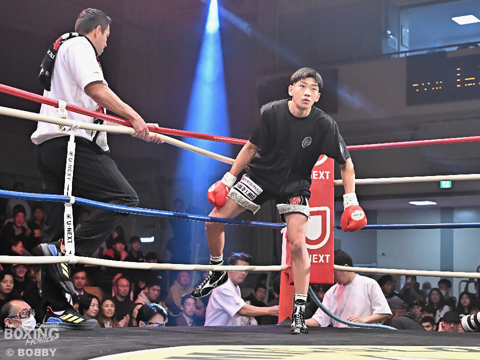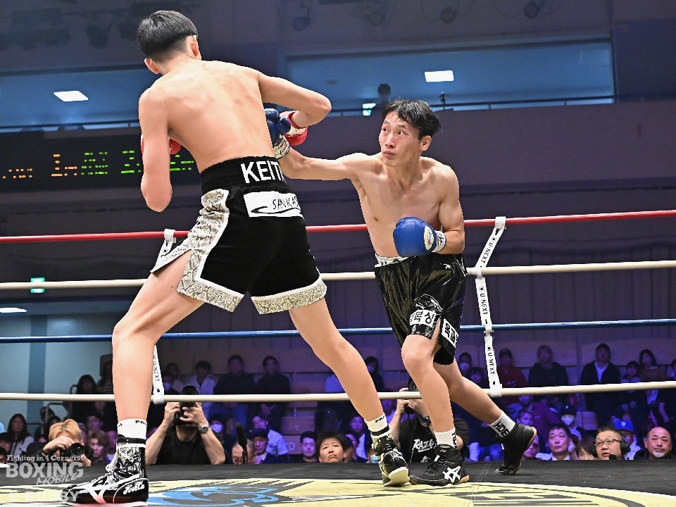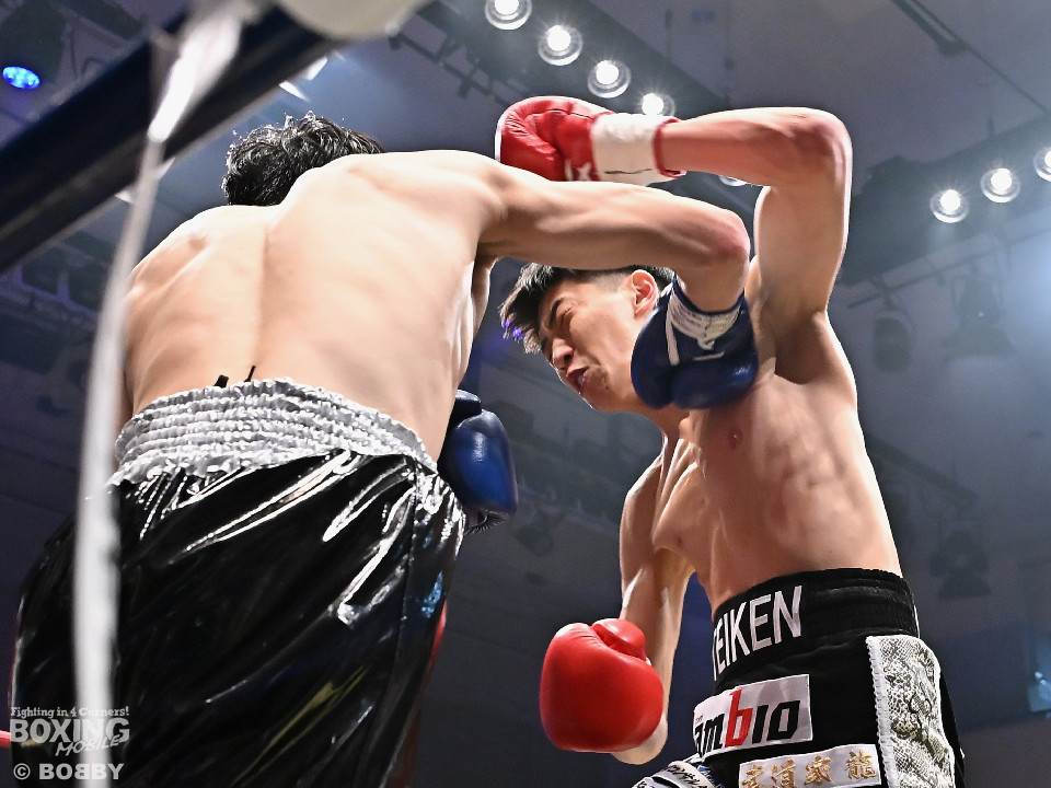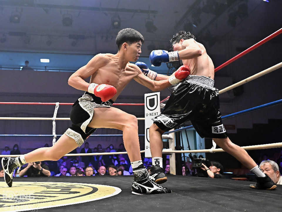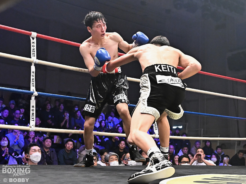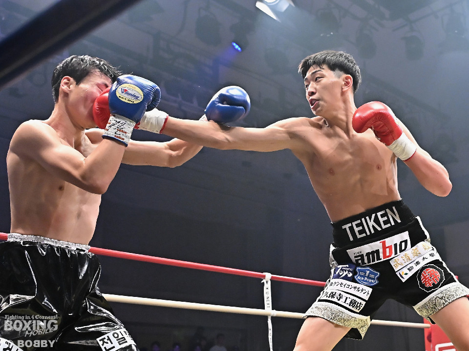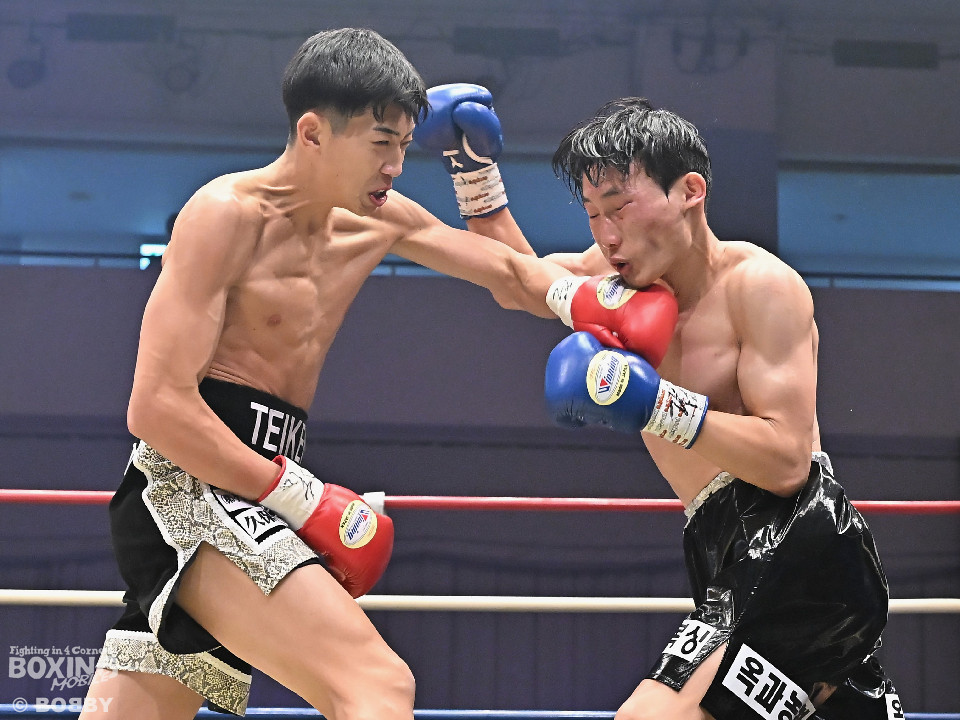 試合:長身サウスポーの久保寺と韓国のシム・ヨンホの対決。リーチの差を活かして右ジャブを上下に散らして前に出た久保寺が左ストレートを打ち下ろした。顔面を叩かれたシムも打ち終わりに右を返したが、久保寺のペースで初回を終えた。2回、被弾で顔が赤らんだシムに鞭のようにしなやかな左ストレートをボディに打ち込んだ久保寺がパンチをまとめたところで、前屈みになったシムを見て、レフェリーが試合を止めた。