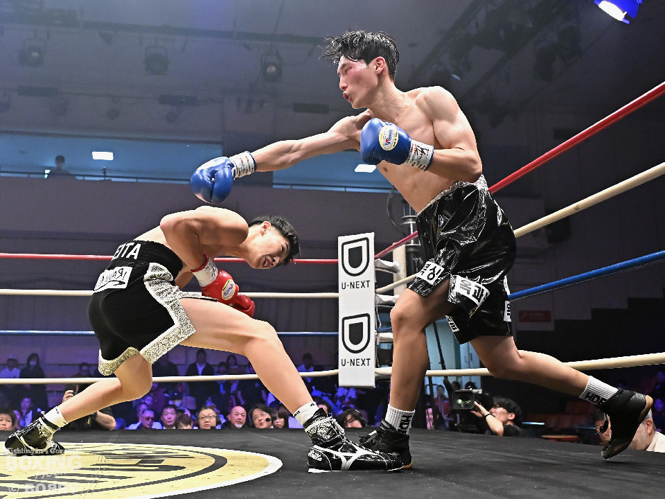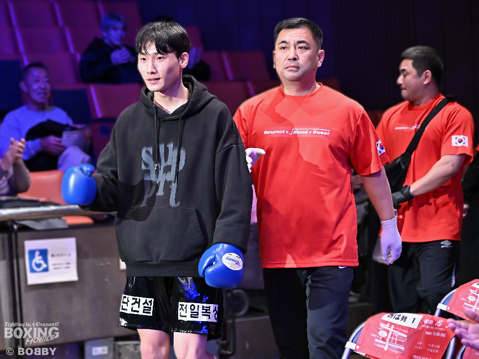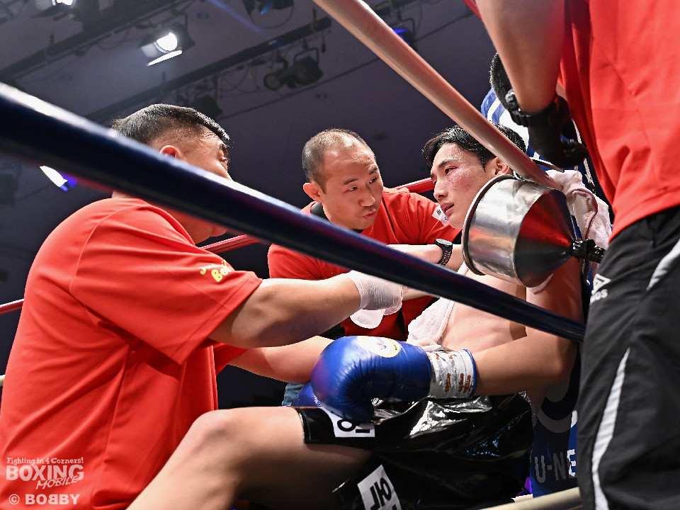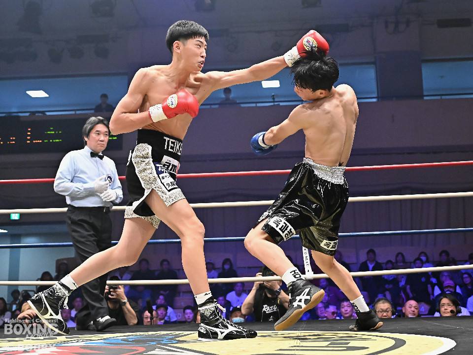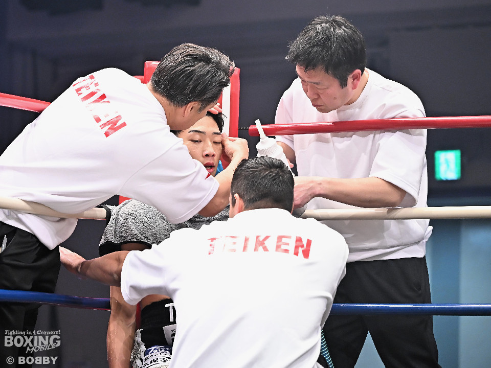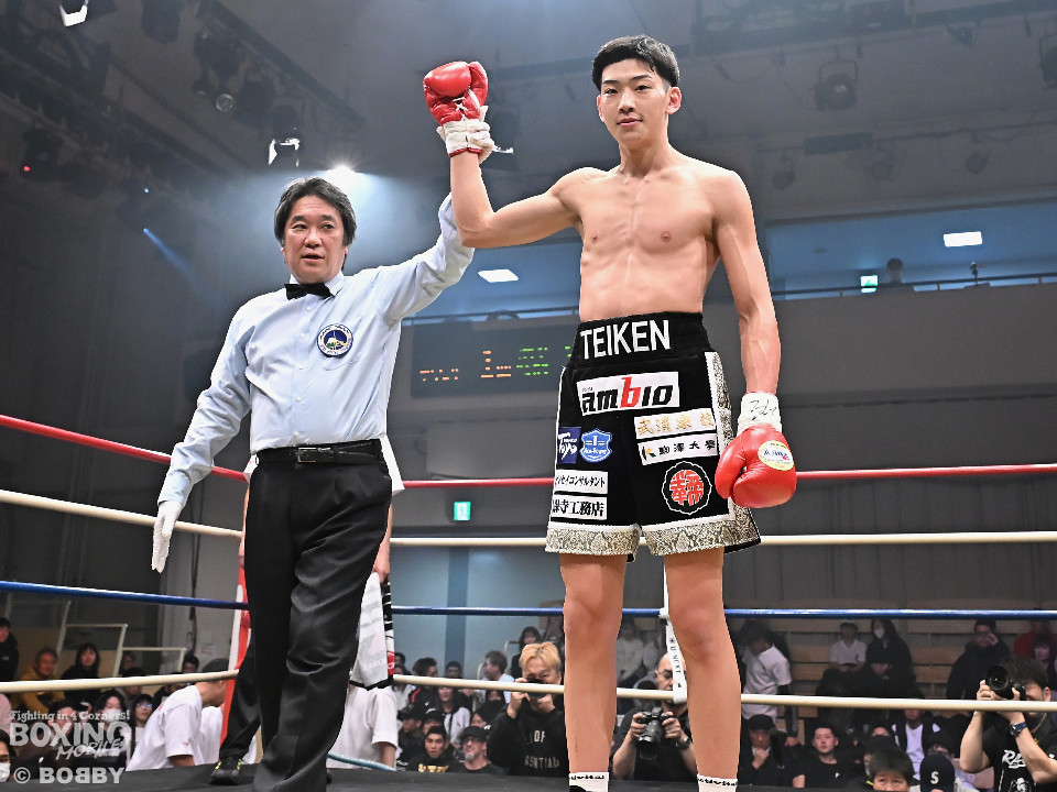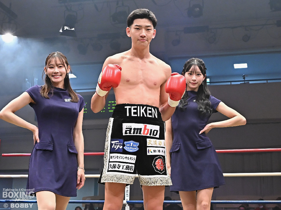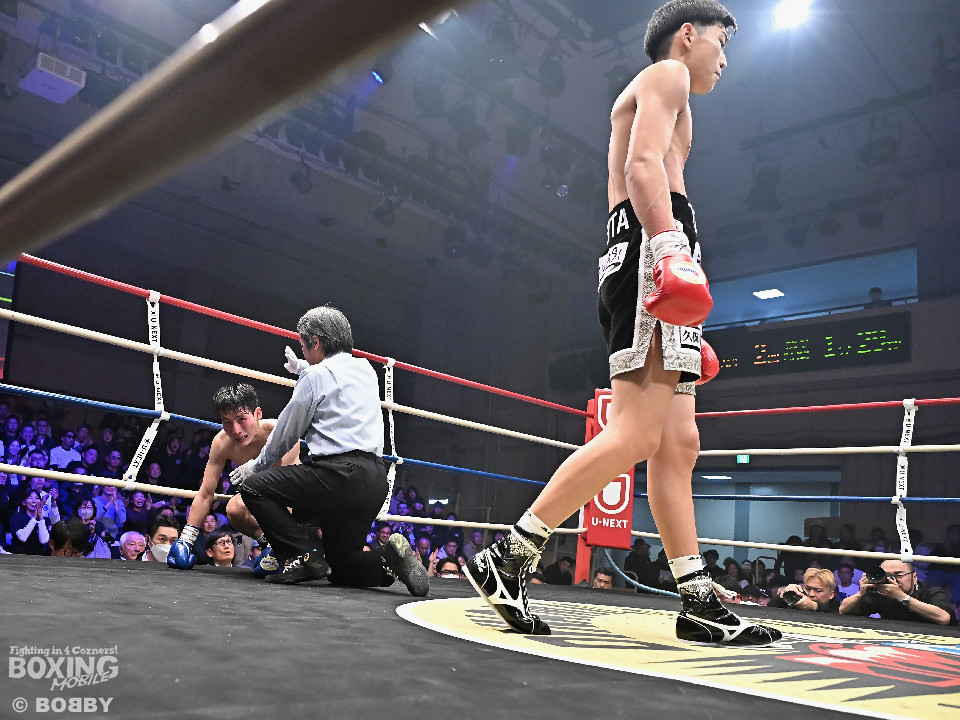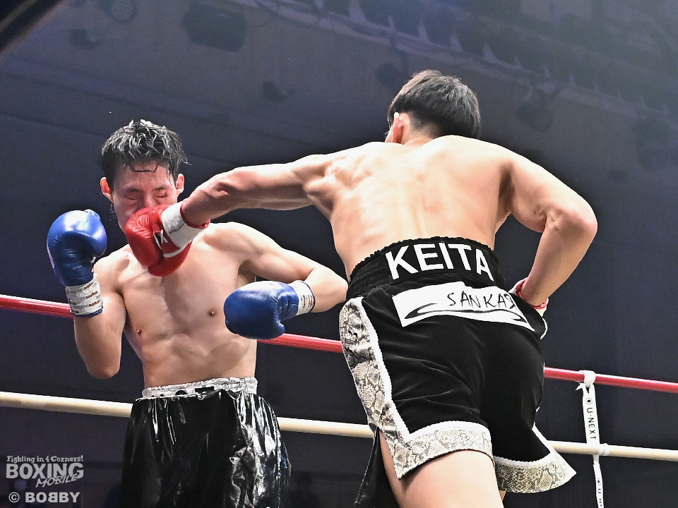 試合:長身サウスポーの久保寺と韓国のシム・ヨンホの対決。リーチの差を活かして右ジャブを上下に散らして前に出た久保寺が左ストレートを打ち下ろした。顔面を叩かれたシムも打ち終わりに右を返したが、久保寺のペースで初回を終えた。2回、被弾で顔が赤らんだシムに鞭のようにしなやかな左ストレートをボディに打ち込んだ久保寺がパンチをまとめたところで、前屈みになったシムを見て、レフェリーが試合を止めた。