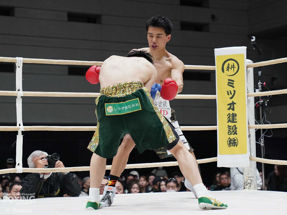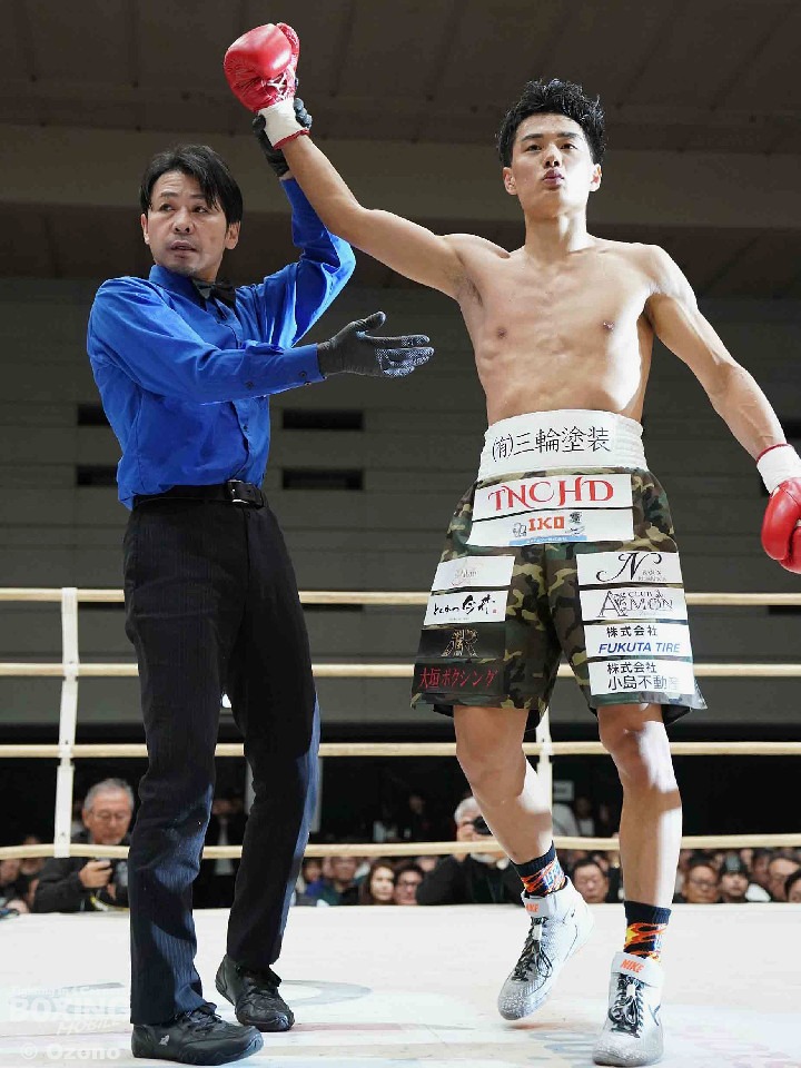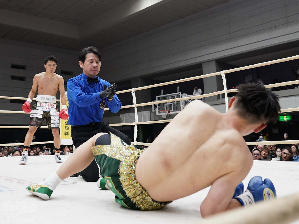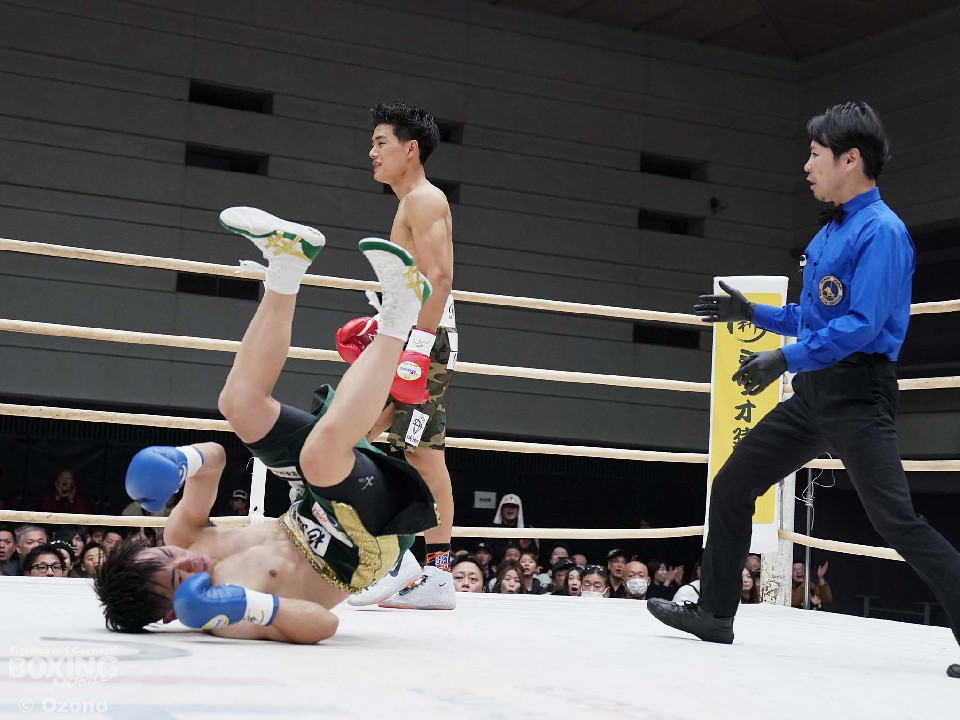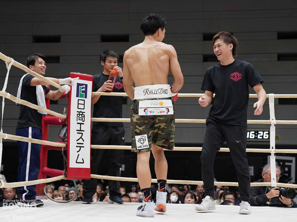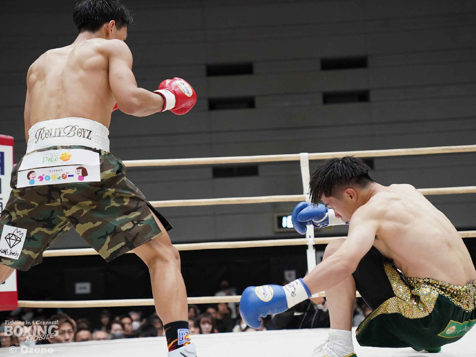 試合:上体を屈めて勢いよく前に出る湯浅。田下は冷静に対処しボディからアッパーに繋げ頭を跳ね上げる。ラウンド終了間際、コーナーを背にした田下の左ストレートがクリーンヒット!一度目のダウンを奪う。2回、スイッチを交えなが前に出る湯浅のパンチをL字ガードを駆使して冷静に防いだ田下。その後、攻めに転じると左ストレートを再びクリーンヒットし二度目のダウンを奪う。そのまま10カウントを聞かせ田下がKO勝利を挙げた。
