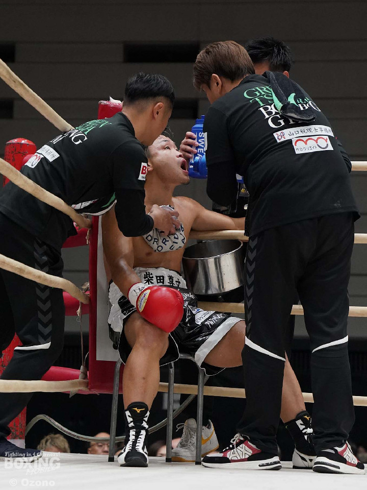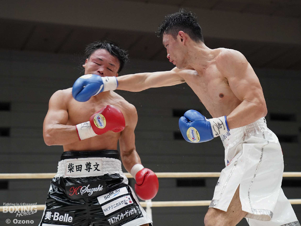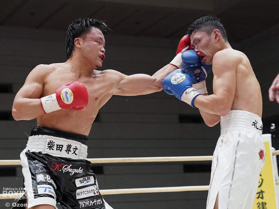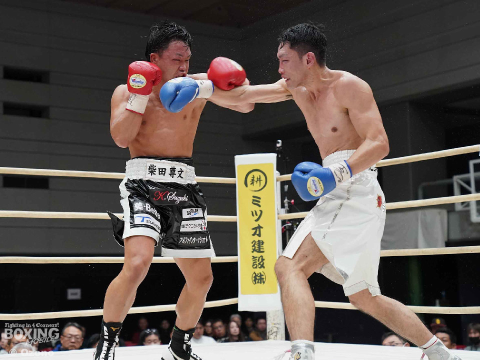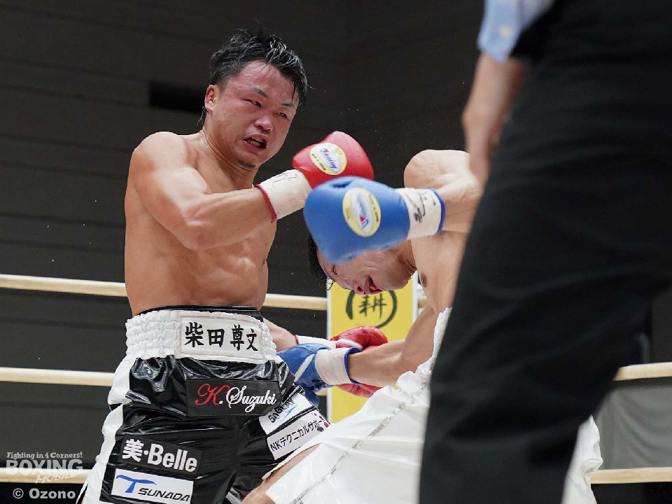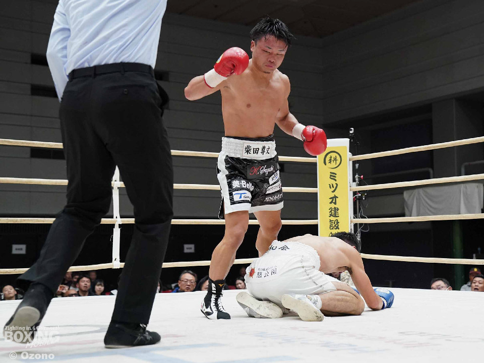 試合:リーチで上回る濱島がジャブをつきヒットさせる。柴田はガードを固め懐に入る機会を伺いながらジャブも伸ばしお互い初回はジャブの交錯となった。2回、濱島はジャブからボクシングを組み立て柴田の顔を腫らす。パワーで勝る柴田は徐々に距離が合ってきたか。近距離で左右フックを当てる。3回、一気に距離を縮めた柴田は上からフックを振り下ろし一度目のダウンを奪う。立ち上がった濱島に怒涛の連打をするが試合は決めきれずゴング。4回、柴田の勢いは止まらず左右ボディフック連打で会場を沸かし顔面へもパンチを集めた。濱島も打ち返してはいるが柴田の勢いを止めるまでには至らず。この回ヒッティングで濱島が左目をカット。5回、柴田の右ストレートがヒットするが濱島は「効いてないぞ」とアピール。6回、濱島の手数が復活。しかし柴田は引くことなく前に出て顔面にパンチを集める。7回、開始直後から打ち合いになる。ここでフック連打を仕掛けた柴田の左フックが直撃しダウンを奪う。立ち上がる濱島に怒涛の追撃をしダメージを見たレフェリーが試合を止めた。
