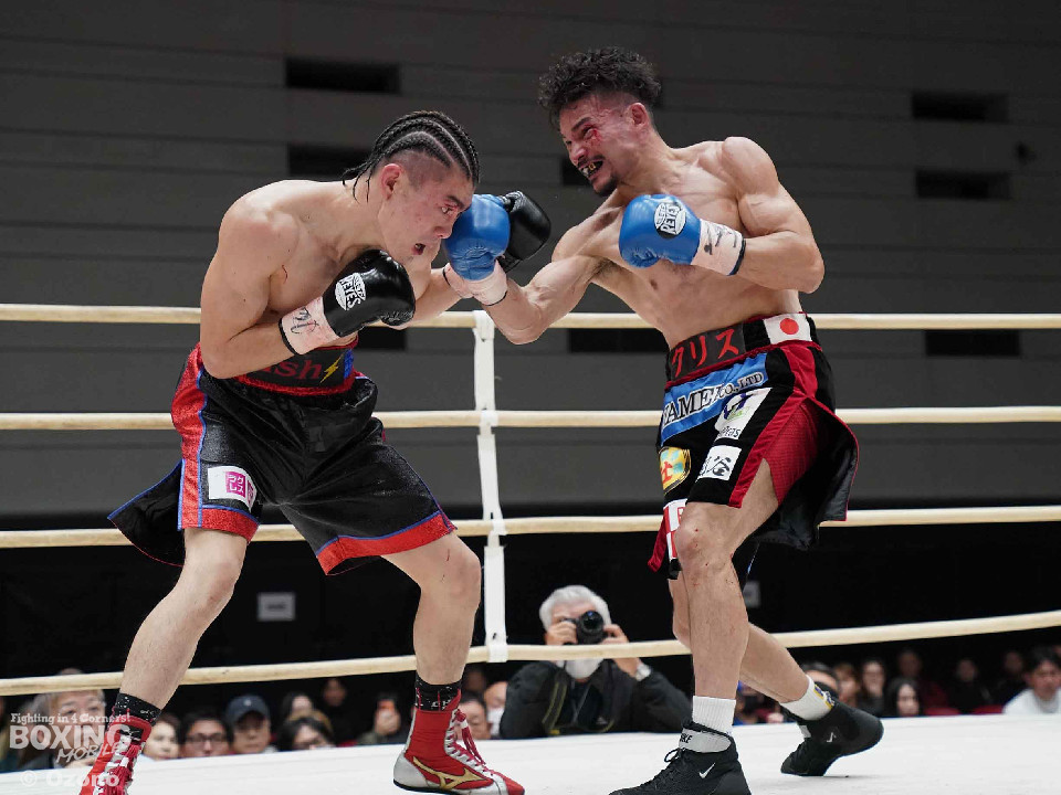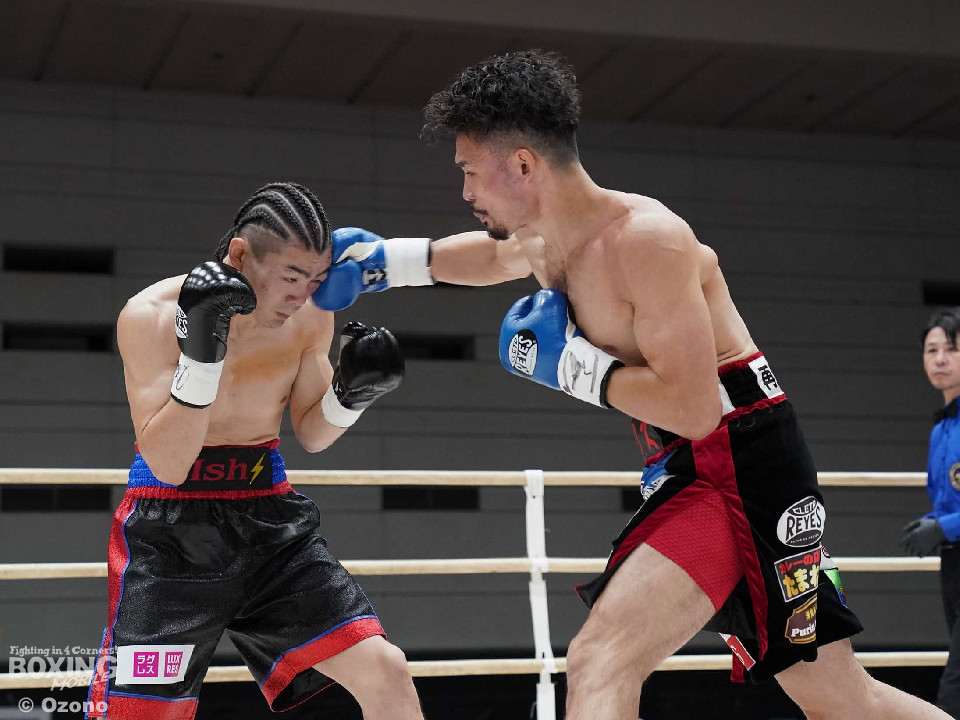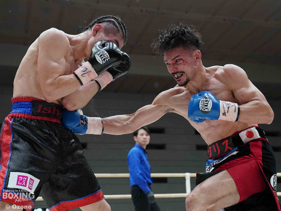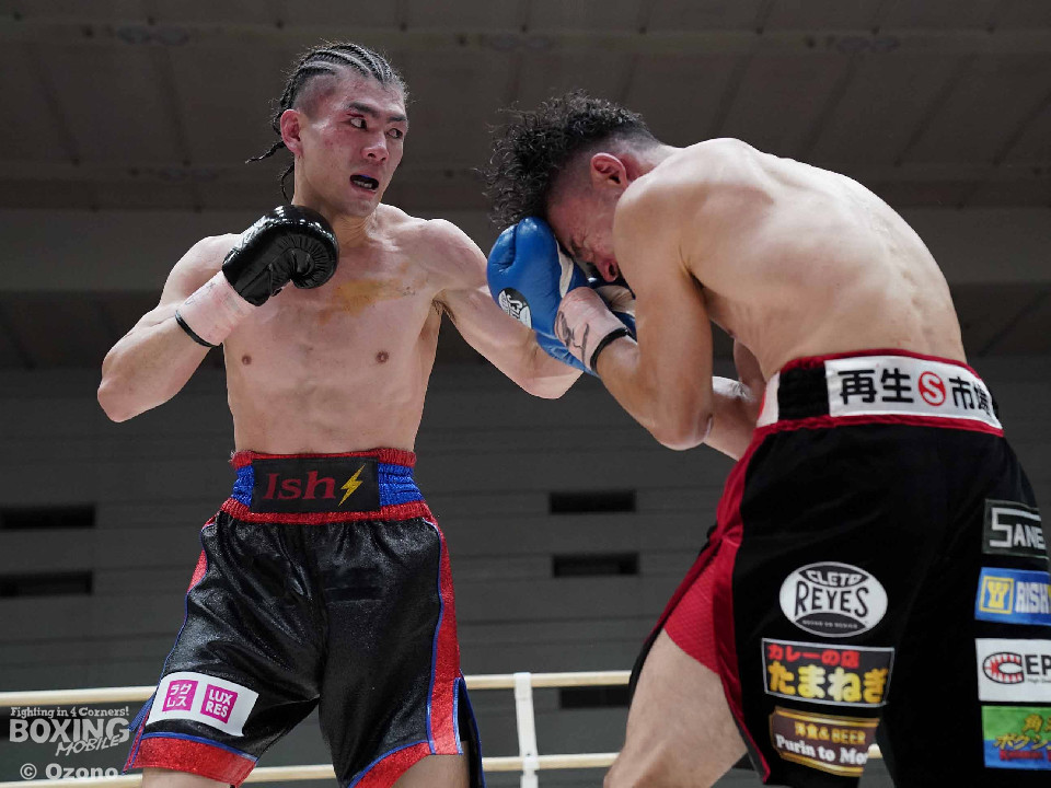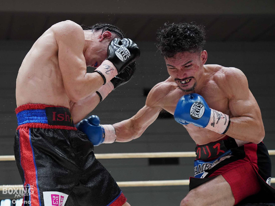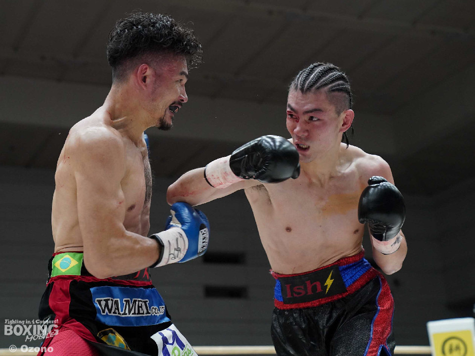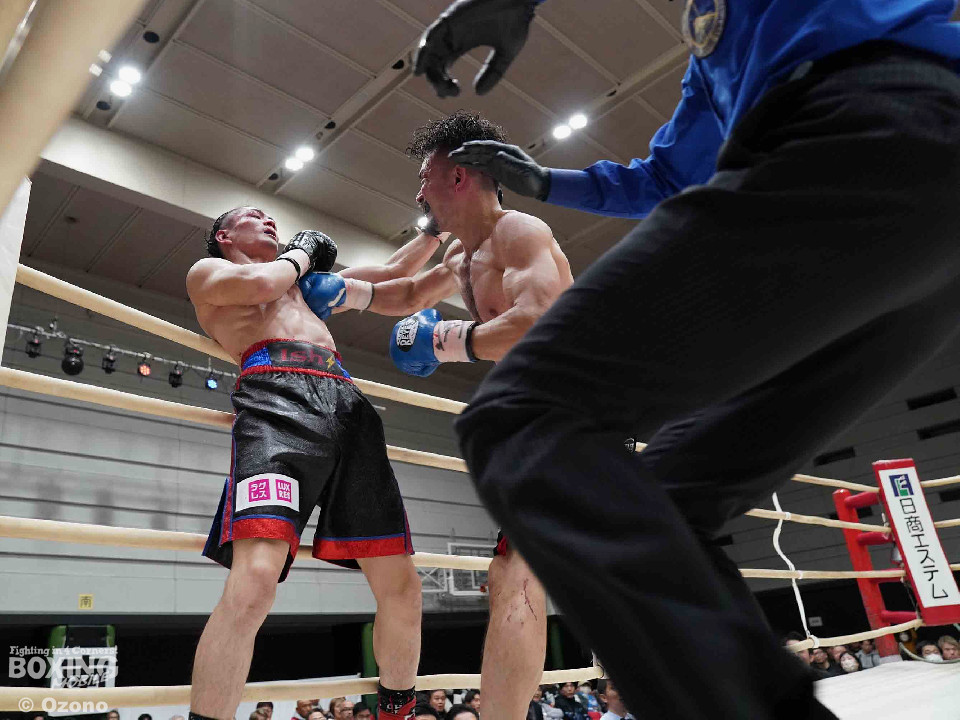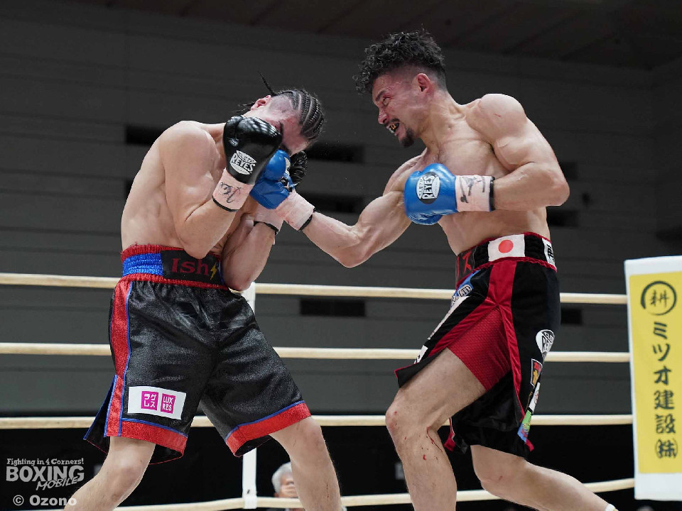試合:お互いレイジェスのグローブをつけたハードパンチャー同士の試合。アオキが上体を大きく振りながらフックを狙う。石脇は右ストレートを的確に合わせる。2回、ガードをガッチリ固める石脇に低く構えたアオキのフック、ボディがヒットする。石脇は冷静に対応しボディを当てて削りにかかる。3回、愚直にプレスをかけ左右フックを狙うアオキに石脇のボディが直撃。アオキは嫌がる素振りを見せるが終盤は回転数が戻る。石脇は顔面へもパンチを集めた。4回、お互い近い距離でボディから顔面にパンチを繋げる。両者、被弾はあるが気合いで打ち合い一進一退となる。5回開始から近距離での打ち合い。死力を尽くした戦いとなる。6回、アオキが左右フックの強打を放ち、左ボディまで繋げる。石脇も要所で左フックを当てペースは渡さない。7回、お互い疲れが見え組み合う場面も増えたが、近距離で打ち合いここでも一進一退となる。ややヒット数でアオキが上回ったか。最終回、最後の力を振り絞り打ち合う。ここでアオキがアッパーをクリーンヒットさせ石脇が下がる。ここぞとばかりにアオキが追撃を仕掛け動きが止まった石脇をレフェリーが救った。アオキは死闘を制し勝利の雄叫びをあげた。