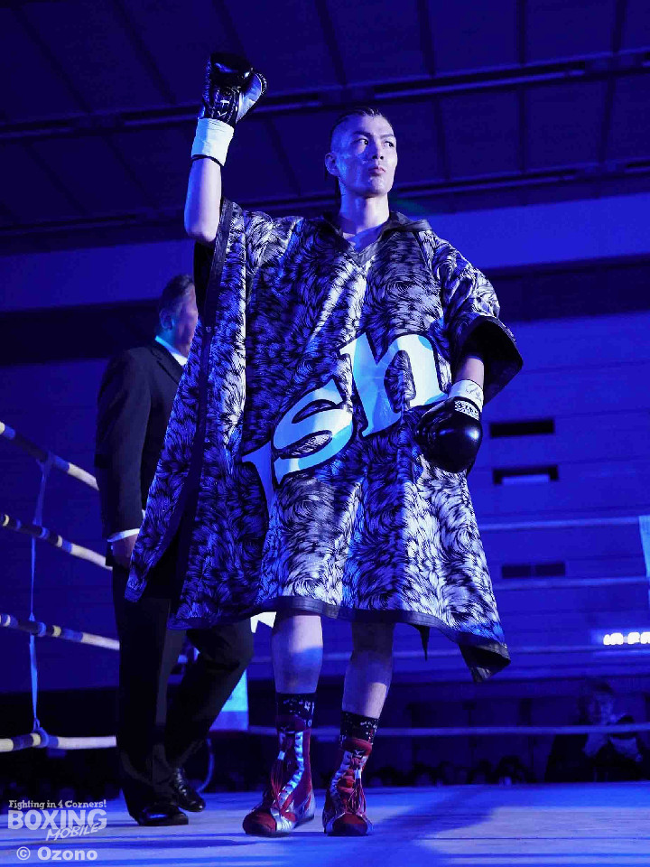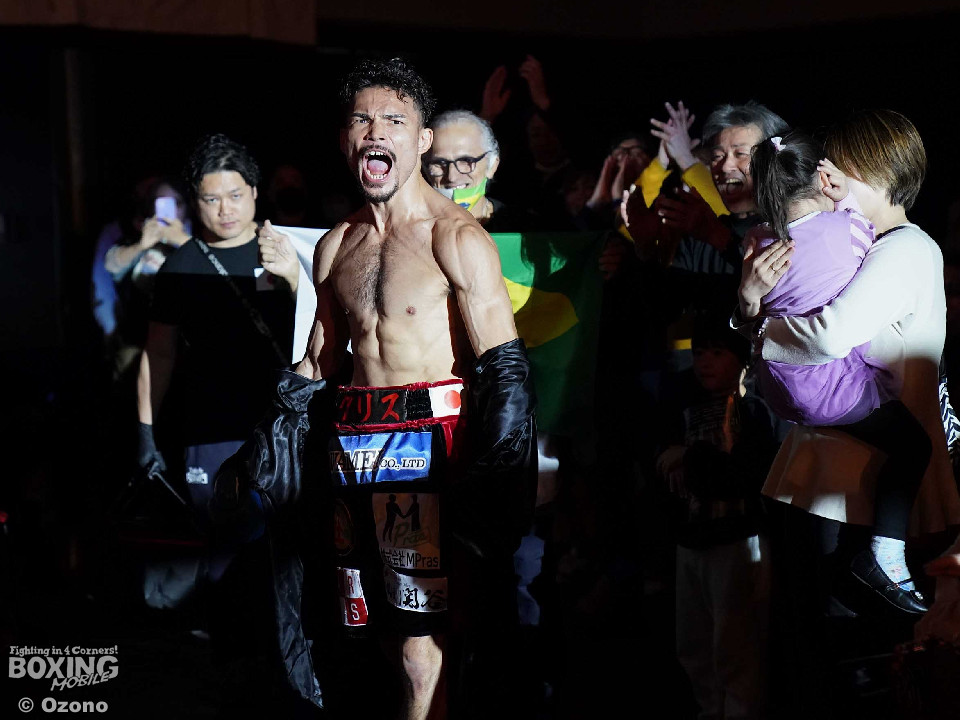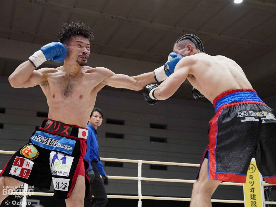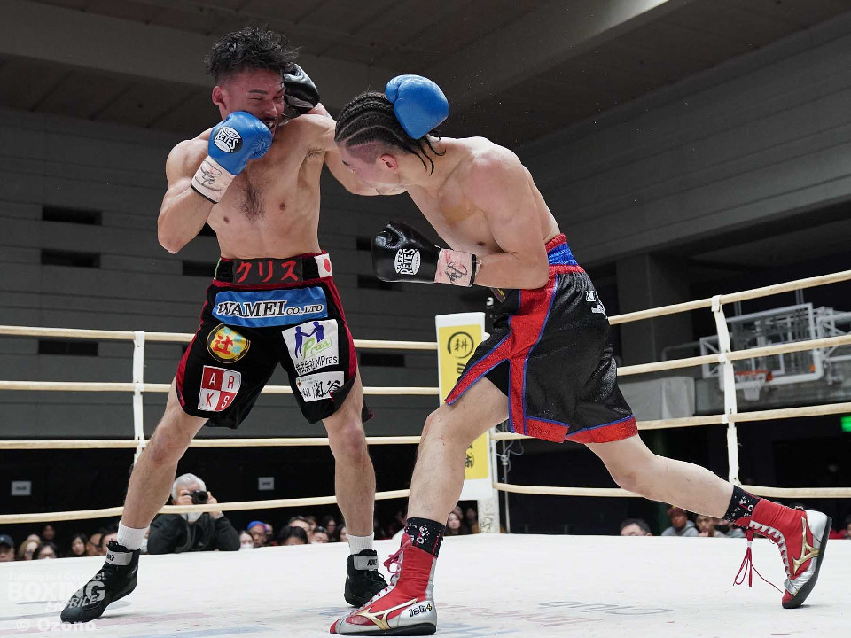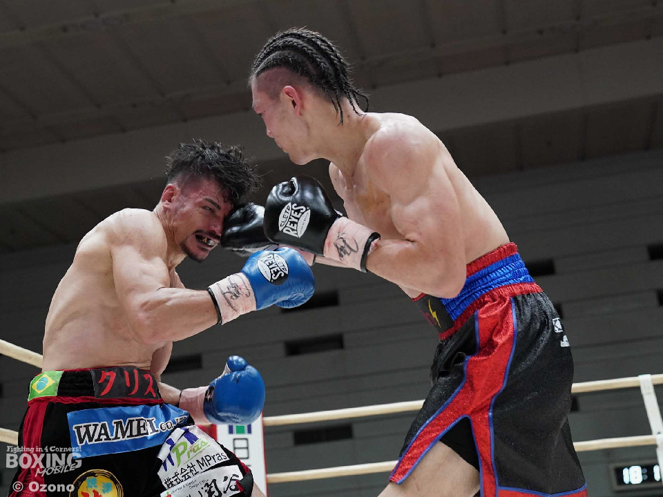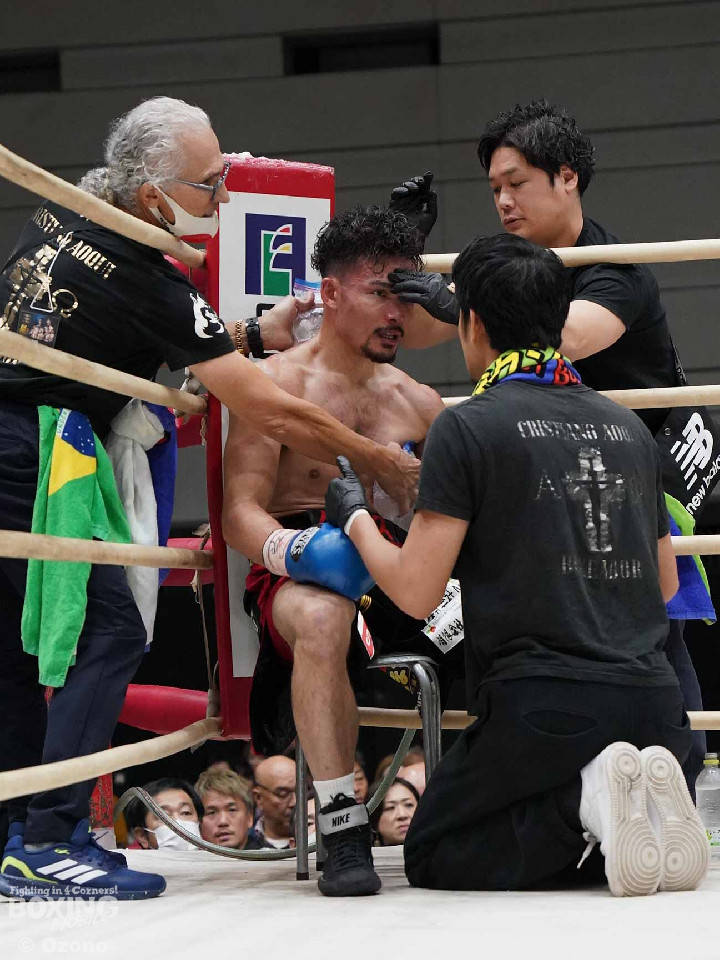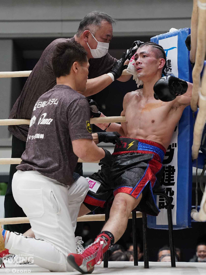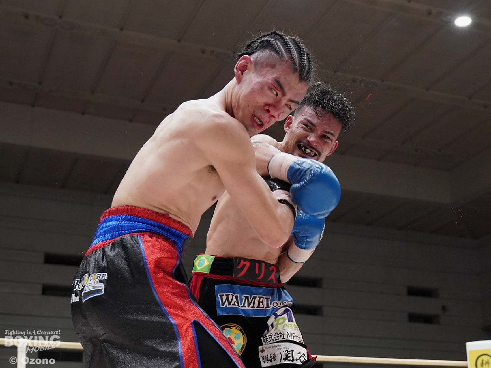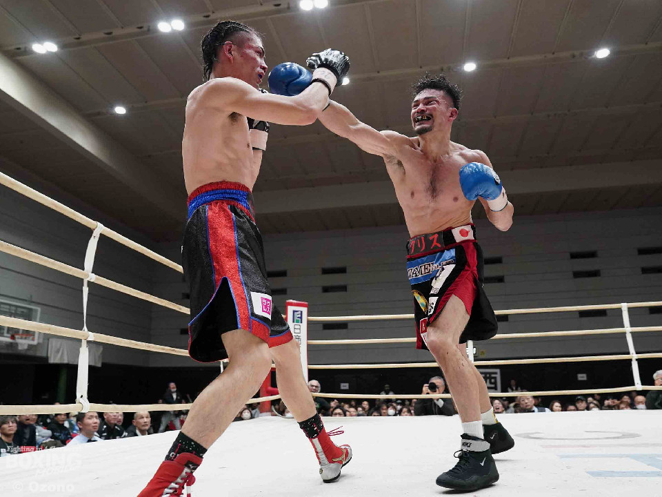 試合:お互いレイジェスのグローブをつけたハードパンチャー同士の試合。アオキが上体を大きく振りながらフックを狙う。石脇は右ストレートを的確に合わせる。2回、ガードをガッチリ固める石脇に低く構えたアオキのフック、ボディがヒットする。石脇は冷静に対応しボディを当てて削りにかかる。3回、愚直にプレスをかけ左右フックを狙うアオキに石脇のボディが直撃。アオキは嫌がる素振りを見せるが終盤は回転数が戻る。石脇は顔面へもパンチを集めた。4回、お互い近い距離でボディから顔面にパンチを繋げる。両者、被弾はあるが気合いで打ち合い一進一退となる。5回開始から近距離での打ち合い。死力を尽くした戦いとなる。6回、アオキが左右フックの強打を放ち、左ボディまで繋げる。石脇も要所で左フックを当てペースは渡さない。7回、お互い疲れが見え組み合う場面も増えたが、近距離で打ち合いここでも一進一退となる。ややヒット数でアオキが上回ったか。最終回、最後の力を振り絞り打ち合う。ここでアオキがアッパーをクリーンヒットさせ石脇が下がる。ここぞとばかりにアオキが追撃を仕掛け動きが止まった石脇をレフェリーが救った。アオキは死闘を制し勝利の雄叫びをあげた。