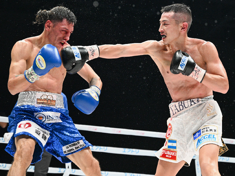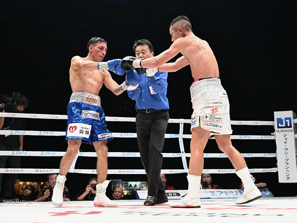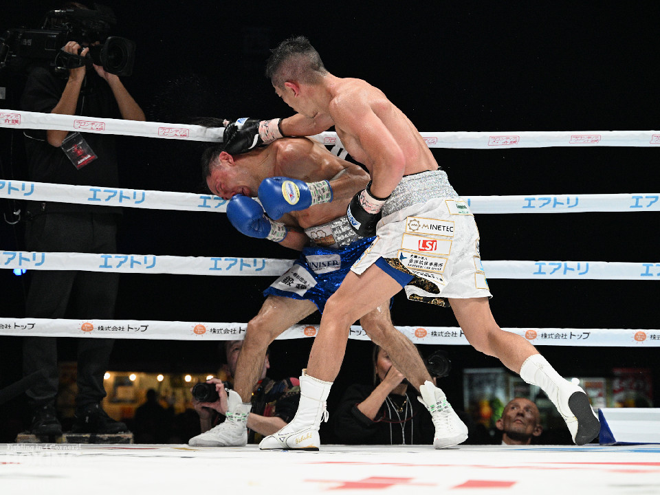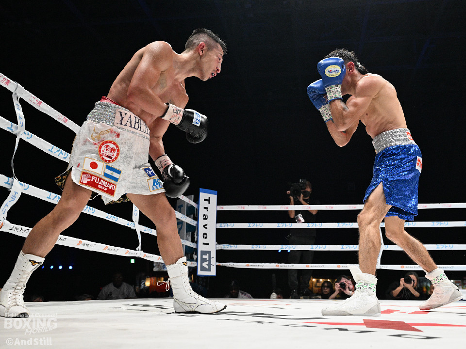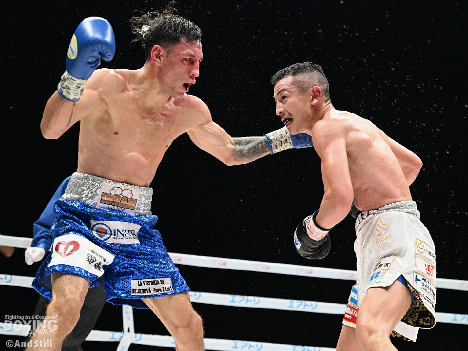 試合:矢吹とアルバラードの対決!初回から前に出てきたアルバラードに対して、矢吹はジャブと左アッパーと右ストレートで打ち合いに応じた。2回、左右のボディを叩きに潜り込んできたアルバラードに対して、矢吹は右アッパーと右の打ち下ろしでガードの隙を叩いた。3回、矢吹が左ボディをえぐると、アルバラードが距離を取り出した。カウンターを合わせる矢吹を警戒するアルバラードに、矢吹は右アッパーと右の打ち下ろしを連打した。4回は前に出て体をつけて打ち合った両者。矢吹はコーナーに追い込まれても冷静にアッパーとボディを叩いて詰めさせず。5回も接近戦が続いたが、矢吹はガードを下げず。アルバラードの打ち終わりを狙った。6回はアルバラードの手数が減った。一方矢吹はジャブの連打から右ストレートとボディを打ってリズムを作った。7回は矢吹の右の打ち下ろしからの左ボディの繰り返しが光った。8回、アルバラードが左右のボディを削りにきたがガードで凌いだ矢吹。10回に矢吹の有効打でアルバラードが右目をカット。終盤戦、矢吹が変化をつけて飛び込んで左ボディとフックを強打。試合が動いたのは11回、速いパンチの交換から矢吹が左フックから右ストレートを被せてダウンを奪った。最終回、下がったアルバラードにジャブの連打から右ストレートを打ち込んでダウンを奪って勝利。