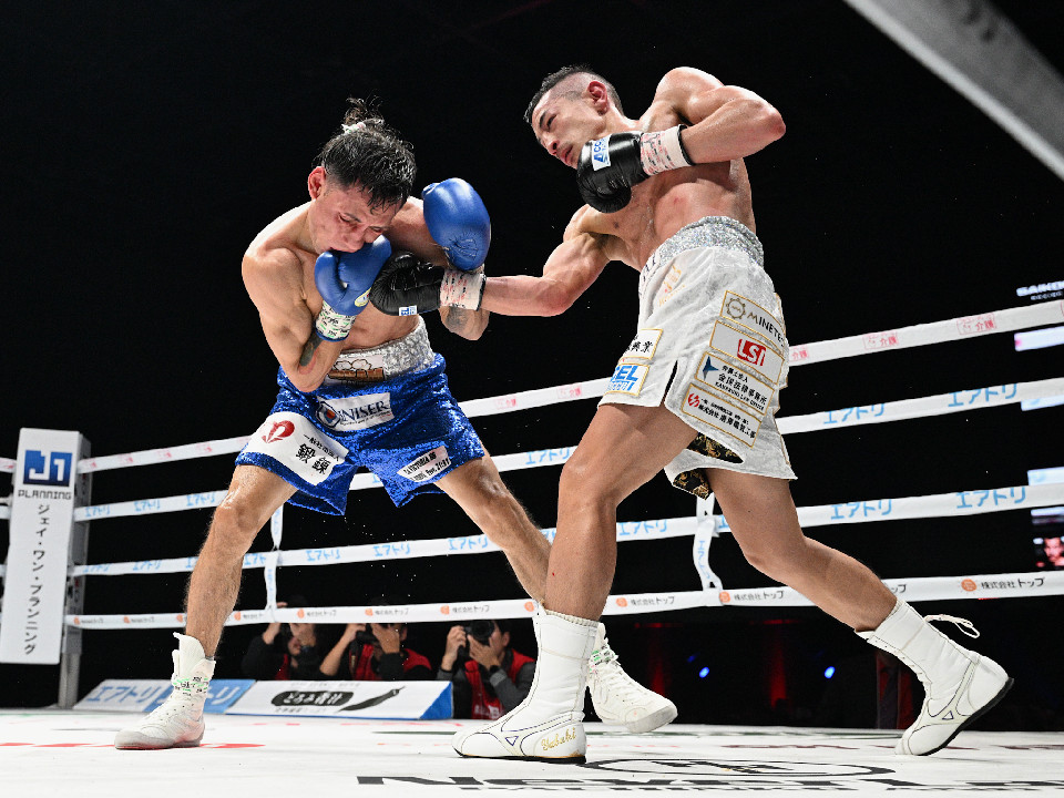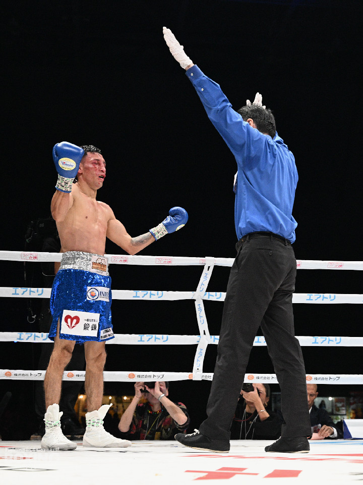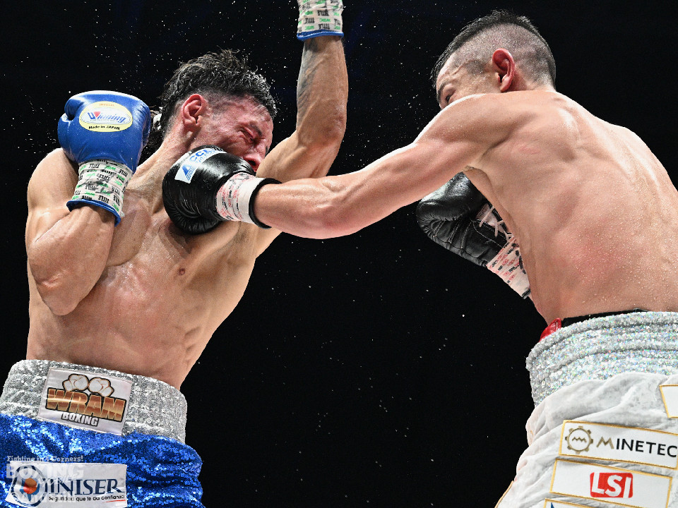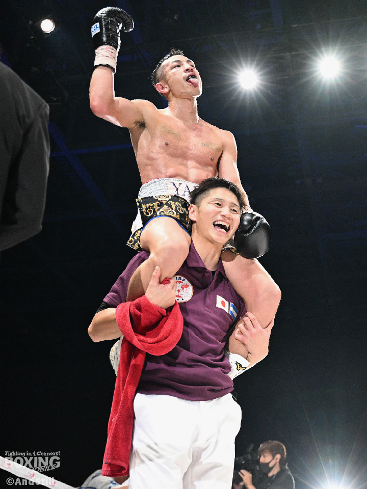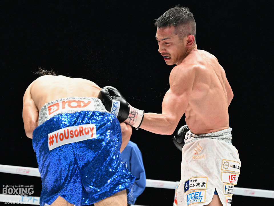 試合:矢吹とアルバラードの対決!初回から前に出てきたアルバラードに対して、矢吹はジャブと左アッパーと右ストレートで打ち合いに応じた。2回、左右のボディを叩きに潜り込んできたアルバラードに対して、矢吹は右アッパーと右の打ち下ろしでガードの隙を叩いた。3回、矢吹が左ボディをえぐると、アルバラードが距離を取り出した。カウンターを合わせる矢吹を警戒するアルバラードに、矢吹は右アッパーと右の打ち下ろしを連打した。4回は前に出て体をつけて打ち合った両者。矢吹はコーナーに追い込まれても冷静にアッパーとボディを叩いて詰めさせず。5回も接近戦が続いたが、矢吹はガードを下げず。アルバラードの打ち終わりを狙った。6回はアルバラードの手数が減った。一方矢吹はジャブの連打から右ストレートとボディを打ってリズムを作った。7回は矢吹の右の打ち下ろしからの左ボディの繰り返しが光った。8回、アルバラードが左右のボディを削りにきたがガードで凌いだ矢吹。10回に矢吹の有効打でアルバラードが右目をカット。終盤戦、矢吹が変化をつけて飛び込んで左ボディとフックを強打。試合が動いたのは11回、速いパンチの交換から矢吹が左フックから右ストレートを被せてダウンを奪った。最終回、下がったアルバラードにジャブの連打から右ストレートを打ち込んでダウンを奪って勝利。