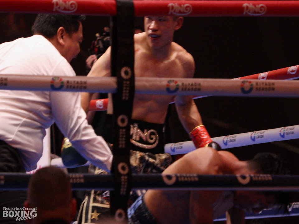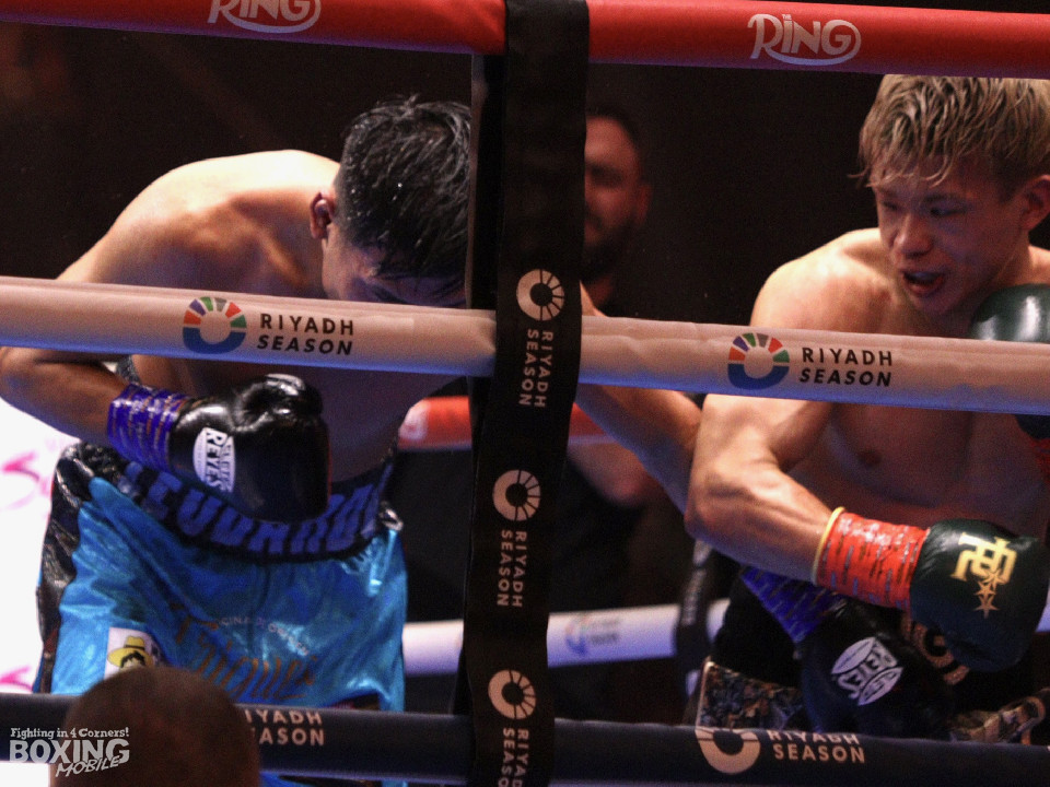 試合:サウスポー堤が前の手で揺さぶりをかけながらタイミングを測るのに対し、キンタナはすぐに左構えにスイッチ。緊張感あふれる攻防を見せる中、堤は左ストレートを好打。2回、堤は左アッパーを織り交ぜると、プレスをかけて打ち下ろしのワンツーをヒット。3回、キンタナはプッシュしながら右ストレートを叩きつけるが、堤はサッとサイドに切ると左ボディで体力を削った。4回、堤は左ストレートで顔を弾くと攻撃の手を緩めず。キレ味抜群の右フックでダウンを奪取。立ち上ったキンタナだったがレフェリーは試合をストップした。プロ4戦目の堤がリヤドの地で見事な勝利を飾った。