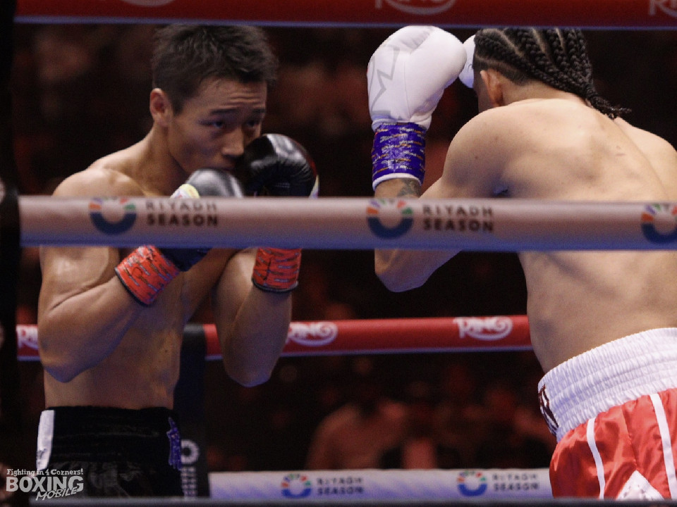 試合:前日本ライト級王者の今永が、リヤドのリングで世界ランカーのガルシアと拳を交えた。サウスポー同士による一戦はジャブの差し合いでスタート。2回、今永はジリジリと距離を詰めて左ボディをヒット。しかし、ガルシアも慌てる素振りを見せず。3回、中間距離での神経戦でし烈なペース争いが続いた。4回、今永は集中力を保ちながら要所で左ボディを叩くと上下に打ち分け見栄えの良さをアピール。5回、ガルシアは左ボディストレートを突き刺すとノーモーションの左で攻勢を印象付けた。6回、サウジアラビアの観客が手拍子する中、今永は相手の左をブロックするとジリジリと距離を詰めた。7回、ガルシア陣営が鼓舞する中、前に出たが今永は冷静に対応すると左カウンターを合わせた。8回、ガルシアはカウンターの右フックでダウンを奪取。再開に応じたが今永だがダメージが残る。必死に打ち返してこのラウンドをしのいだ。9回、危険なパンチを交錯させる中、ガルシアの左ストレートの見栄えがいい。10回、一進一退の攻防を繰り広げる中、ガルシアが要所でワンツーを決めた。ジャッジに委ねられた採点は割れたがガルシアに軍配が上がった。最後まで果敢に攻めた今永だったが、あと一歩及ばなかった。