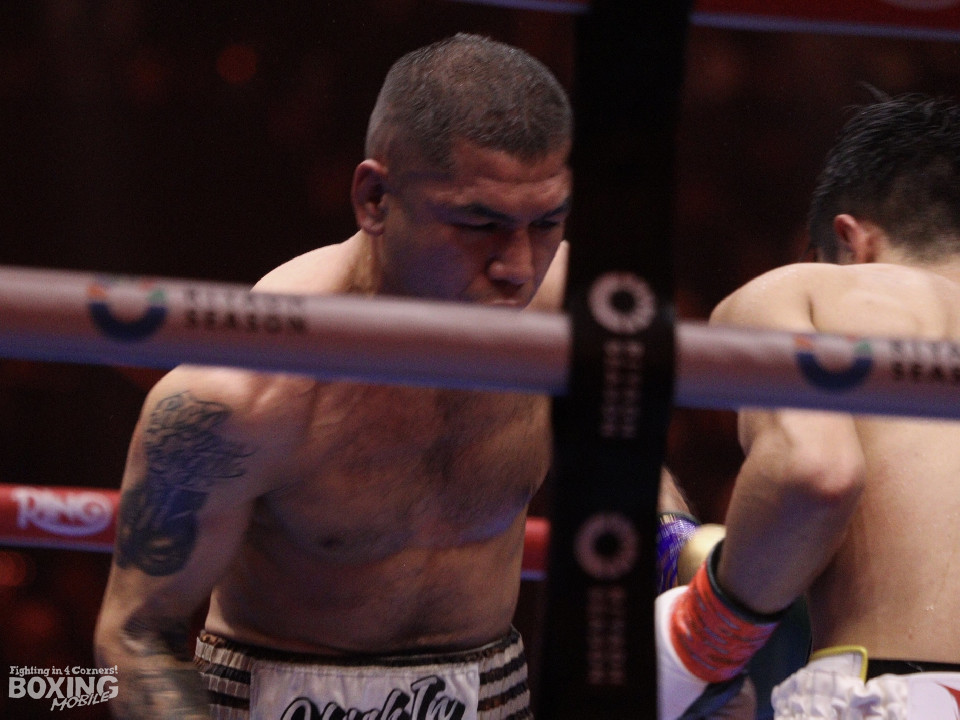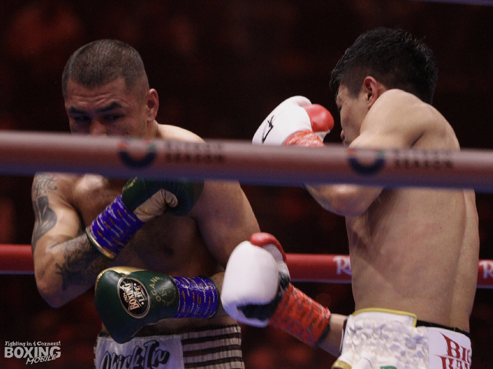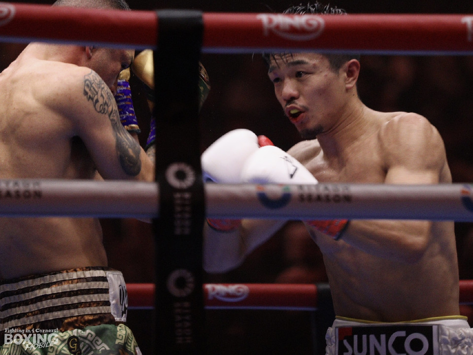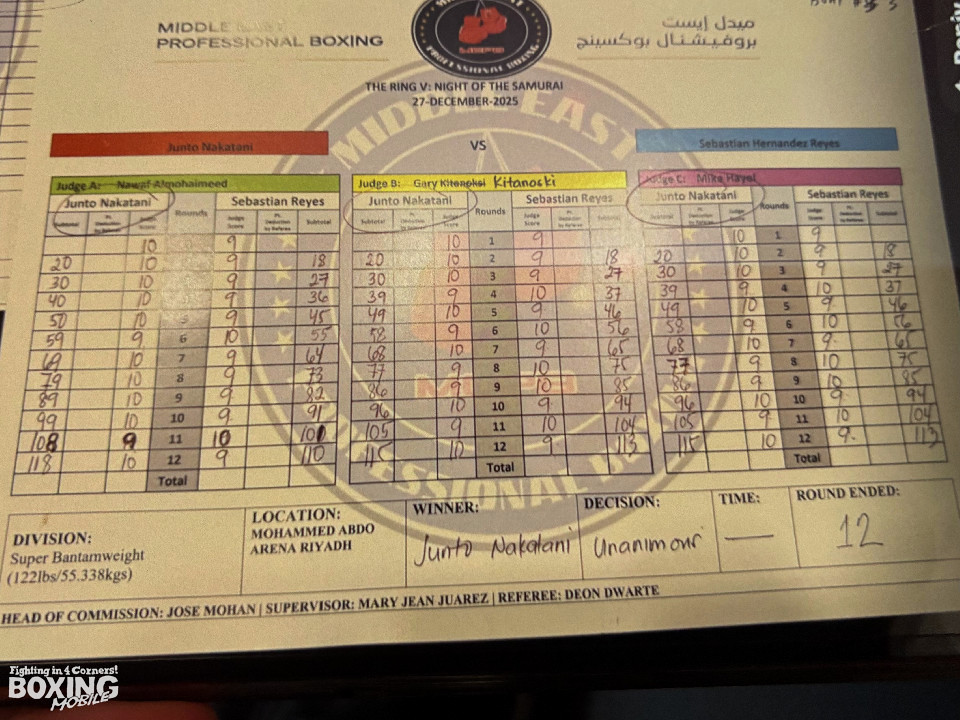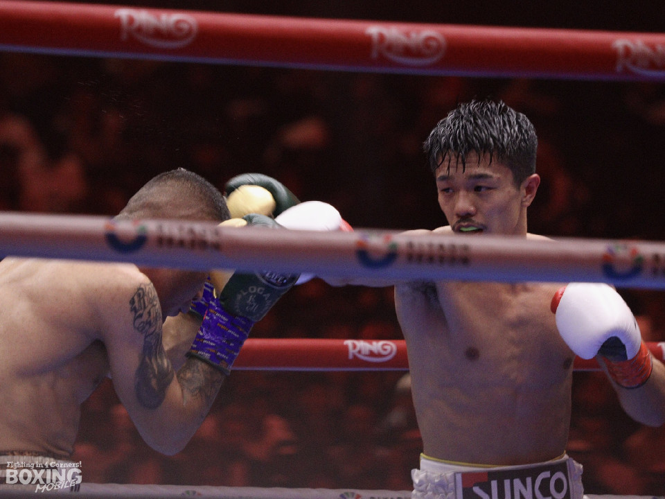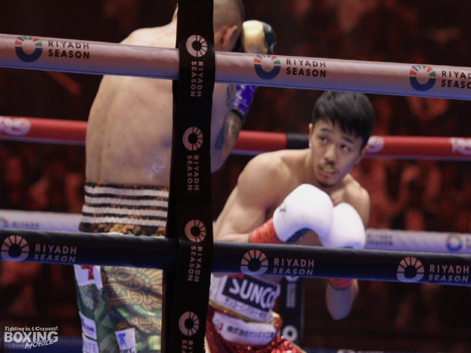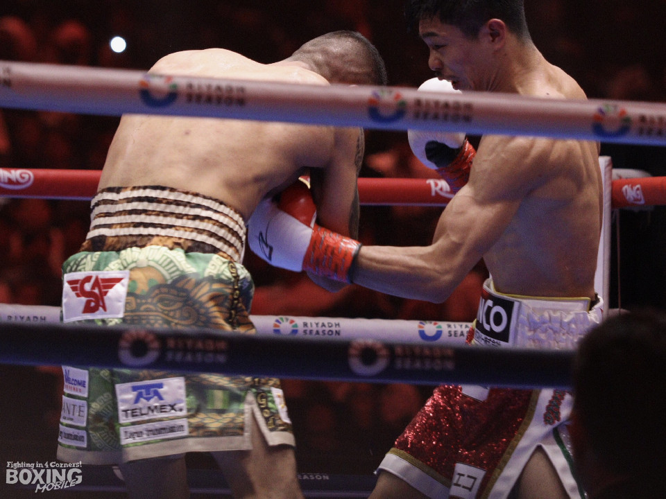 試合:世界4階級制覇を目指し中谷がスーパーバンタム級初戦を迎えた。会場が静寂に包まれる中、サウスポー中谷は重心をグッと落として投げるようにジャブを出しながら左ストレートで先制。ヘルナンデスはほとんど手を出さず。2回、中谷はサイドにスッと切ると左ストレートをヒット。リズム感のある攻撃を見せた。3回、接近戦で、中谷がショートアッパーを軸に優勢をアピール。4回、ギアを上げたヘルナンデスは回転力のある連打で反撃。このラウンド中谷はやや後手に回った。5回、中谷は要所で左ボディを突き刺すが、ヘルナンデスのしつこさは変わらず。タフな打ち合いが続いた。6回、激しいパンチの応酬と続く中、中谷は手数をまとめてペースを渡さず。7回、ヘルナンデスは無尽蔵のスタミナを活かした連打を披露。中谷も押し負けず。8回、中谷は左ボディアッパーを突き刺し、しつこい相手に有効打で上回った。9回、ヘルナンデスの手数が止まらない。中谷は打ち返すが相手は倍返し。10回、中谷は足を使いながら左ストレートをヒット。しかし、ヘルナンデスはしつこい。中谷は右目上を腫らした。11回、ヘルナンデスは回転力を活かした連打で攻勢。12回、中谷はワンツーを軸に前に出てくる相手を突き放した。タフなファイターに苦戦した中谷だが判定勝ちでリヤド決戦を制した。