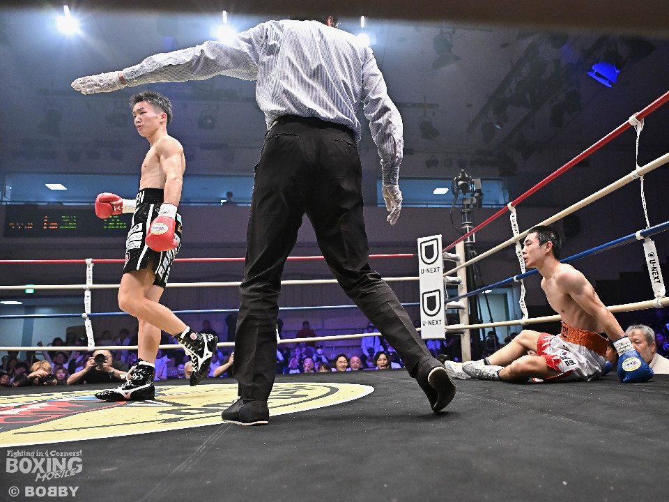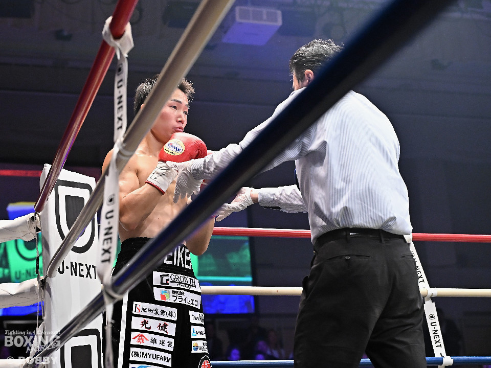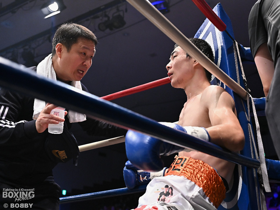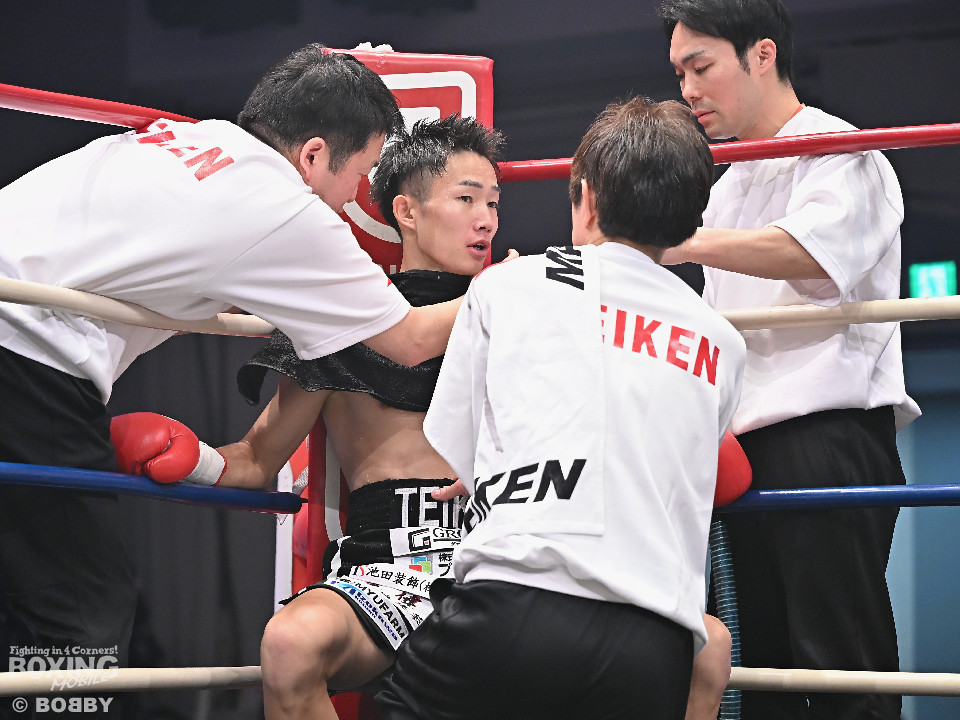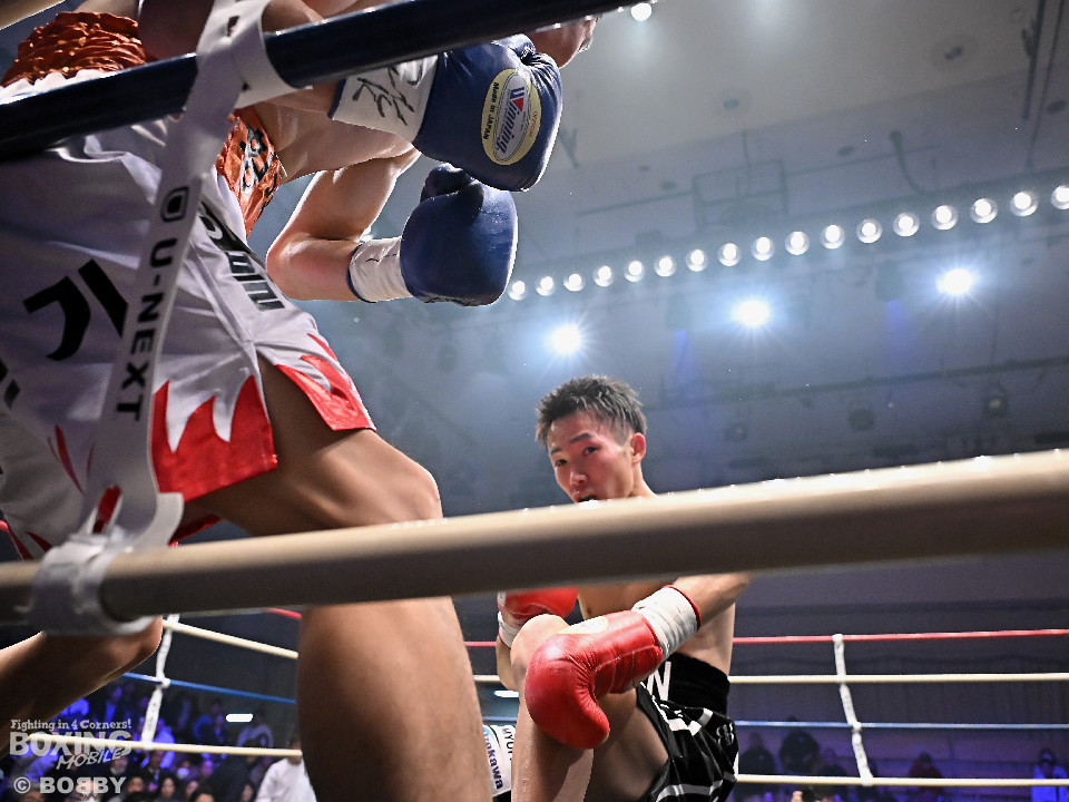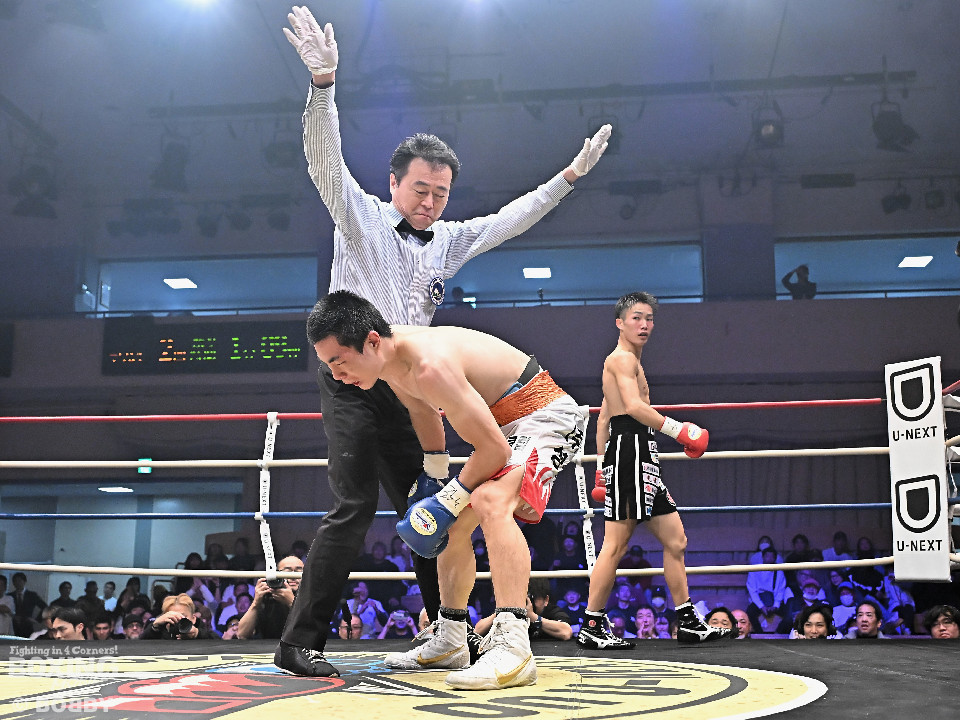試合:プロデビュー戦の浅井が韓国出身のファン・キョンミンと対決。右オーバーハンドと左右のボディを叩いて左フックの角度を変えて飛び込むキョンミンに対して、右から左フックを合わせた浅井がダウンを奪った。立ち上がったキョンミンをロープに押し込んで詰めに行った浅井だったが、左フックを合わされてダウンを奪われた。2回、右ストレートでロープに押し込んだ浅井が距離をとってリングの中央に戻ると左ボディを差し込んでレフェリーストップ。キョンミンは前のめりに耐えようとしたがレフェリーは試合を止めた。