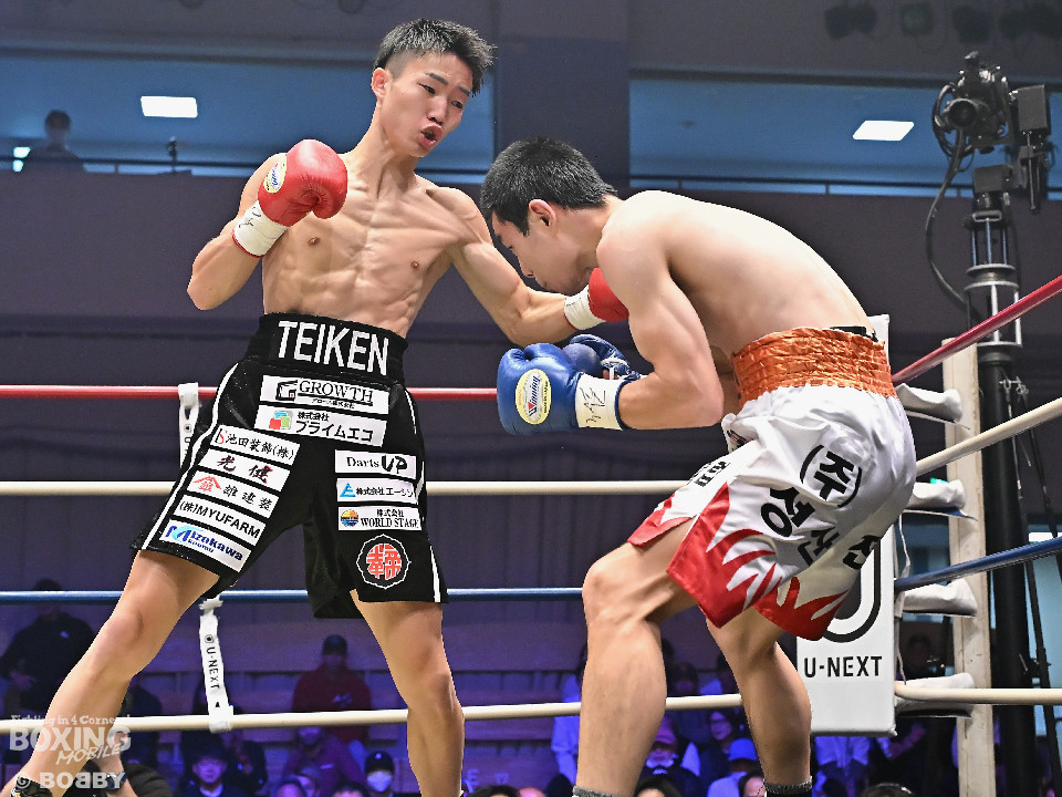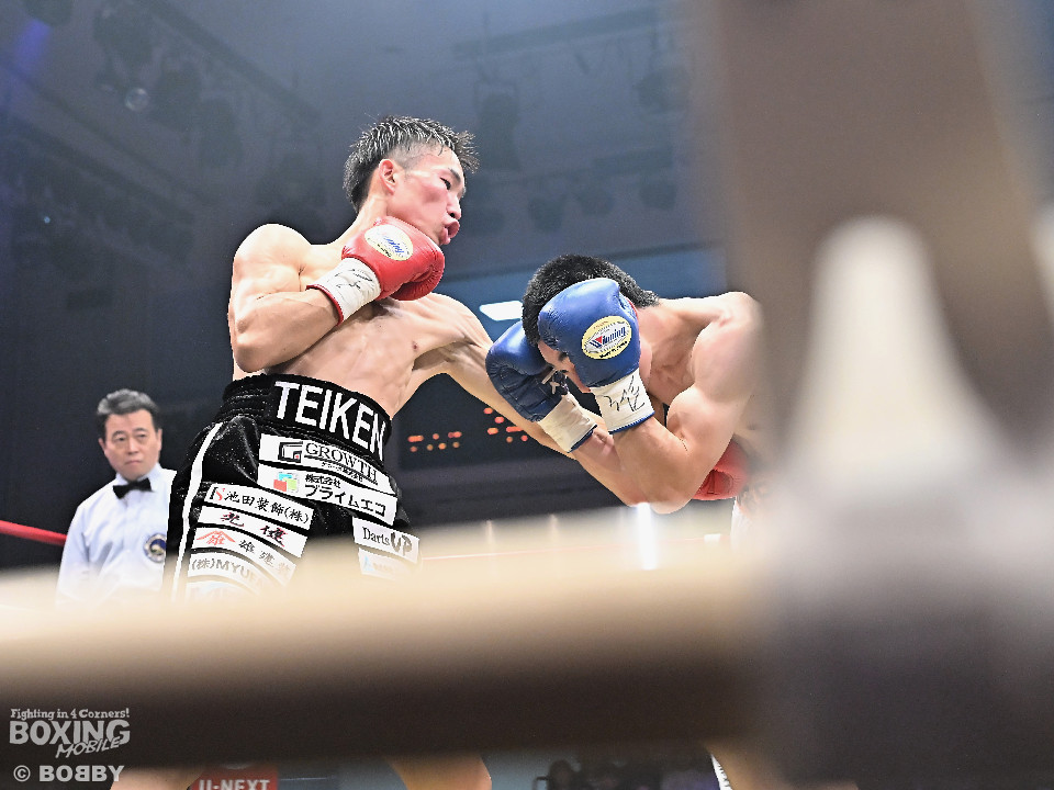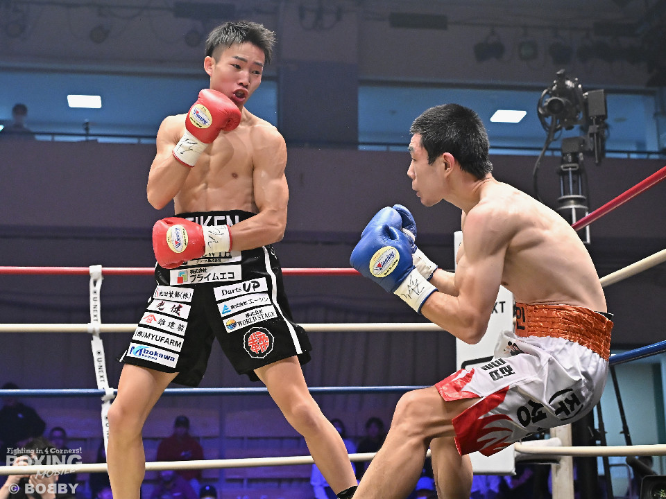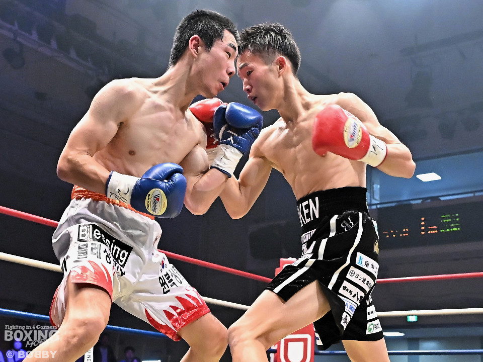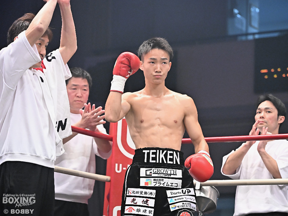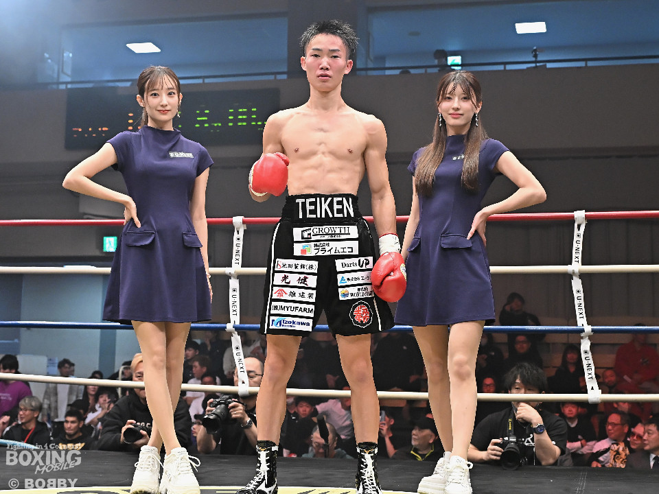 試合:プロデビュー戦の浅井が韓国出身のファン・キョンミンと対決。右オーバーハンドと左右のボディを叩いて左フックの角度を変えて飛び込むキョンミンに対して、右から左フックを合わせた浅井がダウンを奪った。立ち上がったキョンミンをロープに押し込んで詰めに行った浅井だったが、左フックを合わされてダウンを奪われた。2回、右ストレートでロープに押し込んだ浅井が距離をとってリングの中央に戻ると左ボディを差し込んでレフェリーストップ。キョンミンは前のめりに耐えようとしたがレフェリーは試合を止めた。