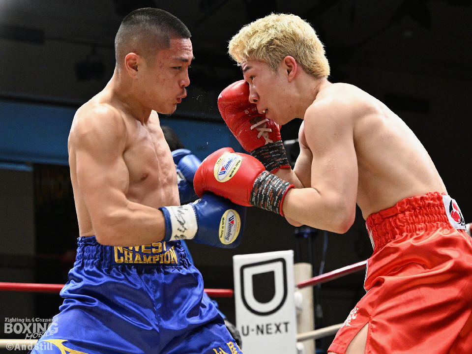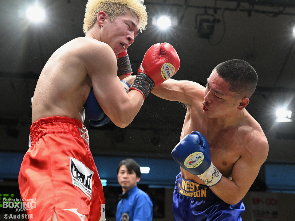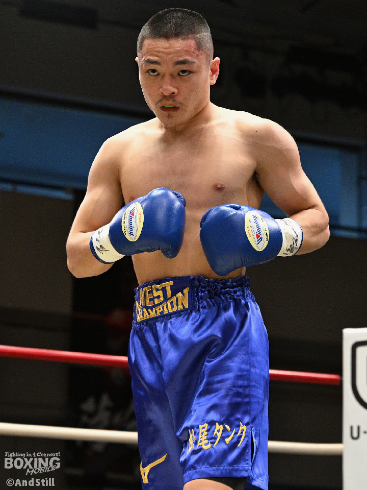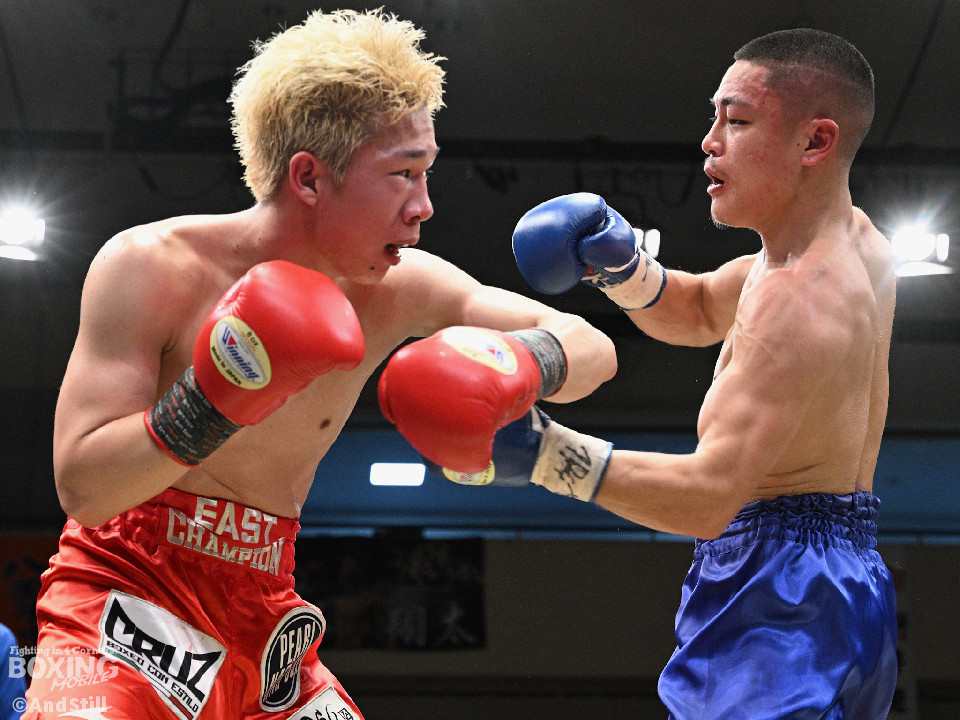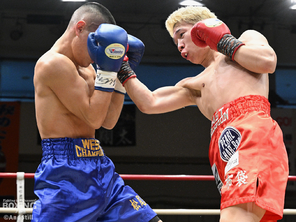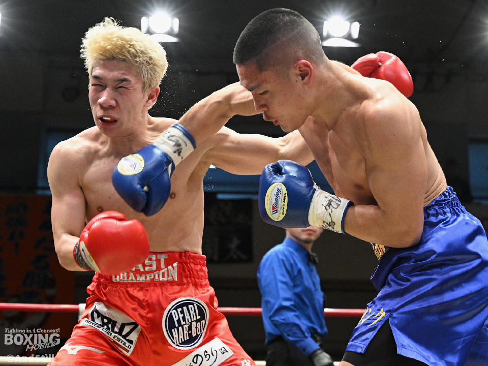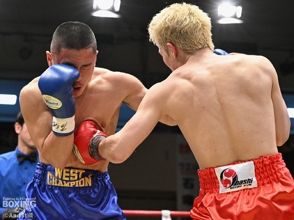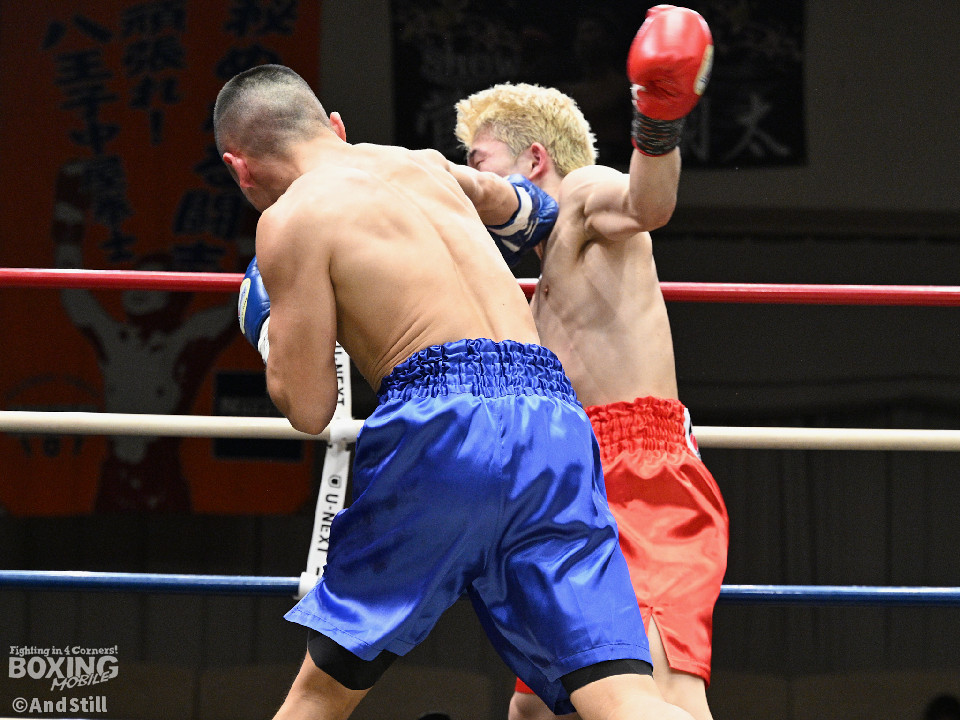 試合:松尾が鋭く踏み込み右ストレート、左ボディをヒットでアグレッシブな姿勢。2回、布袋はプッシュしながら左フックを叩きつけるが、松尾はバックステップからワンツーを好打。お互いに引かず激しいパンチの応酬。3回、松尾は右アッパー、右オーバーハンドで顔を弾くと頭のポジションを上手くずらして見栄えの良さをアピール。4回、至近距離で回転力を活かした打ち合い。松尾が左アッパーから右ストレートにつなげた。5回、松尾はワンツーで顔を弾くとパパっとまとめて攻勢をアピール。最後まで手数を出す布袋を振り切った。1~5ポイント差をつけた松尾が全日本新人王に輝いた。