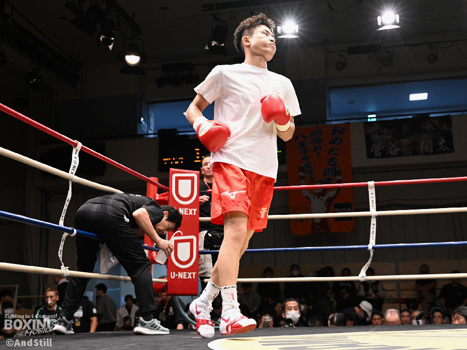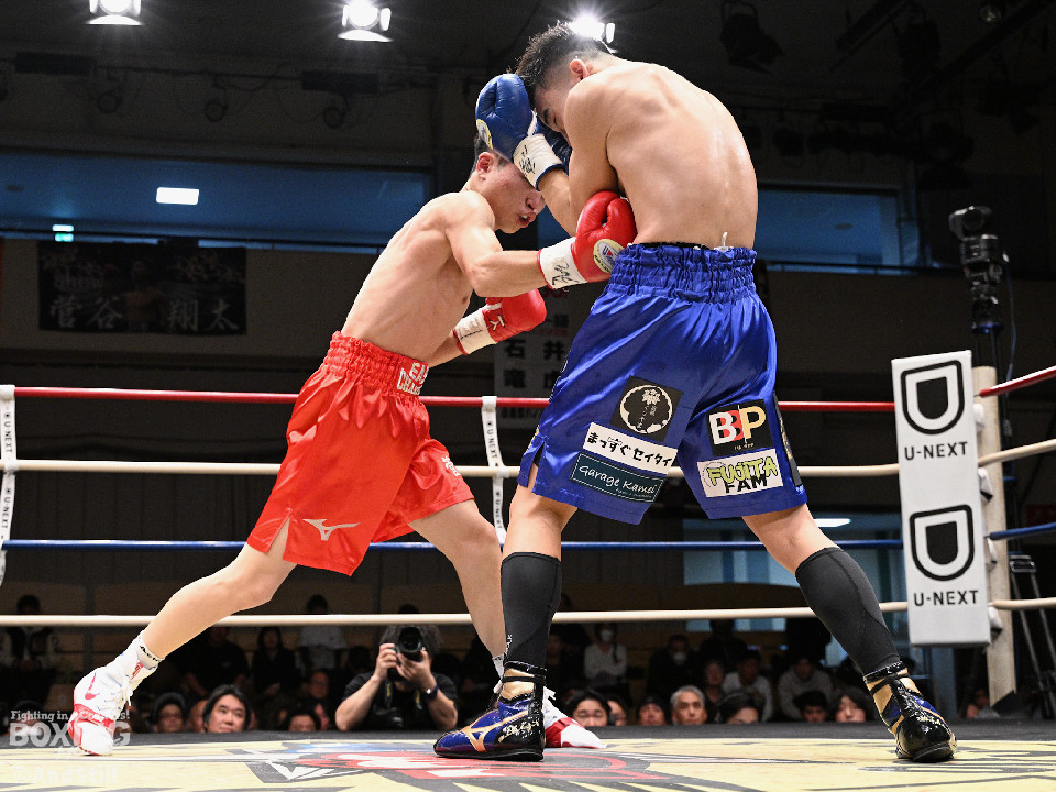 試合:光富がガッチリとガードを固めると左ボディを好打。菅谷はお構いなしとばかりに左右を繰り出し応戦。2回、菅谷が回転力を活かした連打で攻め立てると、光富も要所で左ボディをヒット。お互いが持ち味を出した総力戦が続いた。3回、光富は右ストレートで後退させるとボディにパンチを集めて優勢をアピール。4回、ギアを上げた菅谷はプッシュしながら豊富な手数で攻め立てる。光富は我慢強く左ボディを返した。5回、光富はワンツーと叩き込むとスパート。倍返しする相手に対し有効打で上回った。激戦を制した光富が勝利した。