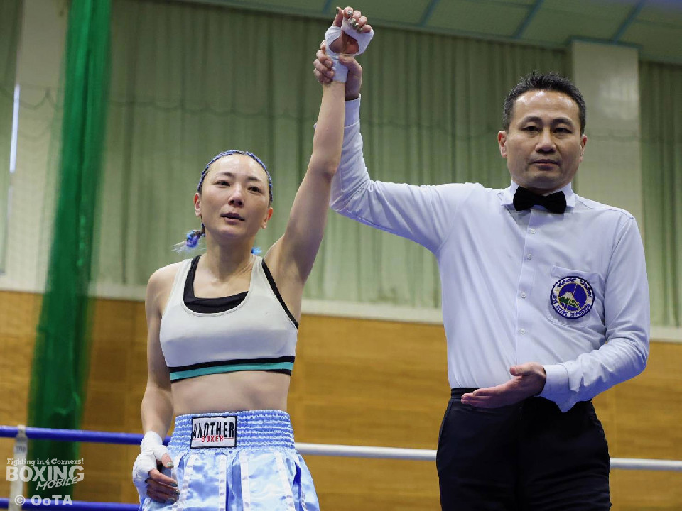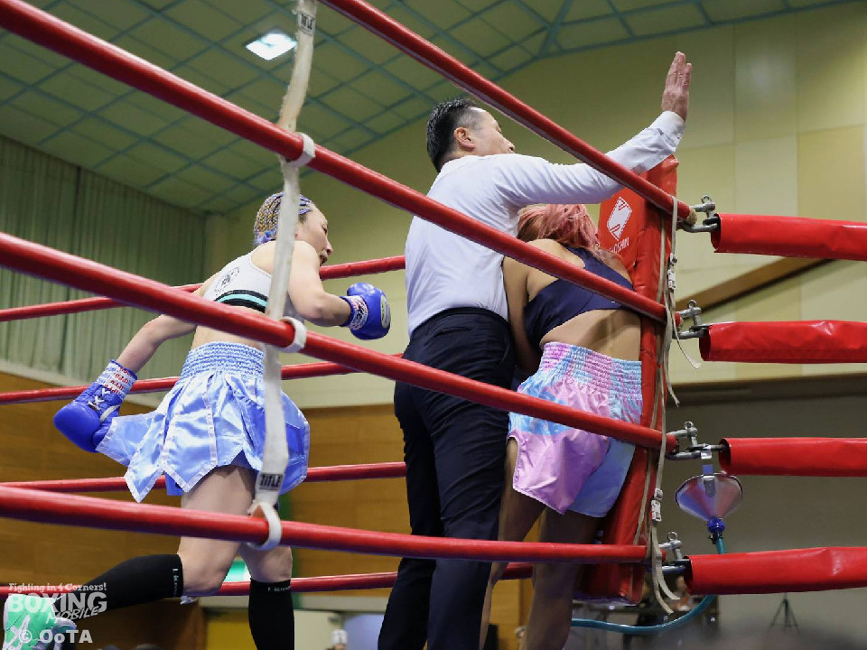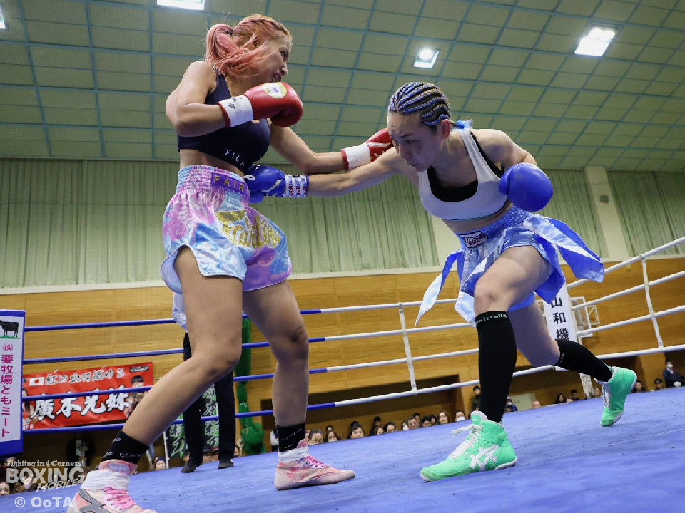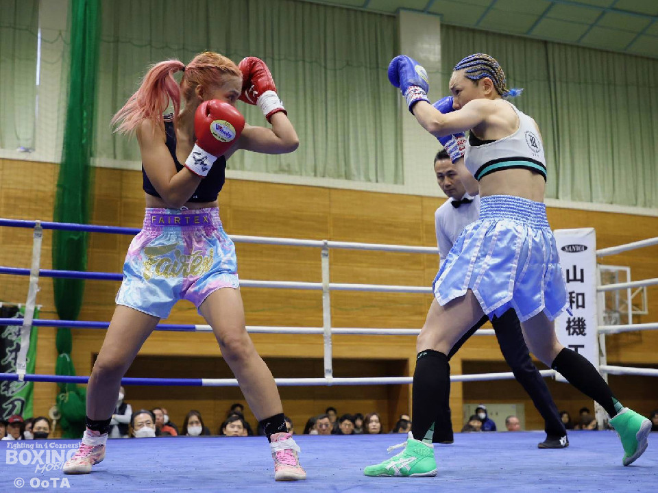 試合:葉月がプレッシャーをかけて距離を支配。インファイトで左フックを好打した。2回、掴みどころのないペースで撹乱をかけるポーンピモンに対し、葉月は下から上へのコンビネーションで着実にポインティング。3回、ついに距離をアジャストした葉月が波状攻撃でたたみかけた。続く4回、葉月が一気に攻め立てポーンピモンを防戦一方にした所でレフェリーストップを呼び込んだ。