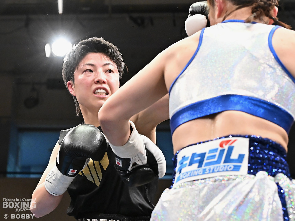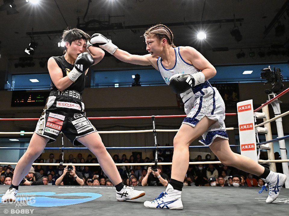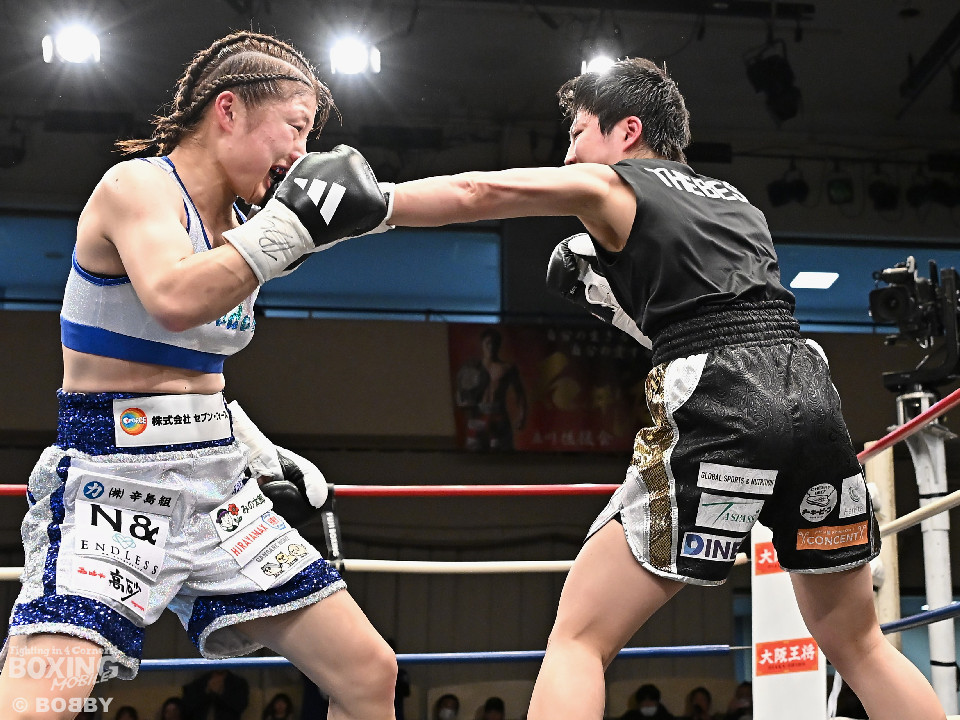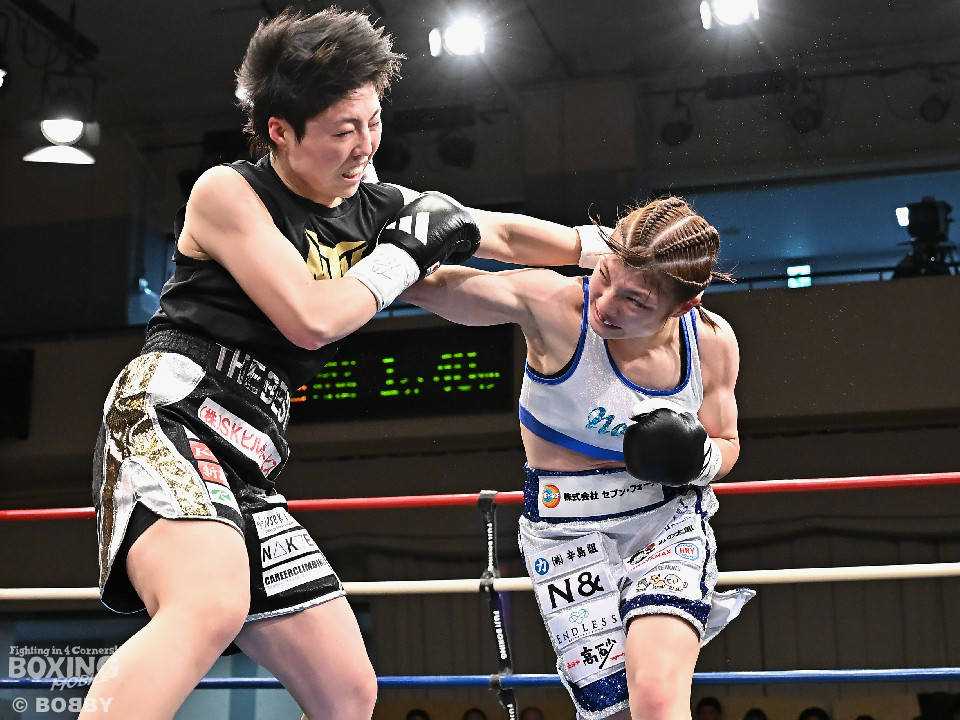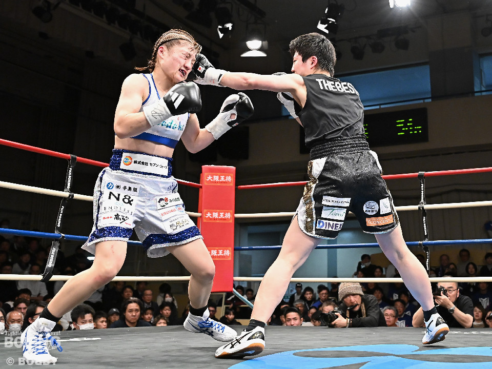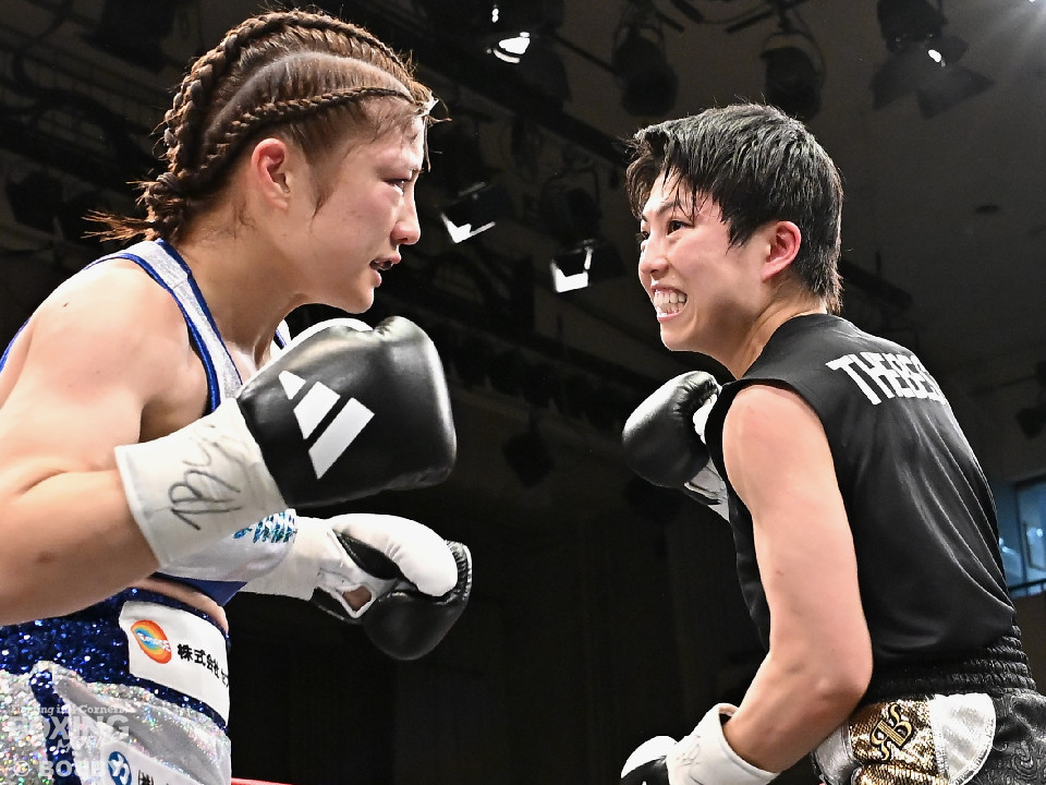 試合;日本女子バンタム級王者の山下が古川を迎え撃ち、ダイレクトリマッチに臨んだ。古川が距離を詰めてワンツーで先手を奪いに行く。ブロックした山下だがやや動きが硬いか。2回、山下はプレスをかけてワンツーを軸にアグレッシブな姿勢。3回、お互いの意地が真っ向から激突。山下の有効打が上回った印象。4回、古川はサイドに揺さぶりをかけながらジャブを多用。5回、山下は右フックをねじ込むと圧力を強めて積極性をアピール。6回、古川はプッシュしながら左ボディを叩きつけると気持ちを前面に押し出したファイトを展開。山下もここは引かずペースを渡さなかった。返り討ちを果たした山下が、初防衛に成功した。