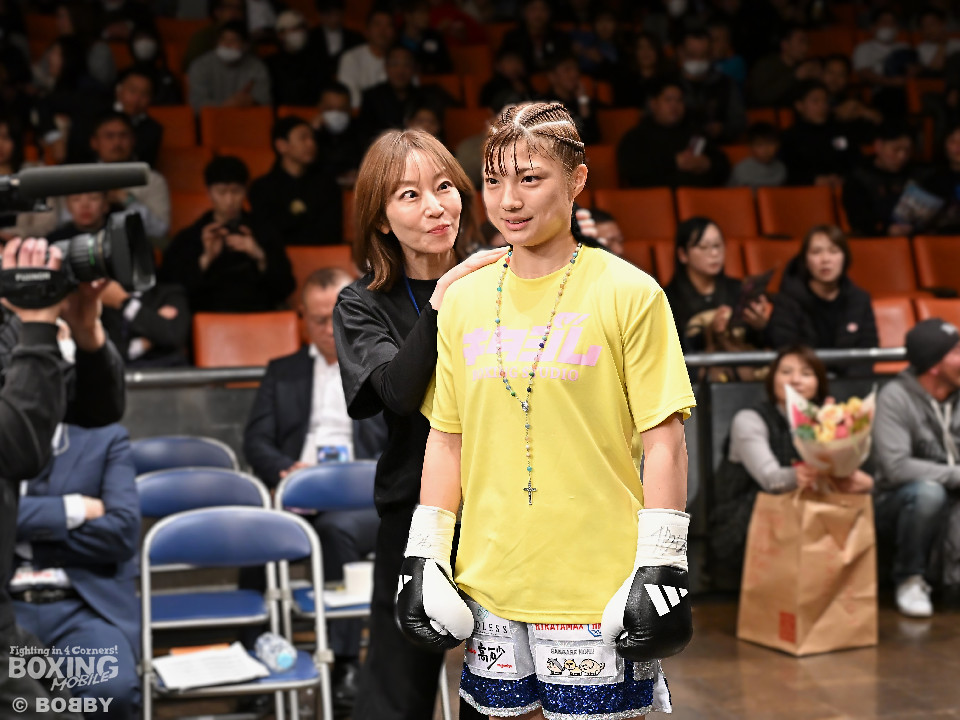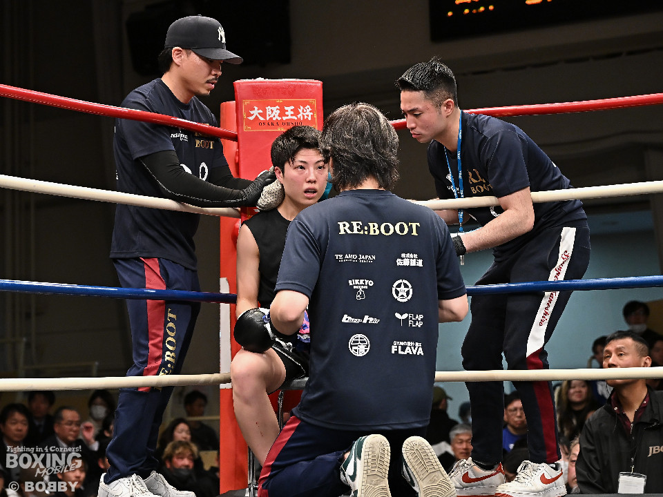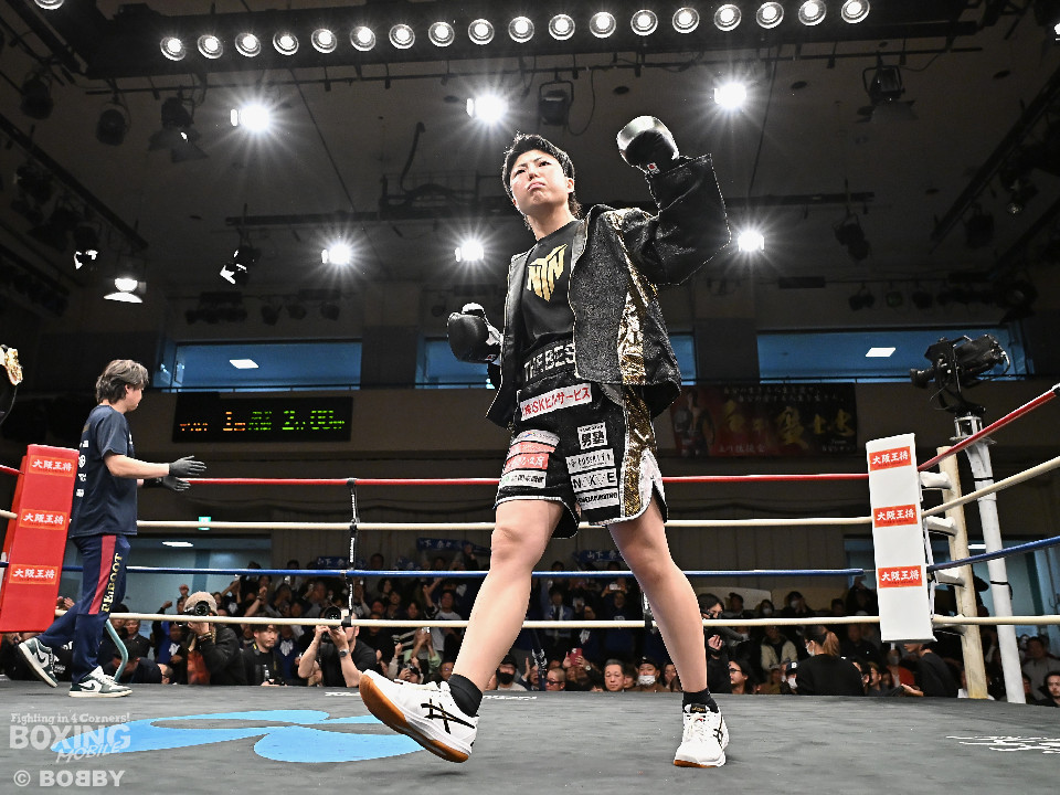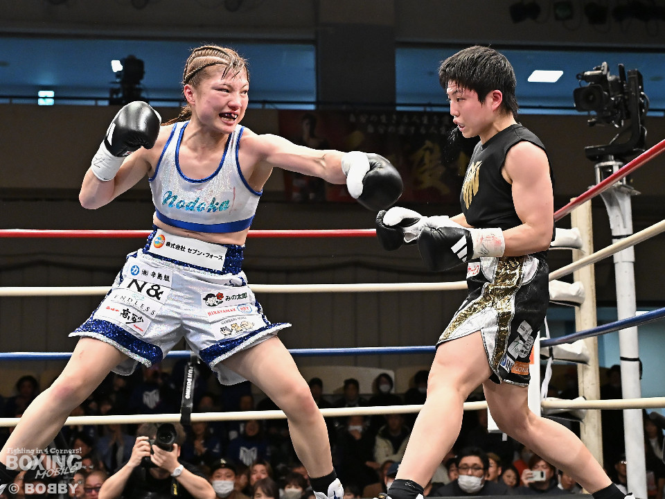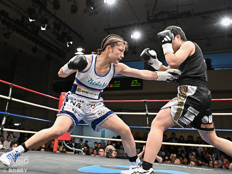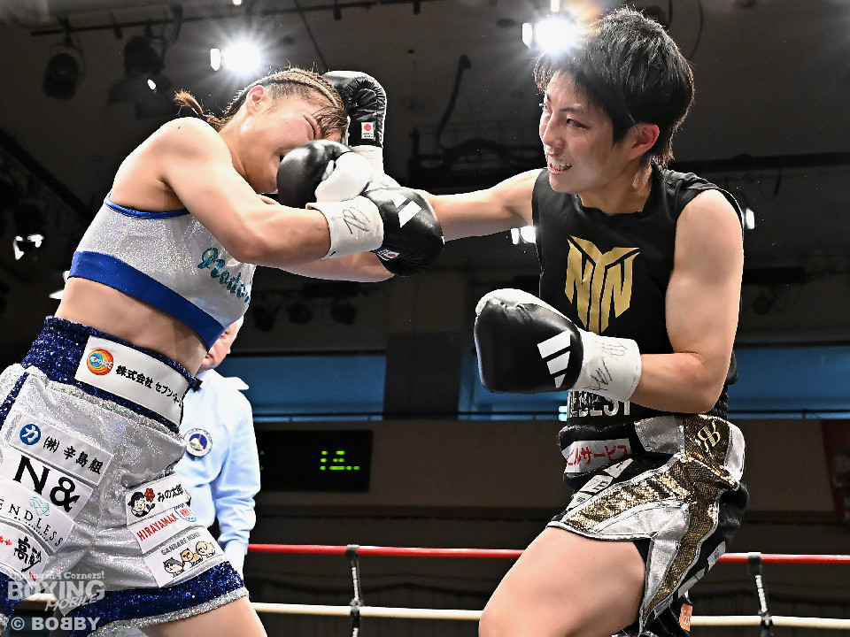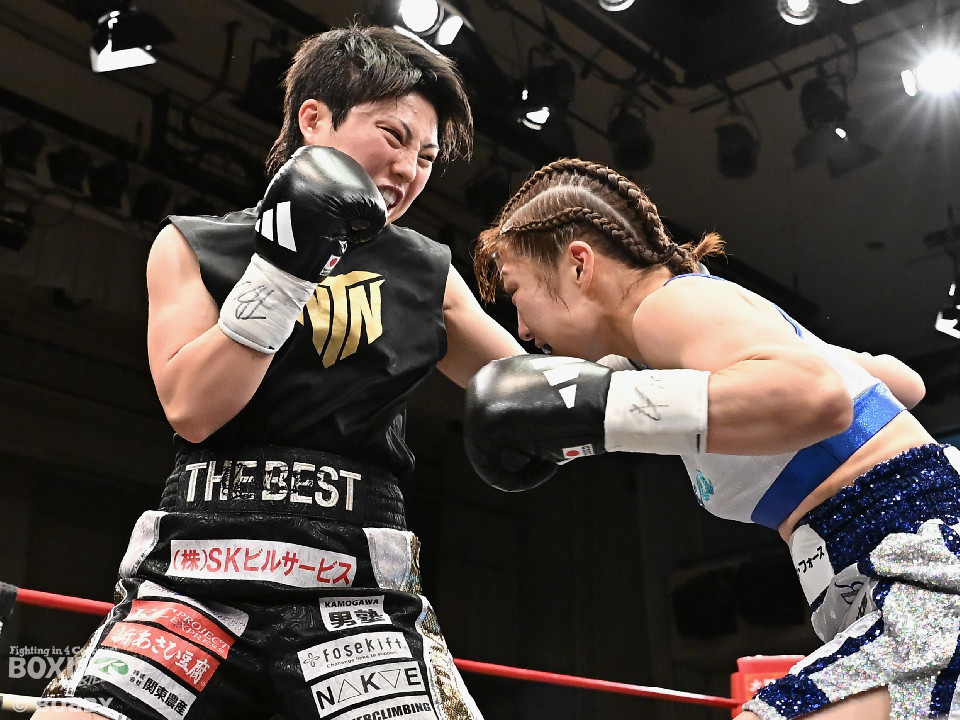 試合;日本女子バンタム級王者の山下が古川を迎え撃ち、ダイレクトリマッチに臨んだ。古川が距離を詰めてワンツーで先手を奪いに行く。ブロックした山下だがやや動きが硬いか。2回、山下はプレスをかけてワンツーを軸にアグレッシブな姿勢。3回、お互いの意地が真っ向から激突。山下の有効打が上回った印象。4回、古川はサイドに揺さぶりをかけながらジャブを多用。5回、山下は右フックをねじ込むと圧力を強めて積極性をアピール。6回、古川はプッシュしながら左ボディを叩きつけると気持ちを前面に押し出したファイトを展開。山下もここは引かずペースを渡さなかった。返り討ちを果たした山下が、初防衛に成功した。