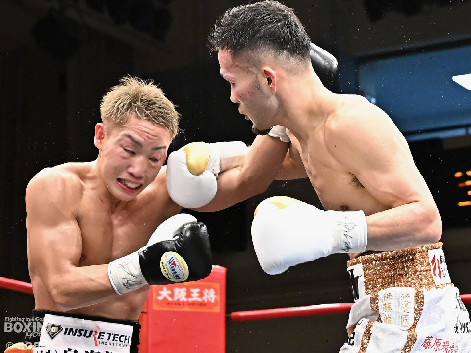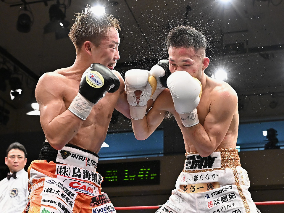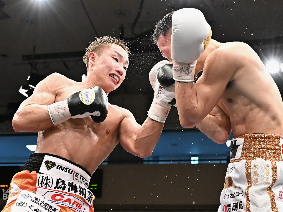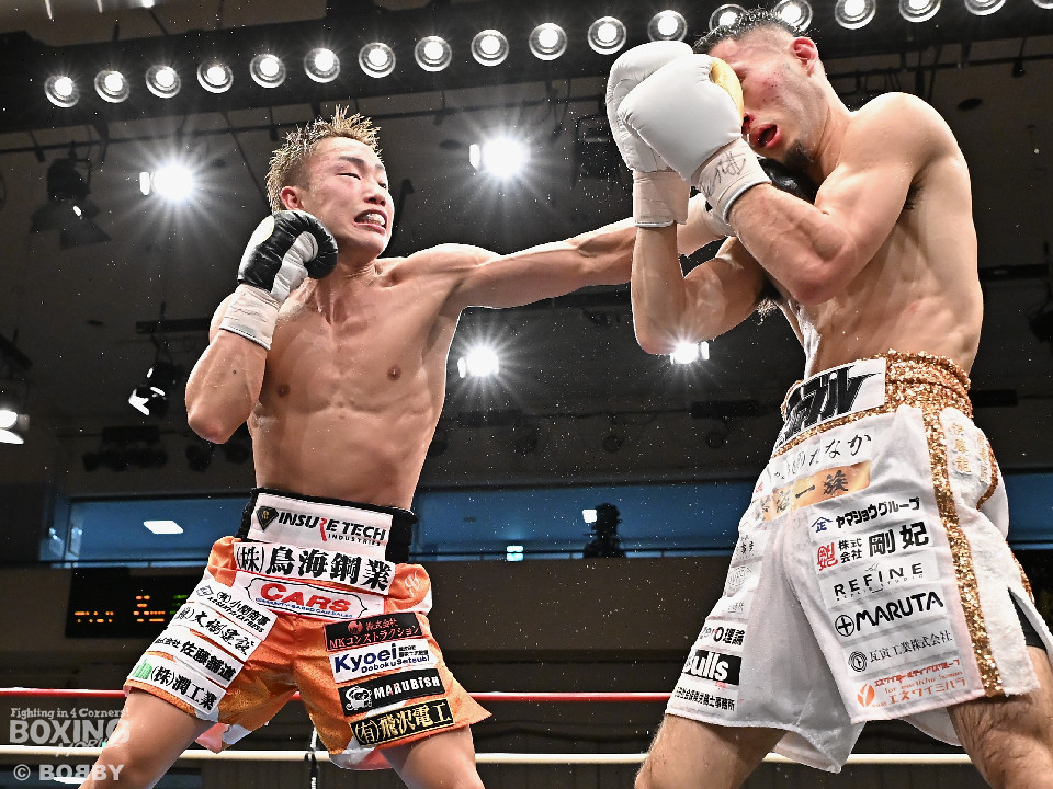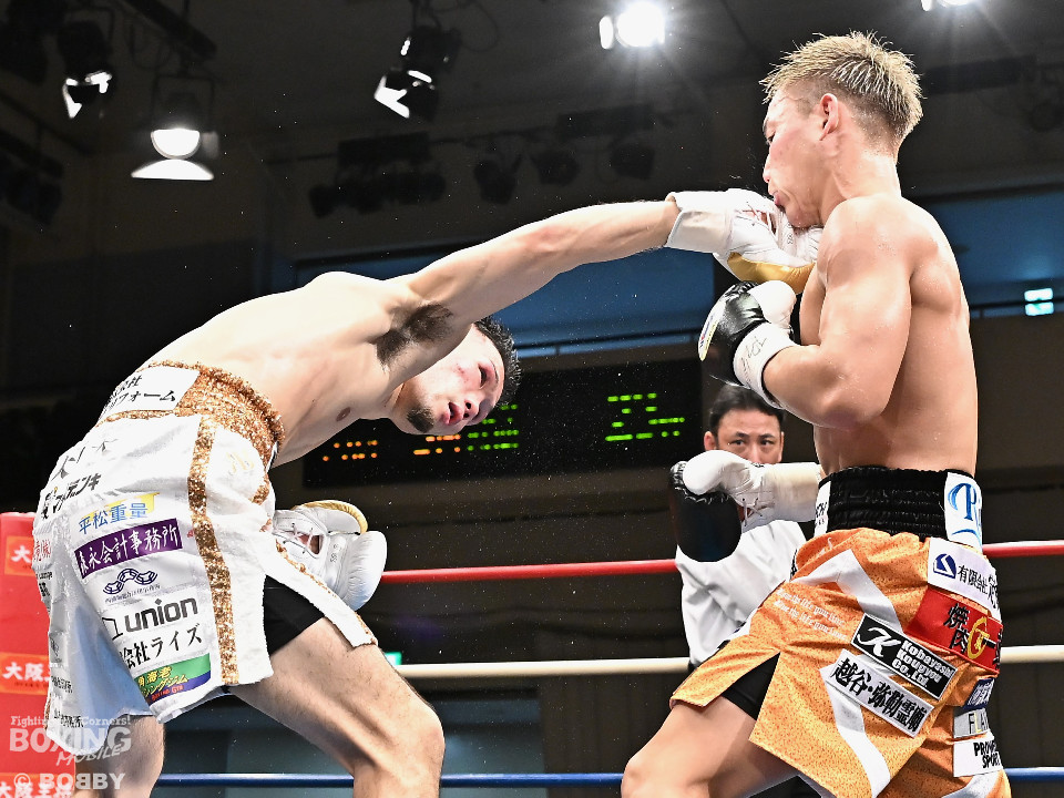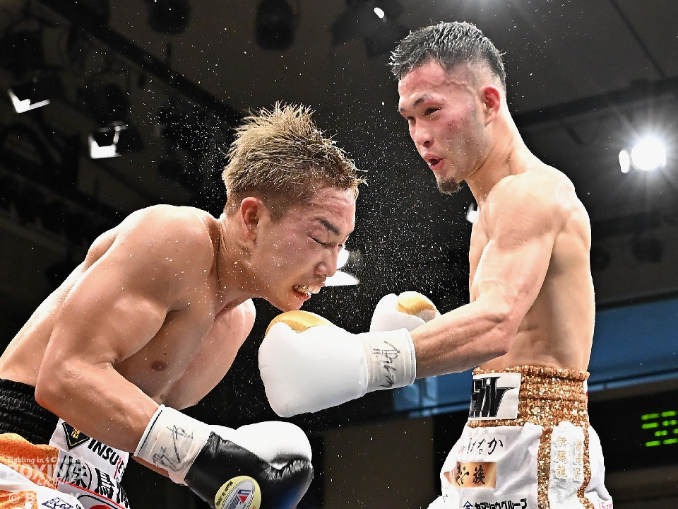 試合:日本スーパーバンタム級王者の石井が最強挑戦者の池側を迎え撃ち2度目の防戦に臨んだ。3度目の対決(過去、石井の1勝1分)は、サウスポー池側が左アッパーで顔を弾き先制攻撃。上々のスタートを切った。2回、石井はプレスを強めて左ボディを突き刺すと回転力を上げて反撃。池側はヒッティングで右目上をカットした。3回、頭をつけてショートパンチの応酬、石井の回転力が上回った印象。4回、石井はワンツーで顔を弾くと上下に打ち分け攻勢をアピール。池側は相手の圧力に対し、我慢強く返した。5回、石井の馬力がさらに加速。グイグイと攻め立てた。壮絶な打撃戦に会場は大興奮!前半終了時の公開採点は48-47×2、49-49×1で石井がリード。6回、石井はワンツーでバランスを崩させるとボディに散らしてダメージを与えた。苦しくなった池側だが、気持ちを切らさず左右アッパーで執念を見せた。7回、石井はこれでもかとワンツー、左ボディを叩き仕留めに行くが、池側もこの試合に懸ける思いの強さを見せた。8回、池側は鎌を振るような右アッパーを再三ヒットし肉薄。9回、池側は右アッパーを振り抜き起死回生のダウンを奪取。再開後、ダメージが残る石井に迫ると左アッパーで倒してレフェリーストップに持ち込んだ。池側が逆転KO勝ちで新チャンピオンに輝いた。ダメージが深い石井は担架に運ばれた。