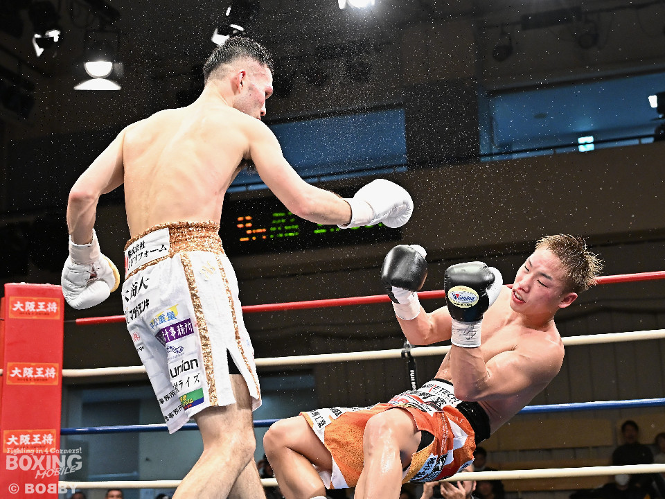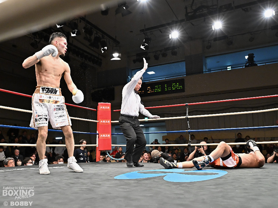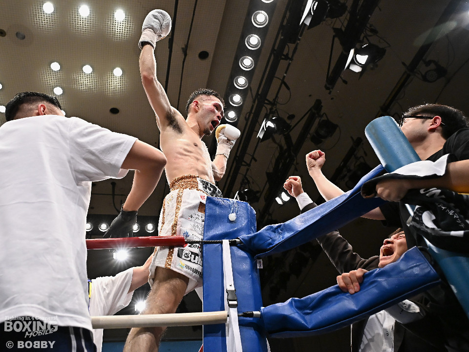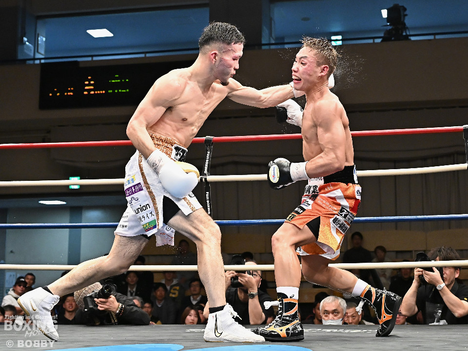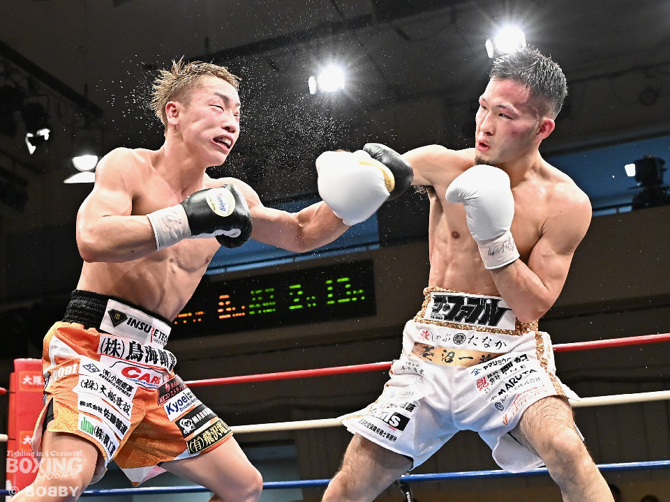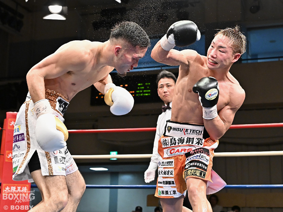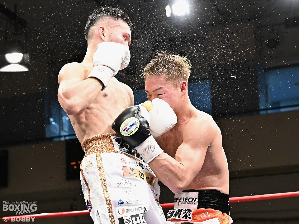 試合:日本スーパーバンタム級王者の石井が最強挑戦者の池側を迎え撃ち2度目の防戦に臨んだ。3度目の対決(過去、石井の1勝1分)は、サウスポー池側が左アッパーで顔を弾き先制攻撃。上々のスタートを切った。2回、石井はプレスを強めて左ボディを突き刺すと回転力を上げて反撃。池側はヒッティングで右目上をカットした。3回、頭をつけてショートパンチの応酬、石井の回転力が上回った印象。4回、石井はワンツーで顔を弾くと上下に打ち分け攻勢をアピール。池側は相手の圧力に対し、我慢強く返した。5回、石井の馬力がさらに加速。グイグイと攻め立てた。壮絶な打撃戦に会場は大興奮!前半終了時の公開採点は48-47×2、49-49×1で石井がリード。6回、石井はワンツーでバランスを崩させるとボディに散らしてダメージを与えた。苦しくなった池側だが、気持ちを切らさず左右アッパーで執念を見せた。7回、石井はこれでもかとワンツー、左ボディを叩き仕留めに行くが、池側もこの試合に懸ける思いの強さを見せた。8回、池側は鎌を振るような右アッパーを再三ヒットし肉薄。9回、池側は右アッパーを振り抜き起死回生のダウンを奪取。再開後、ダメージが残る石井に迫ると左アッパーで倒してレフェリーストップに持ち込んだ。池側が逆転KO勝ちで新チャンピオンに輝いた。ダメージが深い石井は担架に運ばれた。