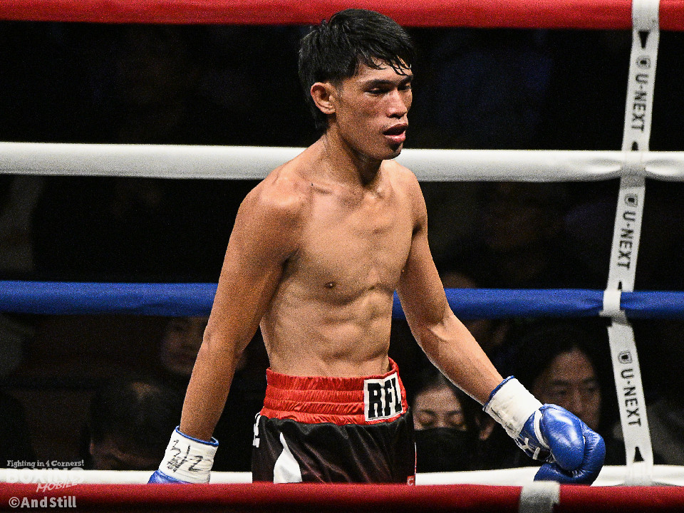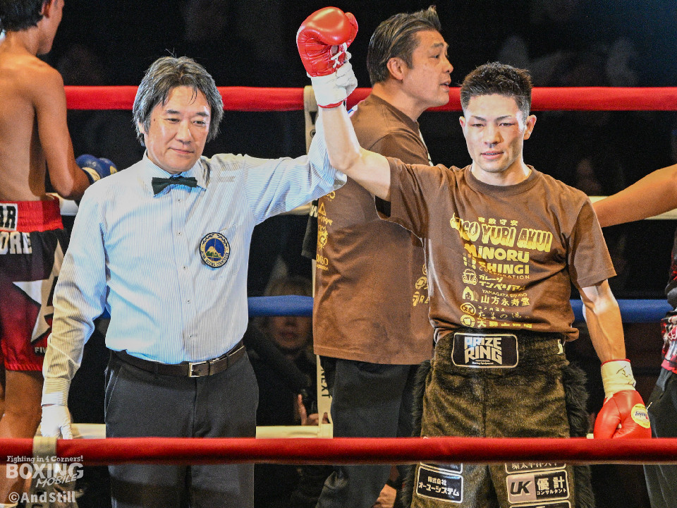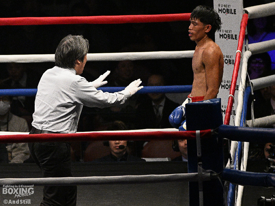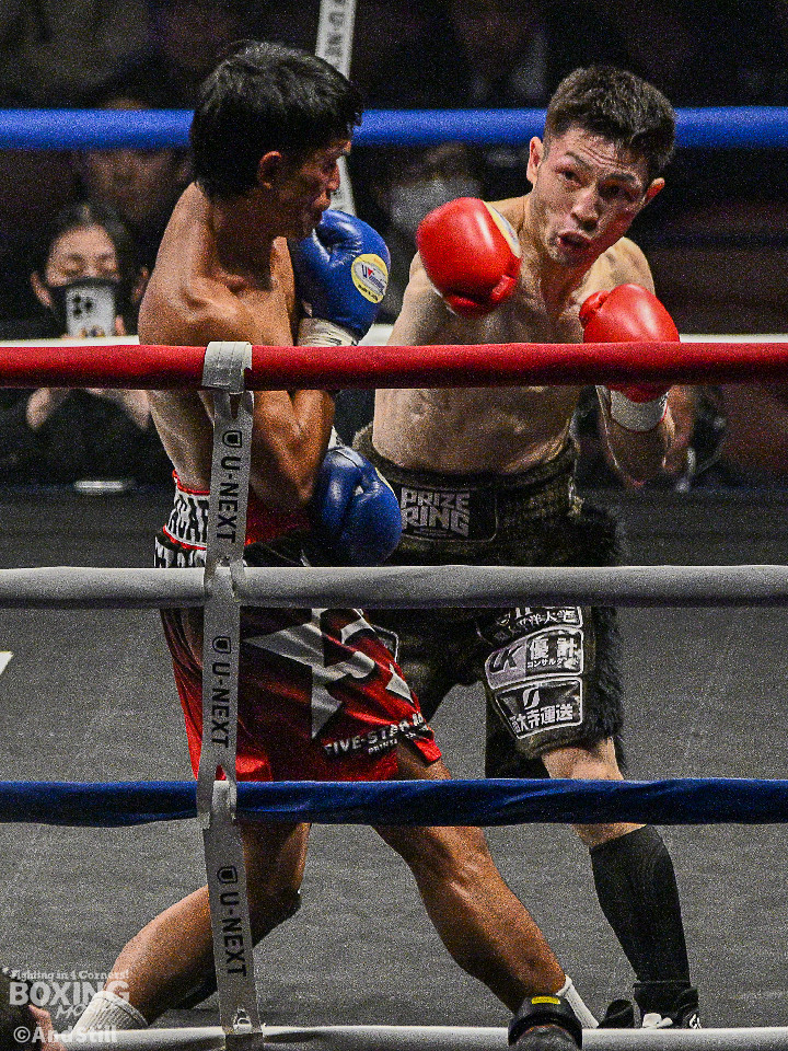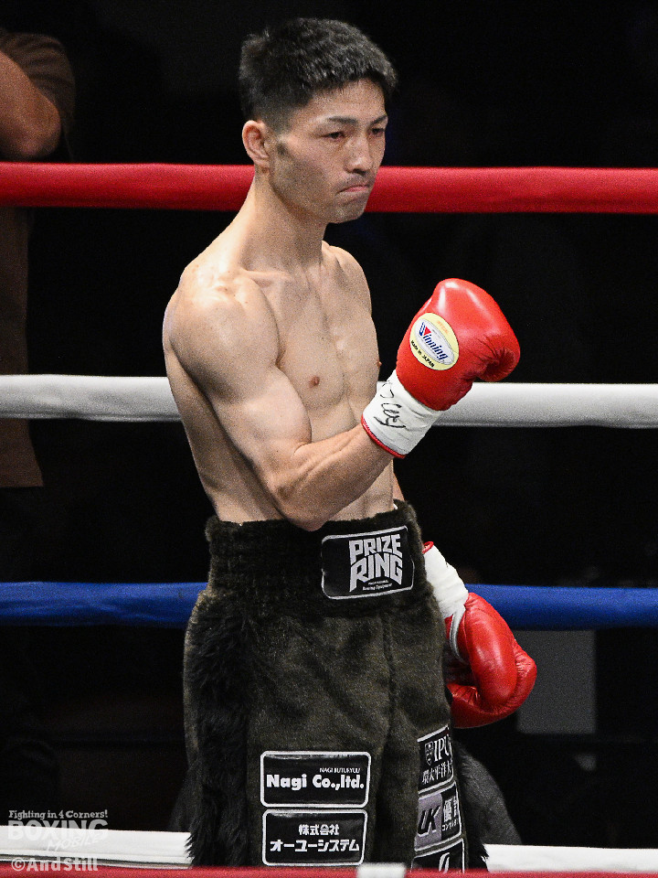 試合:元WBA世界フライ級王者の阿久井が今年3月の王座統一戦以来の再起戦に臨んだ。拳を交えたのは元WBOオリエンタル王者のラカール。阿久井がガードを固めながらジャブでプレスをかけるとワンツーで顔を弾き先制。2回、阿久井は相手の右を巧みにブロックすると右ボディストレートを痛打。プレスをかけてジワリジワリと攻め立てた。勝負が決まったのは3回。阿久井は右ストレートでグラつかせると左フックをフォローしてダウンを奪取。立ち上ったラカールだったがレフェリーは10カウントを数え上げた。圧巻のパフォーマンスを見せた阿久井が完全復活を遂げた。
