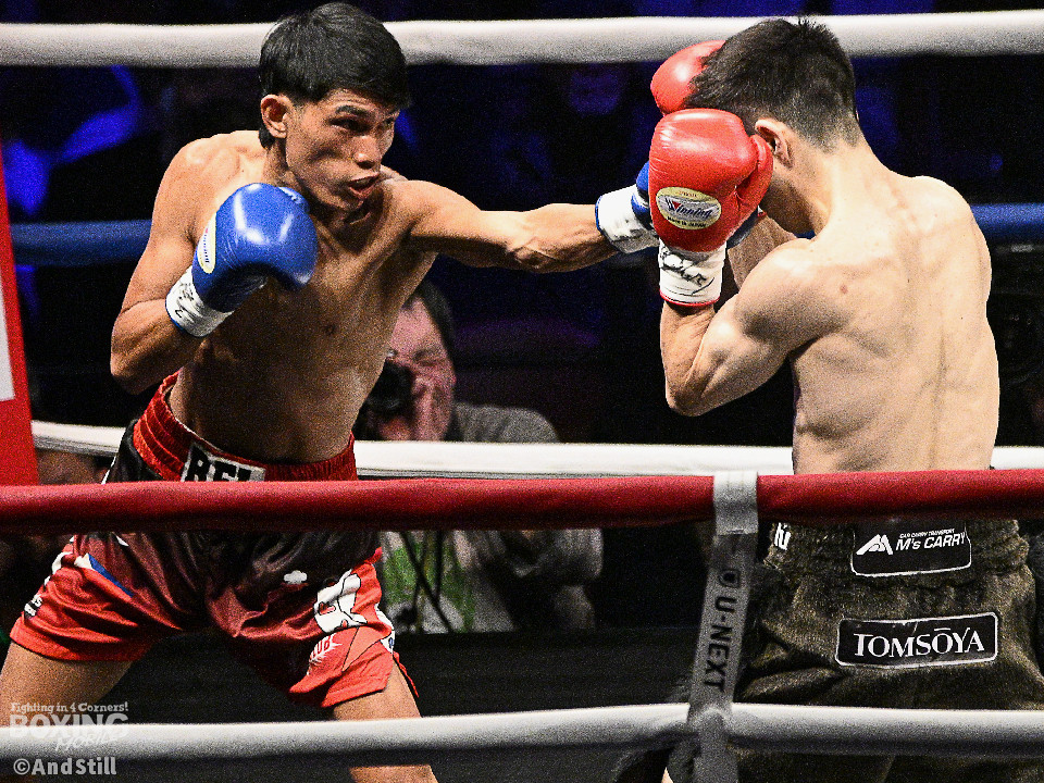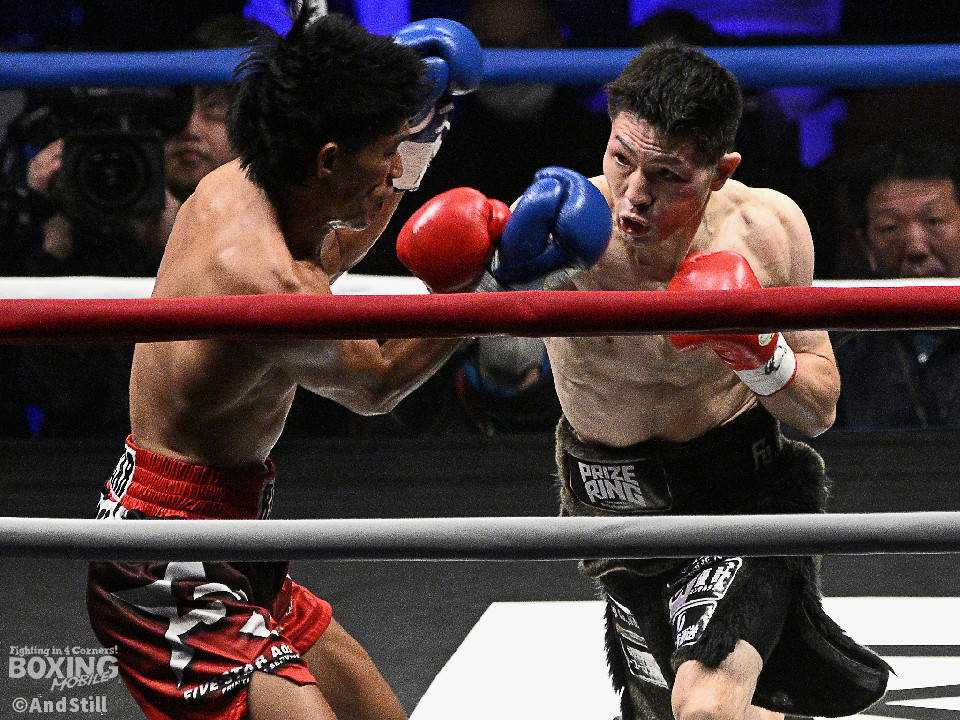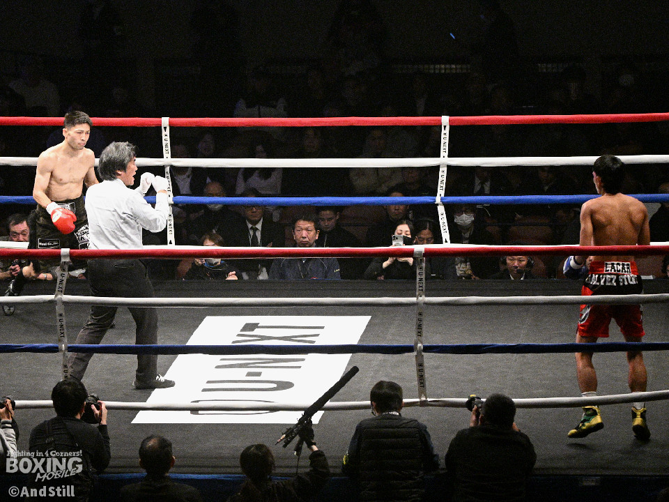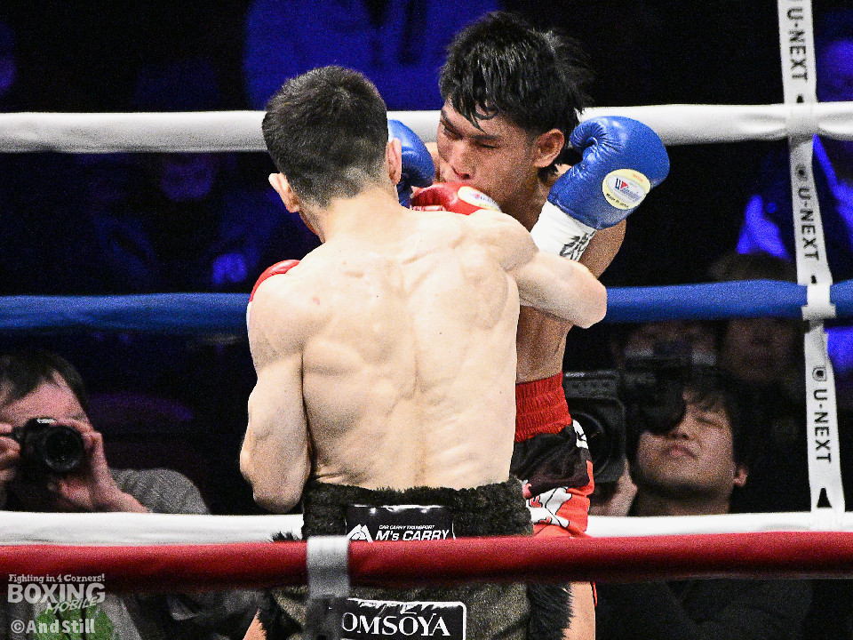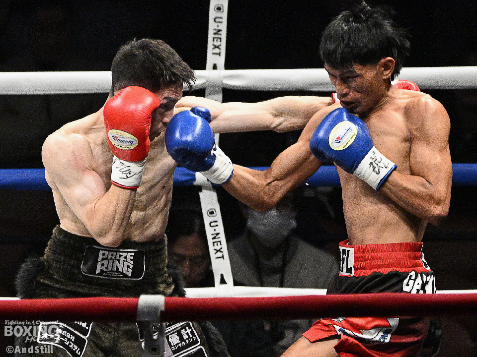 試合:元WBA世界フライ級王者の阿久井が今年3月の王座統一戦以来の再起戦に臨んだ。拳を交えたのは元WBOオリエンタル王者のラカール。阿久井がガードを固めながらジャブでプレスをかけるとワンツーで顔を弾き先制。2回、阿久井は相手の右を巧みにブロックすると右ボディストレートを痛打。プレスをかけてジワリジワリと攻め立てた。勝負が決まったのは3回。阿久井は右ストレートでグラつかせると左フックをフォローしてダウンを奪取。立ち上ったラカールだったがレフェリーは10カウントを数え上げた。圧巻のパフォーマンスを見せた阿久井が完全復活を遂げた。