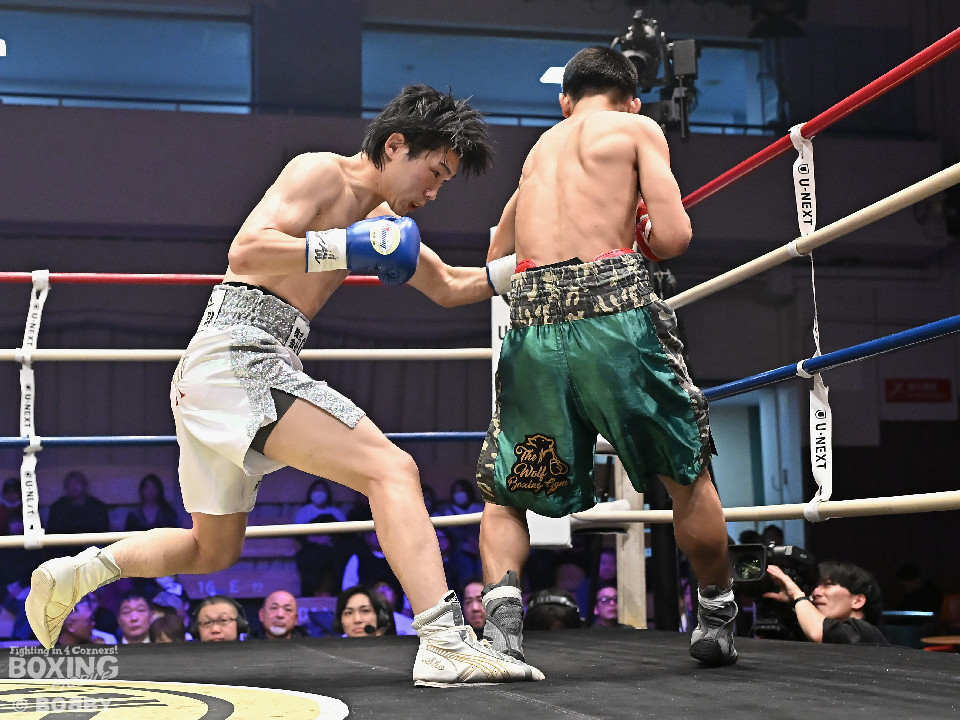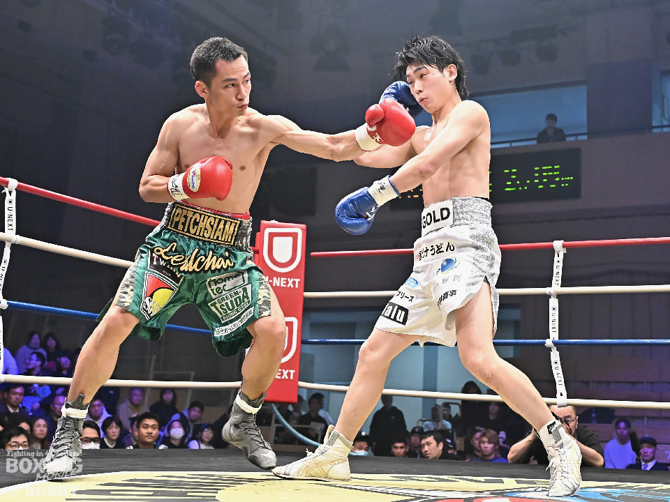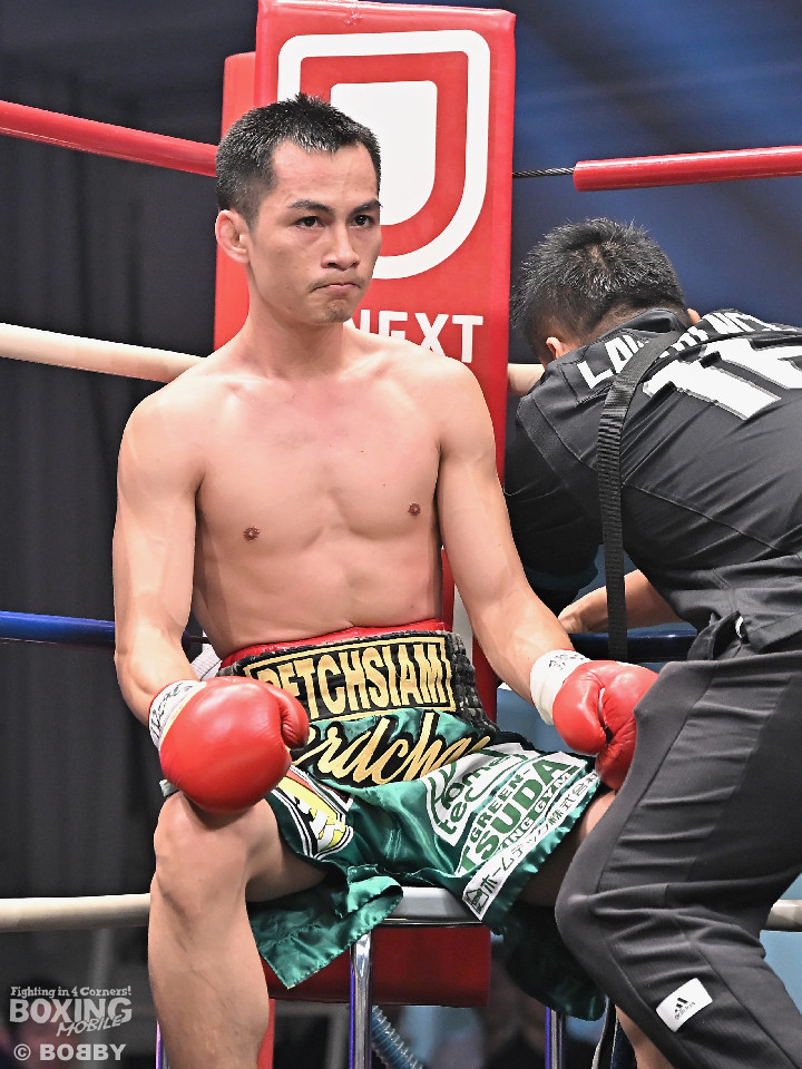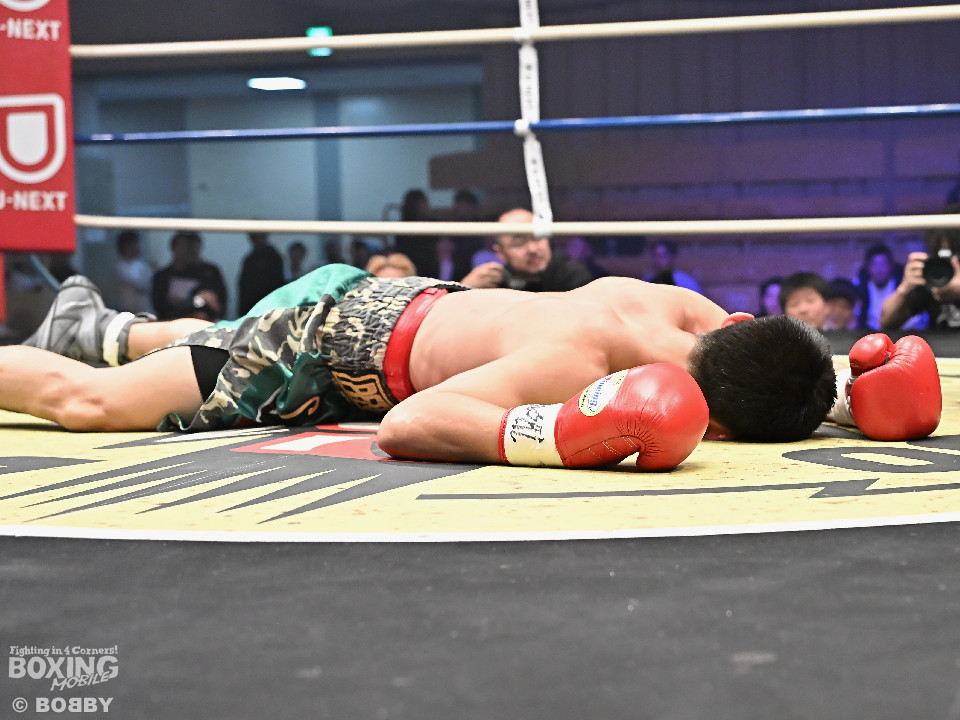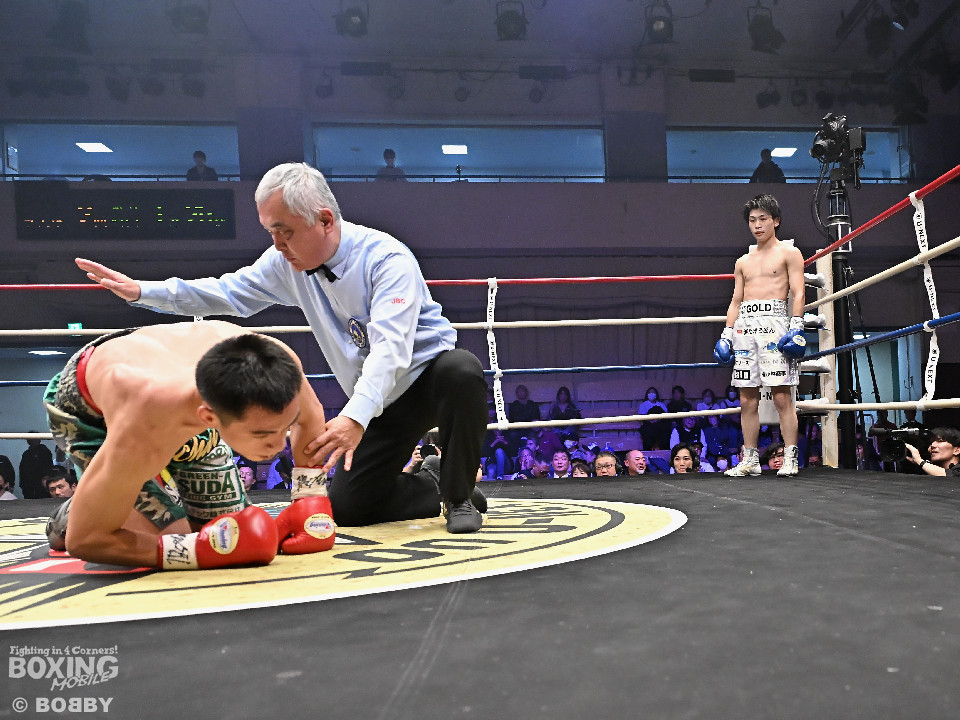 試合:タイ出身のデンチャイと日本フライ級現役王者のサウスポーの野上の対決。ジャブを突きながら距離を詰めた野上が徐々にプレスを強めた。2回、野上が距離を半分詰めると、左ボディからの右フックでダウンを奪うと、レフェリーは間髪入れずに試合を止めた。