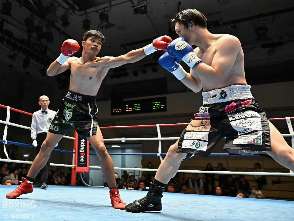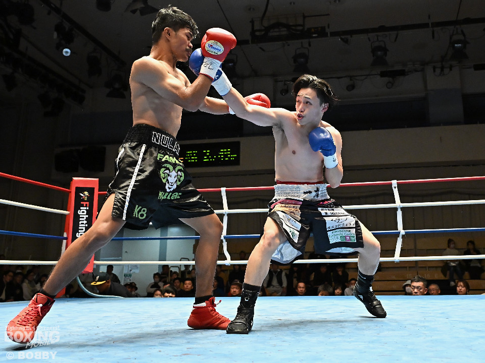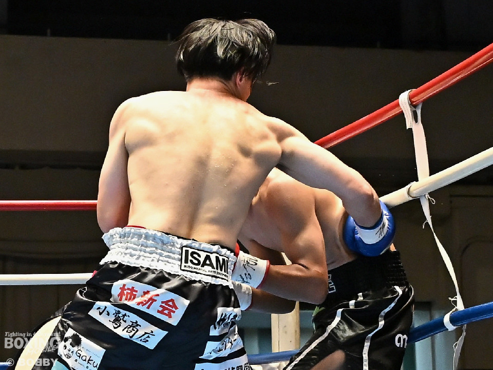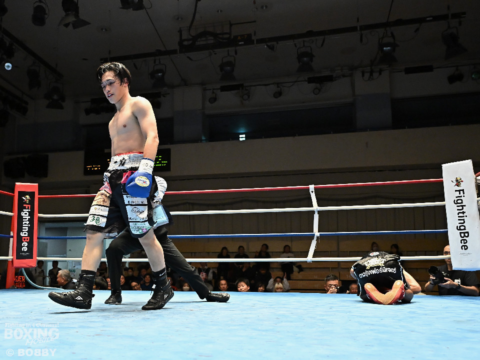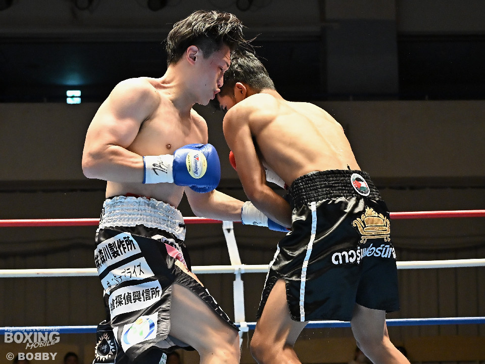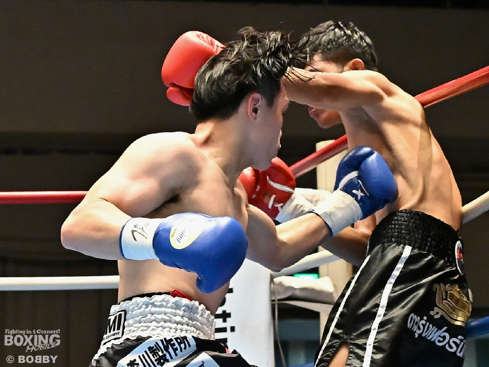 試合:サウスポー矢代が前の手で距離を測りながら左ストレートをヒット。2回、矢代は左ボディアッパーを突き刺すと返しの右をバックステップで回避。しかし、ソンムサックも頭から突っ込みながら右ストレートを返した。3回、矢代はこれでもかと左ボディアッパーを決めると、カウンターの左ボディアッパーで痛烈なダウンを奪取。ソンムサックは苦悶の表情を浮かべたまま10カウントを聞いた。矢代が約2年3ヶ月ぶりの復帰戦を勝利した。