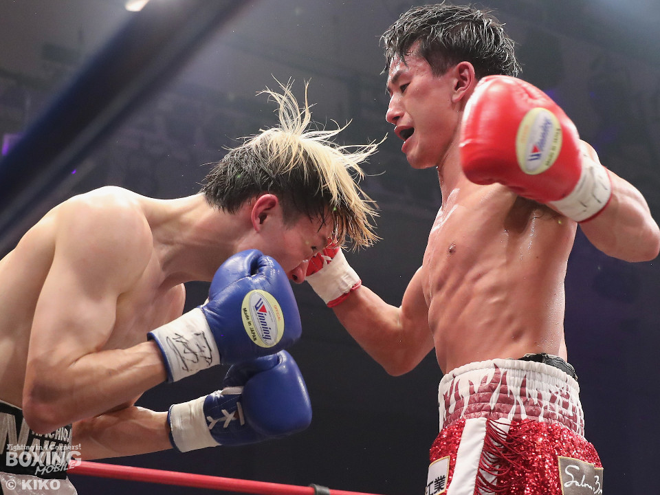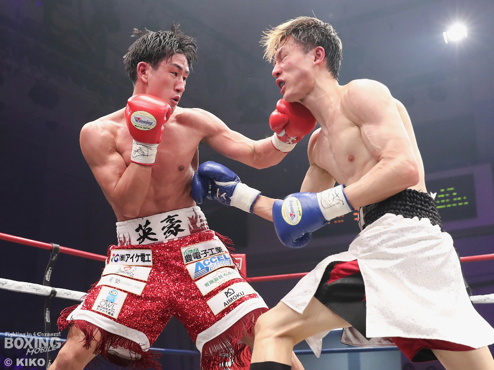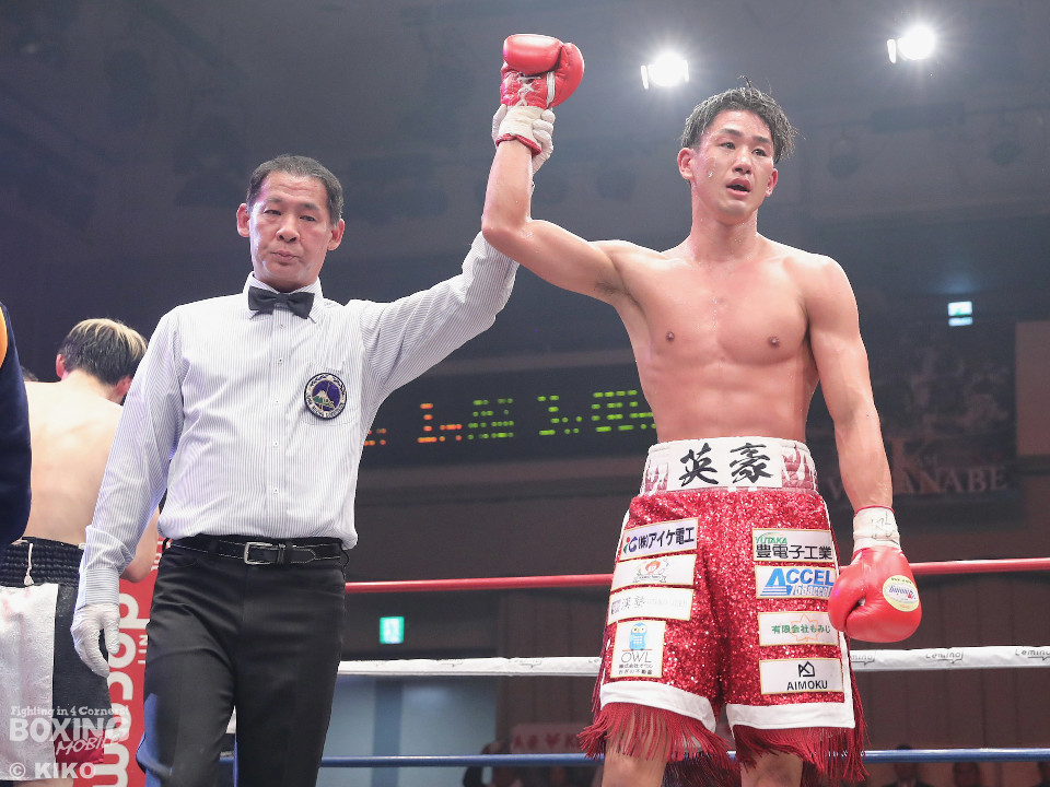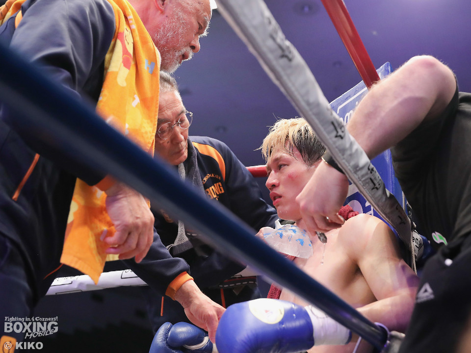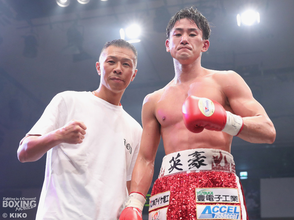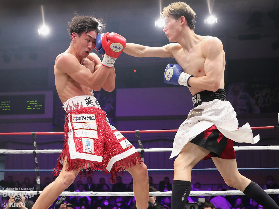 試合:優勝賞金1000万円をかけたスーパーフェザー級トーナメント1回戦、内山高志氏が会長を務めるKOD所属の英豪と4年4ヶ月ぶりにカムバックした牛島が拳を交えた。会場がピーンと張り詰める中、牛島が右クロスをねじ込むのに対し、英豪はリターンの左フックで応戦。中間距離で神経戦を展開。2回、牛島はカウンターの右ショートでダウンを先取。再開後、攻め急がずじっくりと様子を伺った。3回、英豪は右ボディストレートを差し込むとアグレッシブな姿勢。4回、スリリングな攻防を繰り広げる中、英豪は逆ワンツーで顔を弾くと積極的な攻撃。続く回も英豪はジャブからワンツーにつなげてポイントを加点。6回、牛島はワンツーで下がらせて見栄えの良さをアピール。7回、体力の消耗が激しい中、英豪の有効打が上回った印象。8回、両応援団の声援の中、お互いに死力を尽くしての打ち合い。試合終了のゴングが鳴ると惜しみない拍手が送られた。ダウンを挽回した英豪が勝利した。