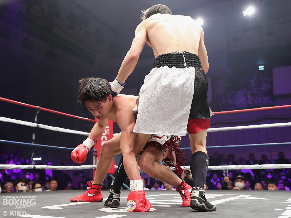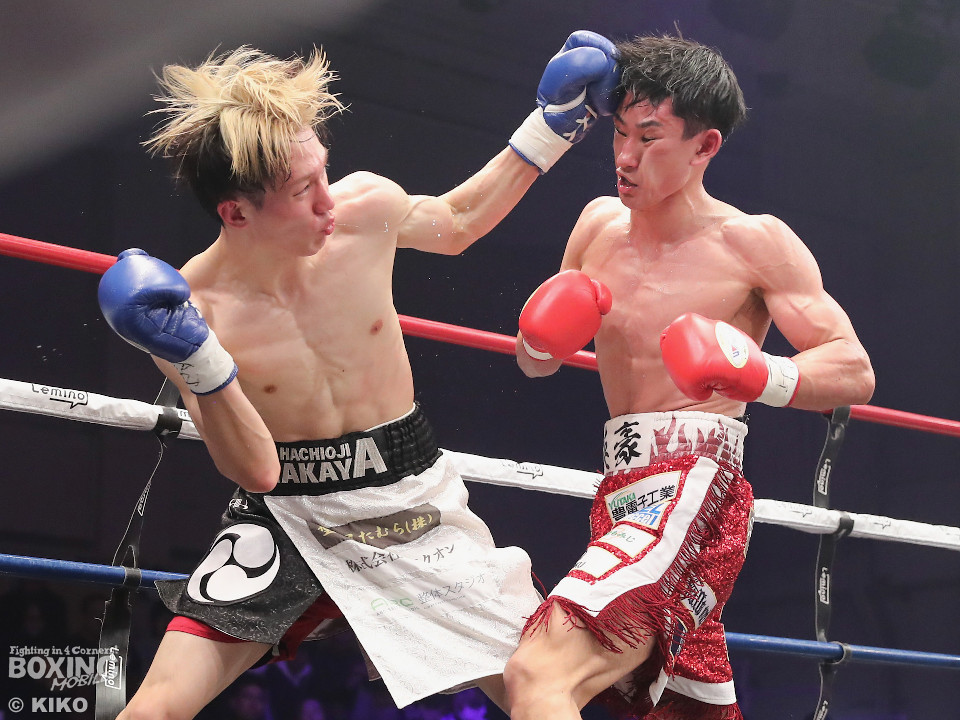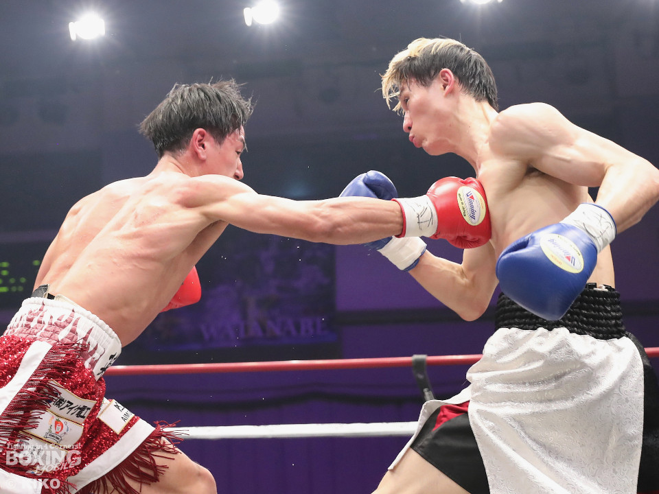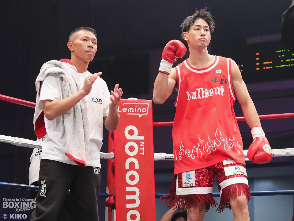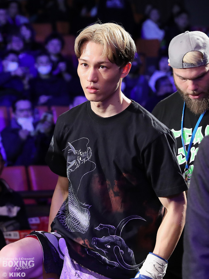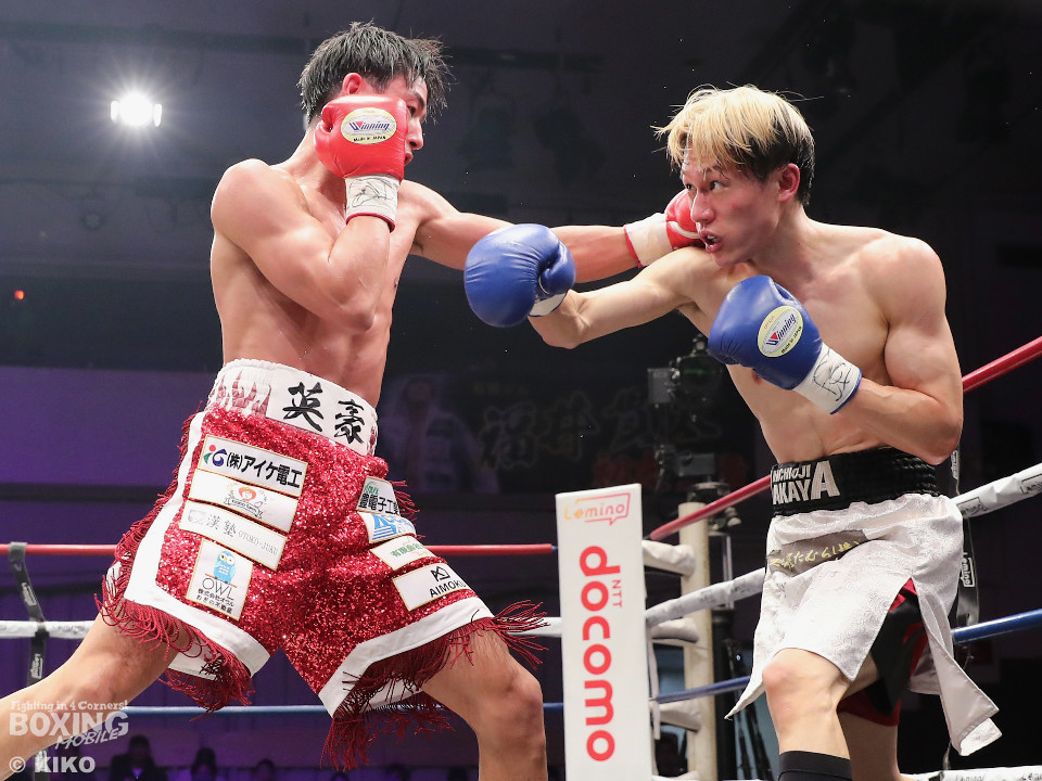 試合:優勝賞金1000万円をかけたスーパーフェザー級トーナメント1回戦、内山高志氏が会長を務めるKOD所属の英豪と4年4ヶ月ぶりにカムバックした牛島が拳を交えた。会場がピーンと張り詰める中、牛島が右クロスをねじ込むのに対し、英豪はリターンの左フックで応戦。中間距離で神経戦を展開。2回、牛島はカウンターの右ショートでダウンを先取。再開後、攻め急がずじっくりと様子を伺った。3回、英豪は右ボディストレートを差し込むとアグレッシブな姿勢。4回、スリリングな攻防を繰り広げる中、英豪は逆ワンツーで顔を弾くと積極的な攻撃。続く回も英豪はジャブからワンツーにつなげてポイントを加点。6回、牛島はワンツーで下がらせて見栄えの良さをアピール。7回、体力の消耗が激しい中、英豪の有効打が上回った印象。8回、両応援団の声援の中、お互いに死力を尽くしての打ち合い。試合終了のゴングが鳴ると惜しみない拍手が送られた。ダウンを挽回した英豪が勝利した。