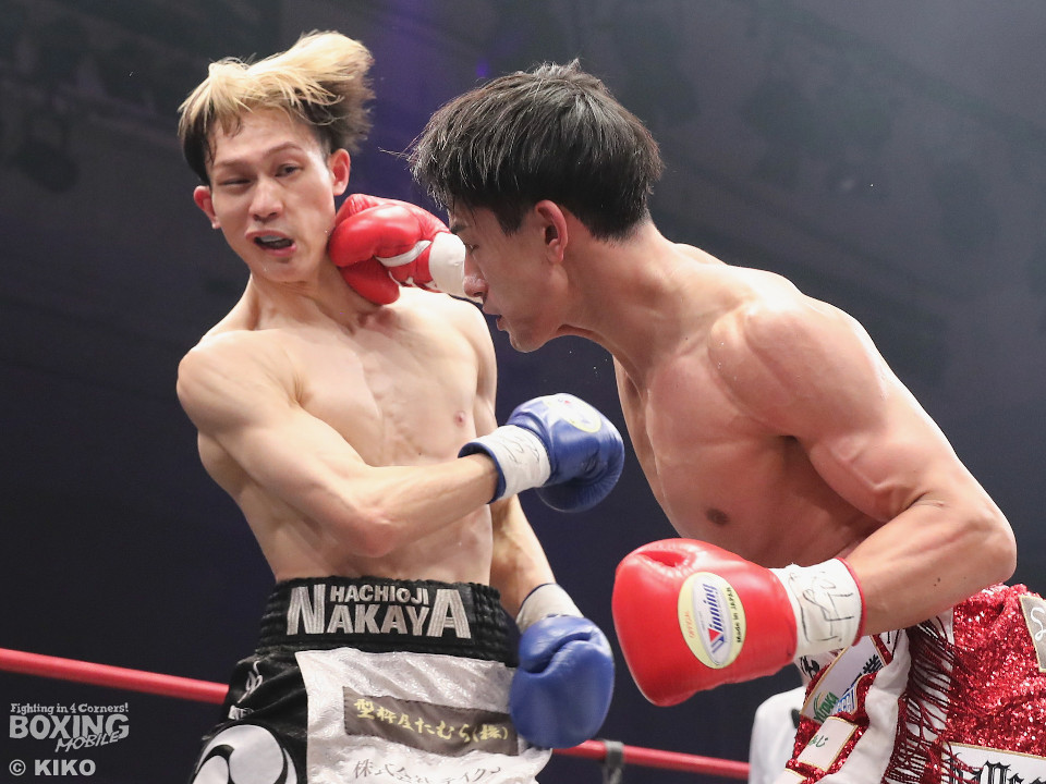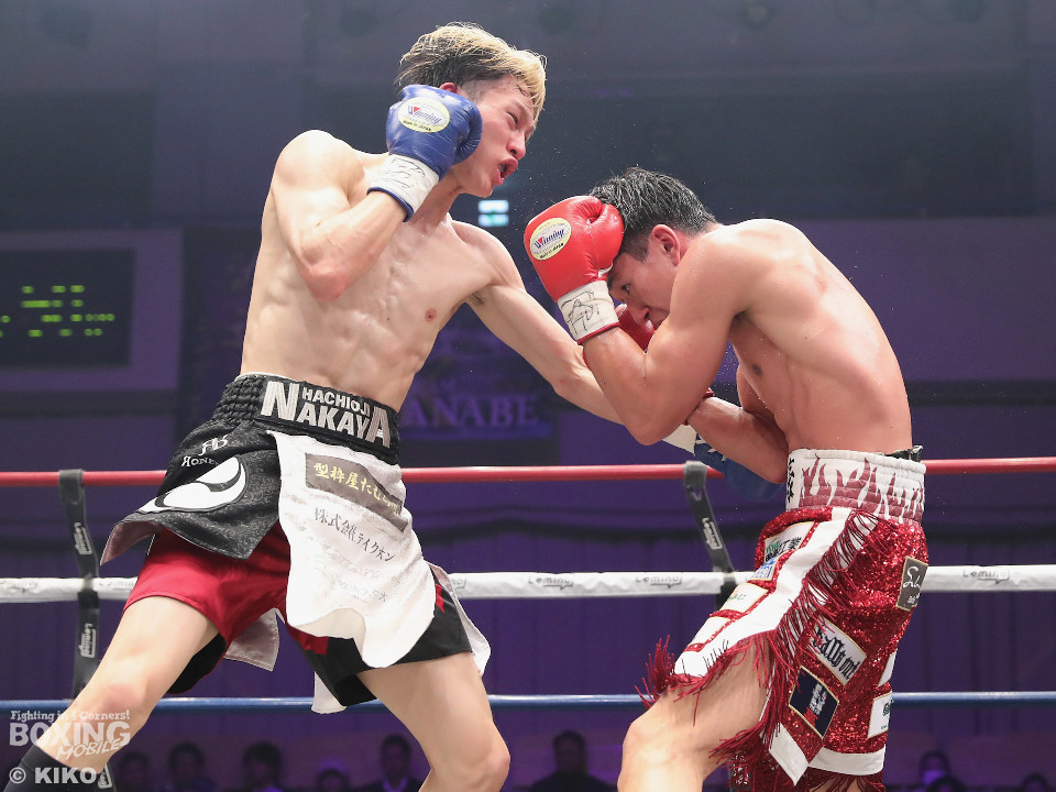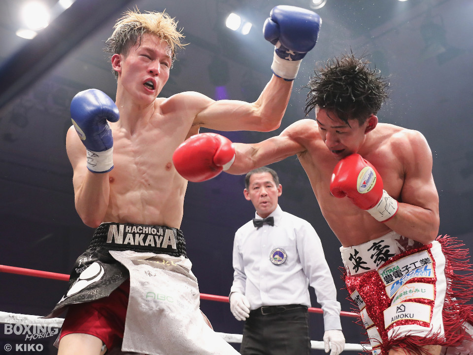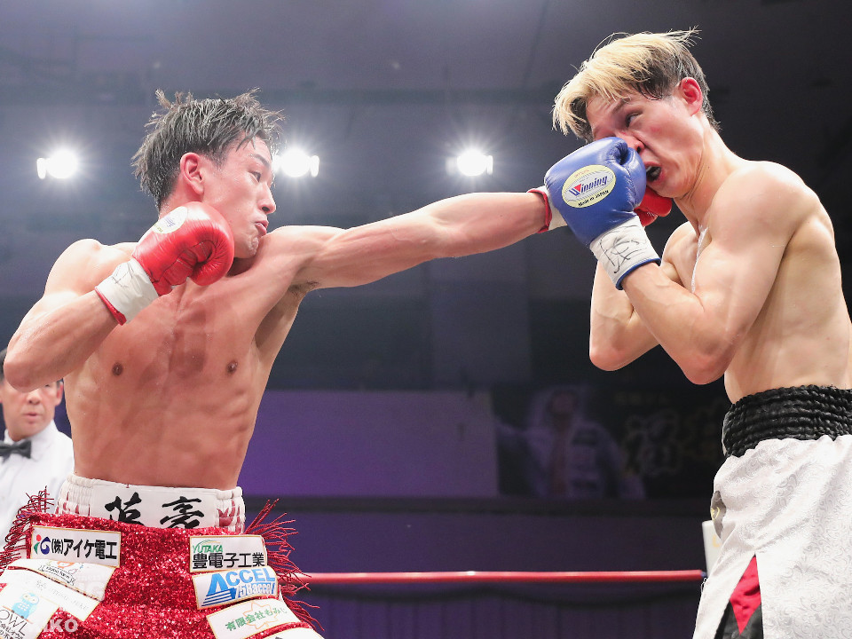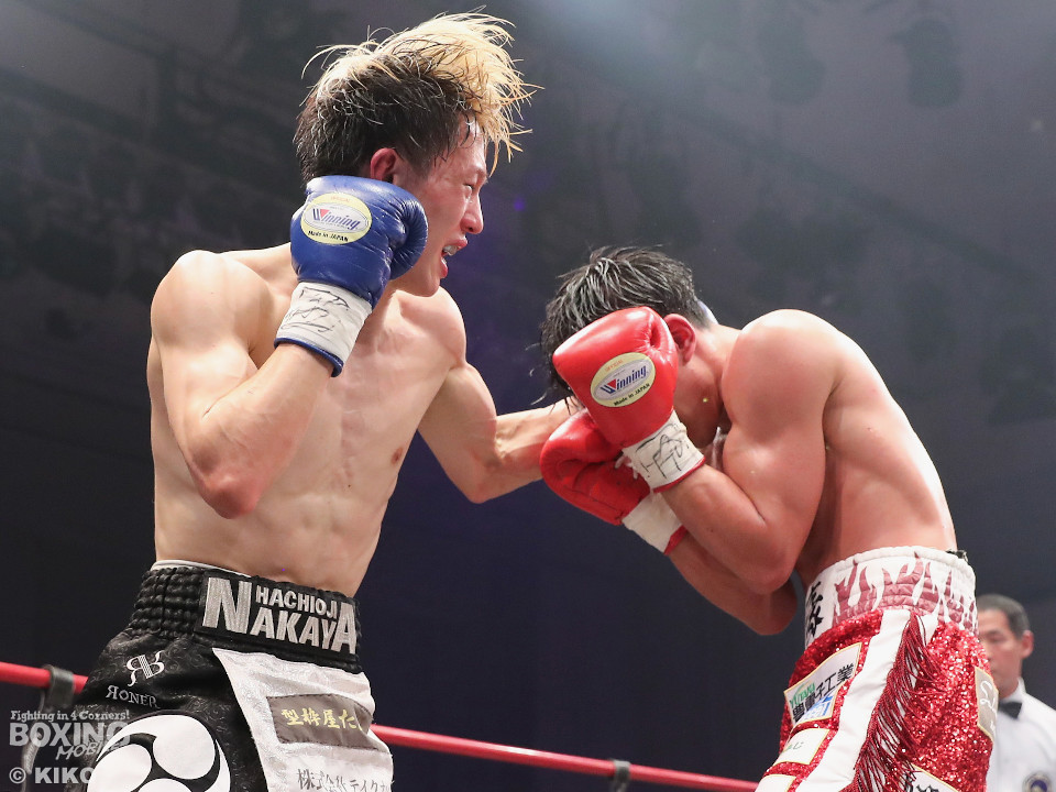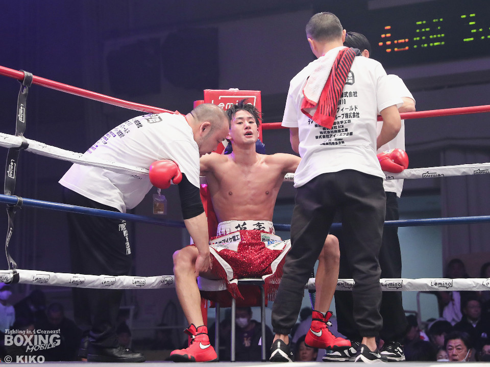 試合:優勝賞金1000万円をかけたスーパーフェザー級トーナメント1回戦、内山高志氏が会長を務めるKOD所属の英豪と4年4ヶ月ぶりにカムバックした牛島が拳を交えた。会場がピーンと張り詰める中、牛島が右クロスをねじ込むのに対し、英豪はリターンの左フックで応戦。中間距離で神経戦を展開。2回、牛島はカウンターの右ショートでダウンを先取。再開後、攻め急がずじっくりと様子を伺った。3回、英豪は右ボディストレートを差し込むとアグレッシブな姿勢。4回、スリリングな攻防を繰り広げる中、英豪は逆ワンツーで顔を弾くと積極的な攻撃。続く回も英豪はジャブからワンツーにつなげてポイントを加点。6回、牛島はワンツーで下がらせて見栄えの良さをアピール。7回、体力の消耗が激しい中、英豪の有効打が上回った印象。8回、両応援団の声援の中、お互いに死力を尽くしての打ち合い。試合終了のゴングが鳴ると惜しみない拍手が送られた。ダウンを挽回した英豪が勝利した。