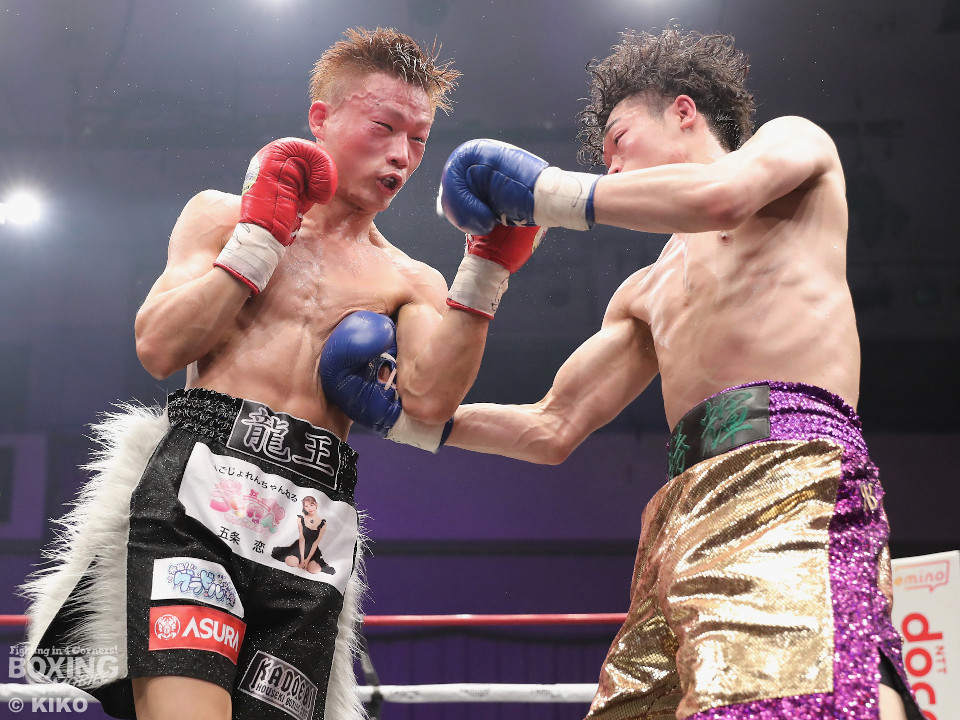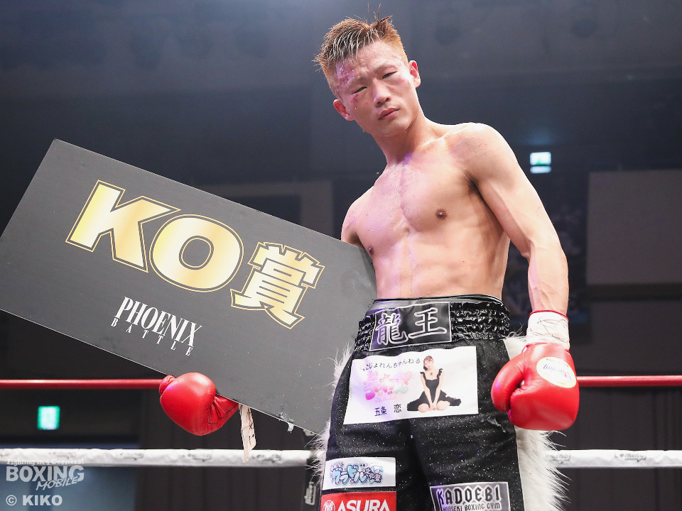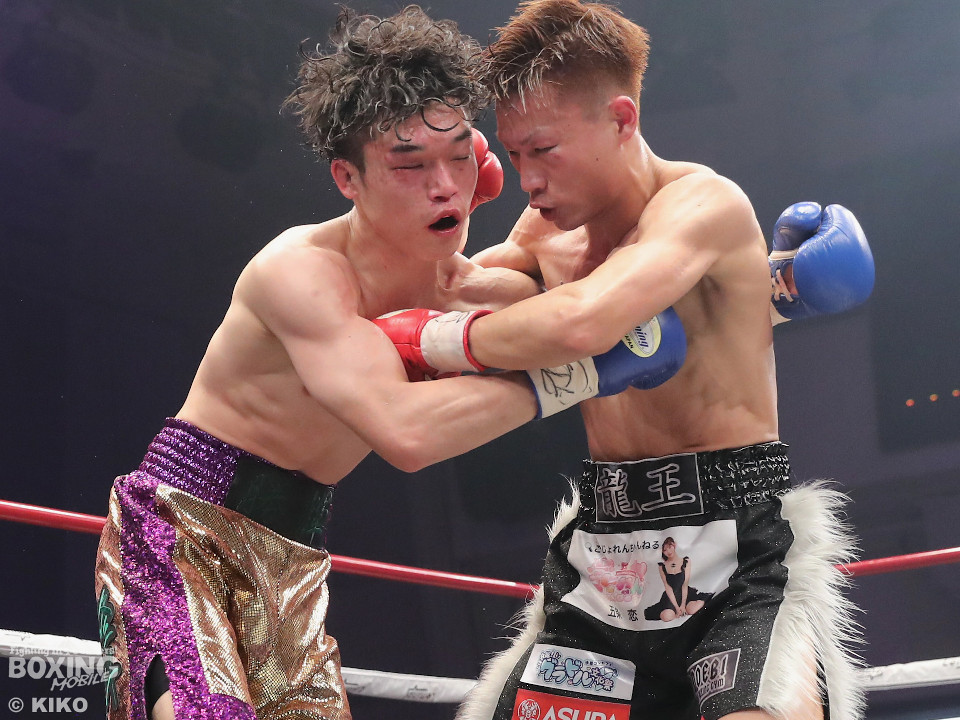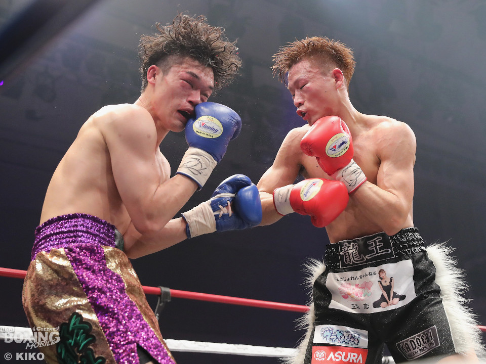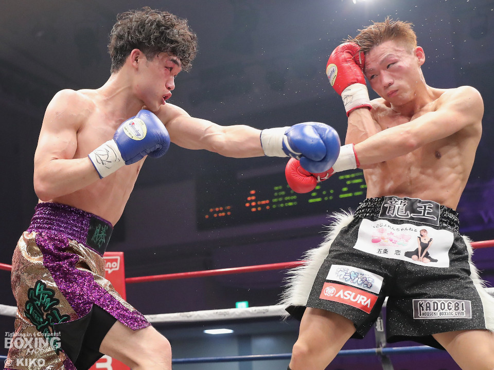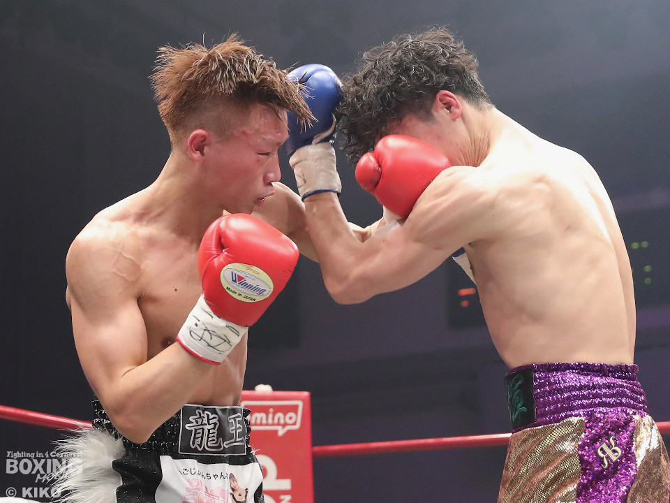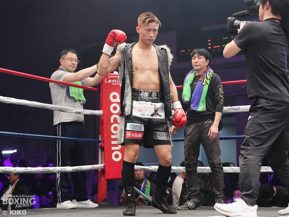 試合:サウスポー同士の一戦は、ジャブ差し合いでスタート。龍王の右がやや深く入ると返しの左を冷静に対応。2回、龍王のジャブが冴えてくる。プレスをかけてアグレッシブな姿勢。3回、岩崎は距離を詰めて右ボディで反撃を試みるが、龍王は押し負けず。ラウンド終盤には左ショートをねじ込みペースを渡さず。4回も龍王のラウンド。丁寧な組み立ててでポイントを加点。岩崎は右目上をヒッティングでカットした。5回、龍王は上下のコンビネーションで攻め立てるとパパっとまとめて攻勢を強めた。勝負が決まったのは6回、龍王は左ボディストレートで効かせると畳みかけてレフェリーストップに持ち込んだ。スーパーフェザー級1000万円トーナメントをKO勝ちした龍王は、賞金20万円を獲得した。