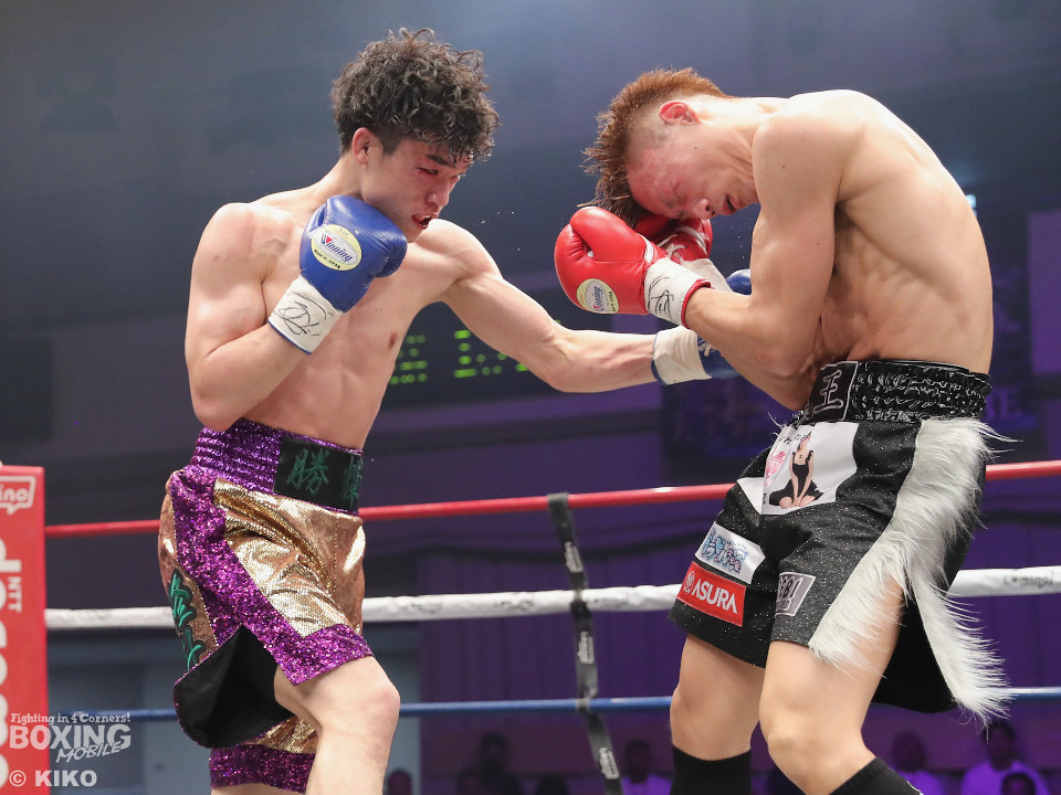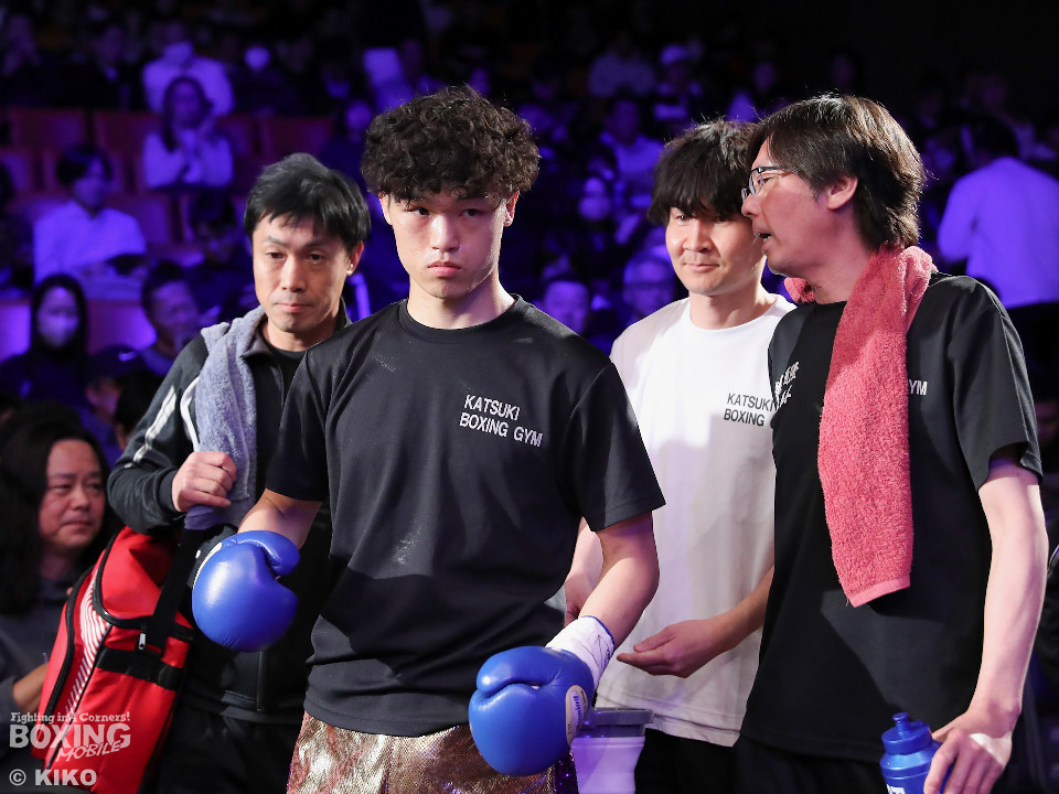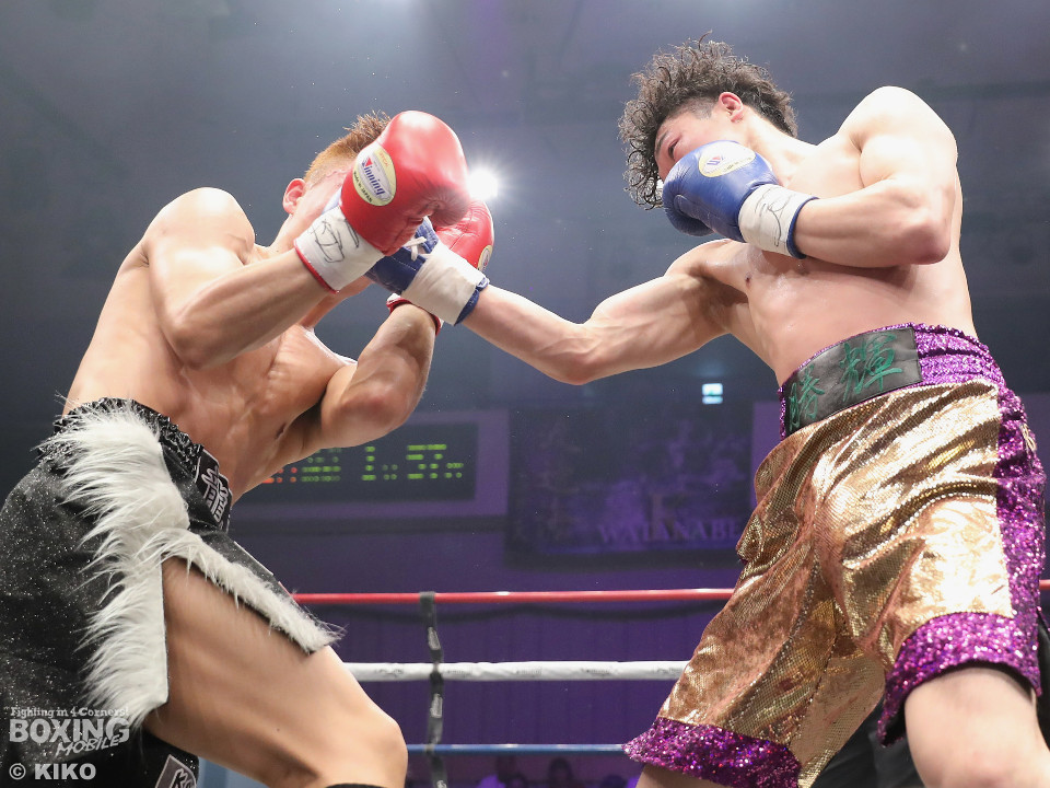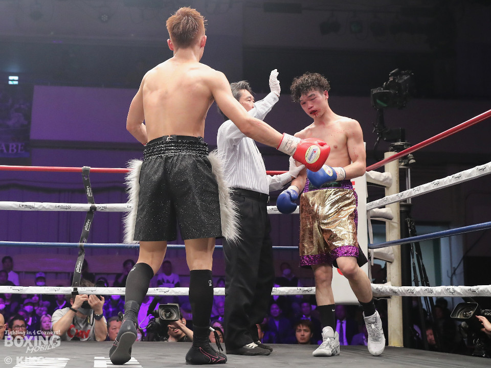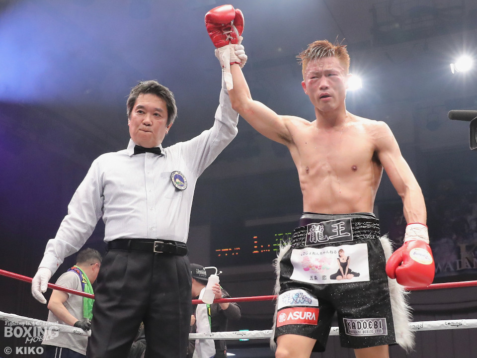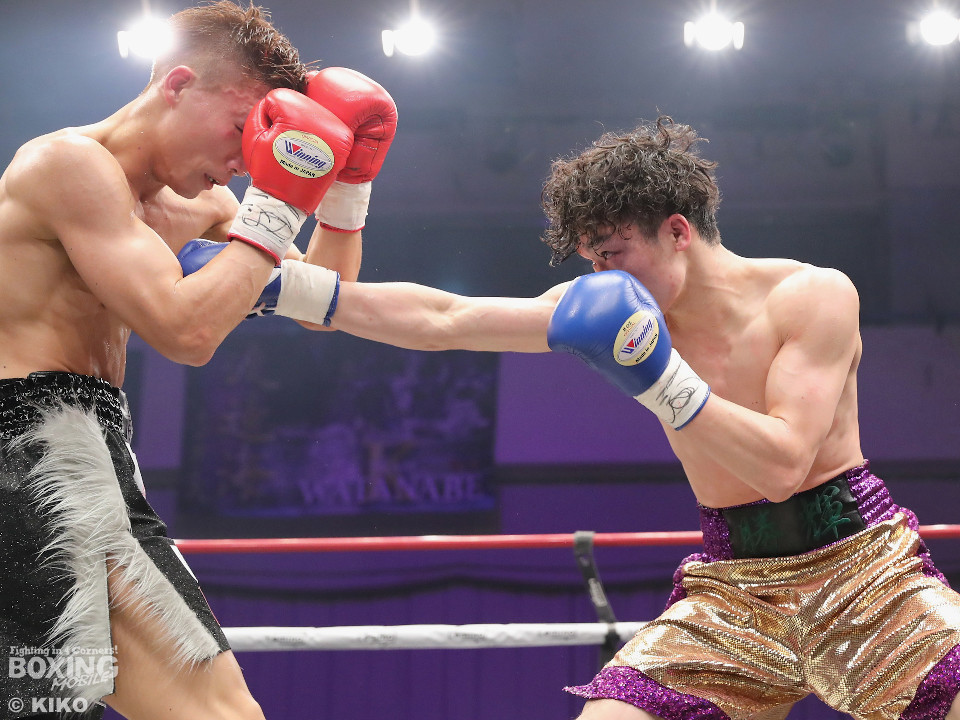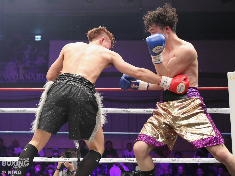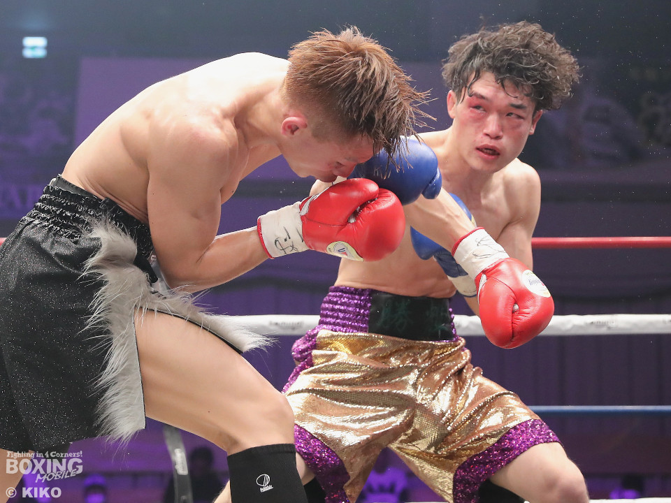 試合:サウスポー同士の一戦は、ジャブ差し合いでスタート。龍王の右がやや深く入ると返しの左を冷静に対応。2回、龍王のジャブが冴えてくる。プレスをかけてアグレッシブな姿勢。3回、岩崎は距離を詰めて右ボディで反撃を試みるが、龍王は押し負けず。ラウンド終盤には左ショートをねじ込みペースを渡さず。4回も龍王のラウンド。丁寧な組み立ててでポイントを加点。岩崎は右目上をヒッティングでカットした。5回、龍王は上下のコンビネーションで攻め立てるとパパっとまとめて攻勢を強めた。勝負が決まったのは6回、龍王は左ボディストレートで効かせると畳みかけてレフェリーストップに持ち込んだ。スーパーフェザー級1000万円トーナメントをKO勝ちした龍王は、賞金20万円を獲得した。