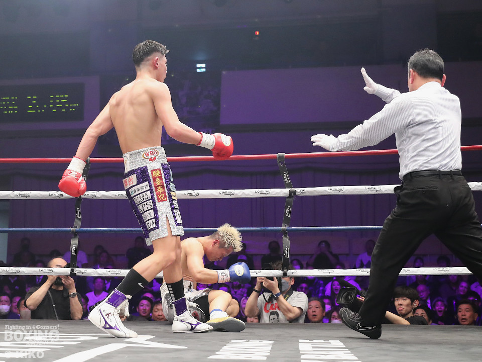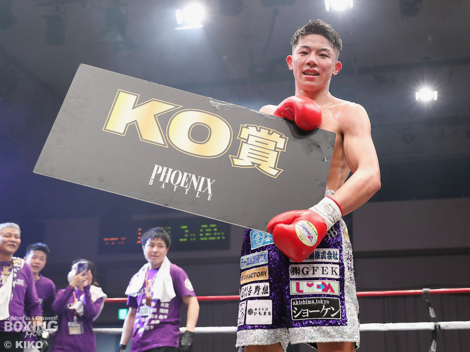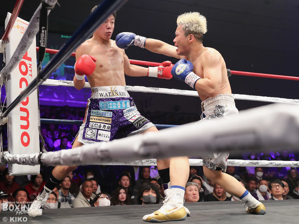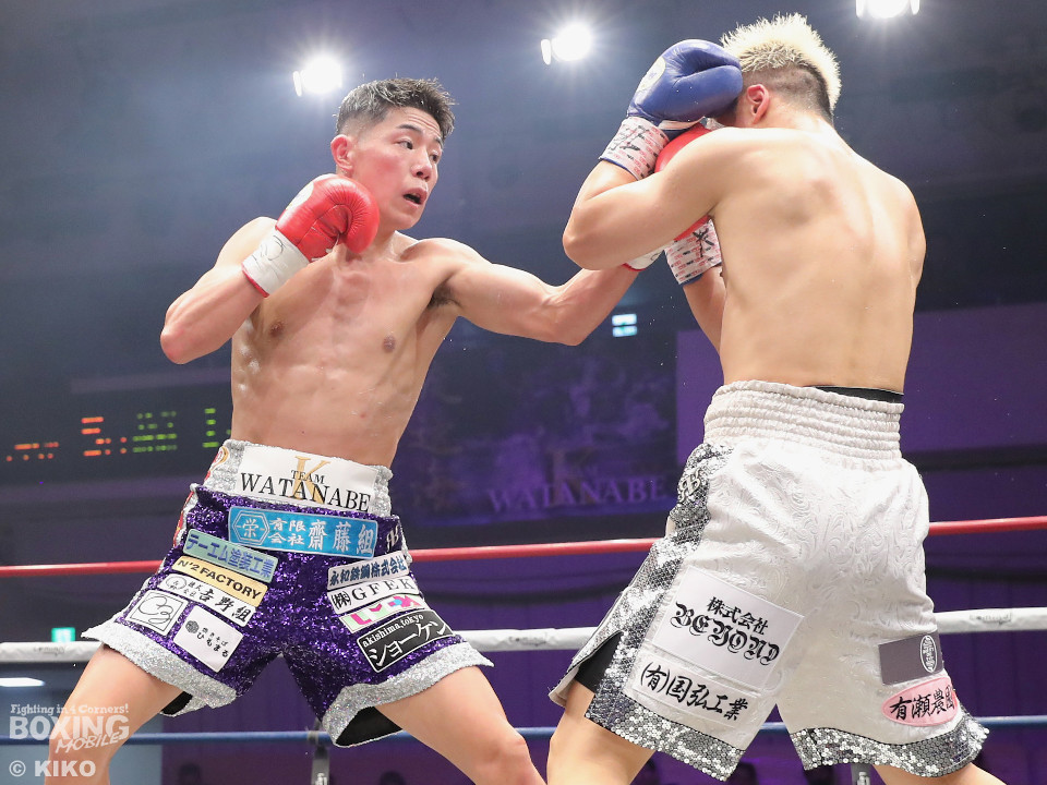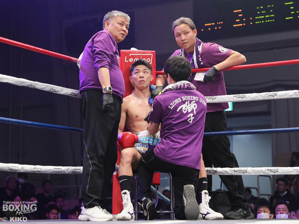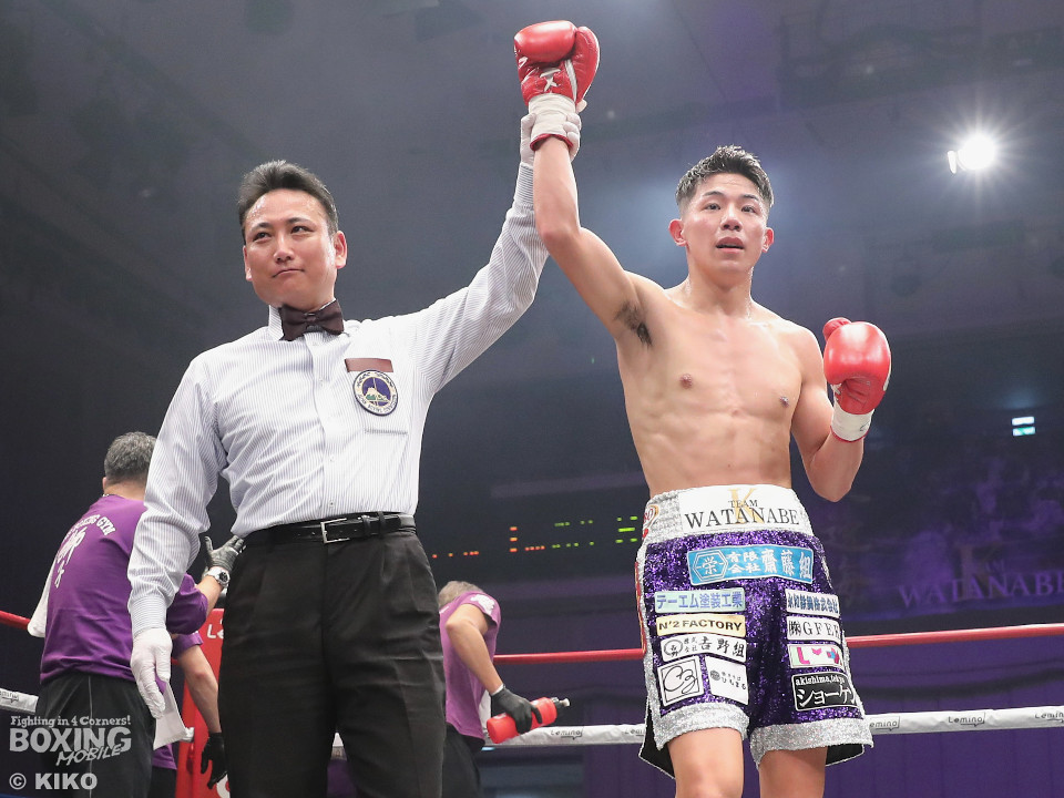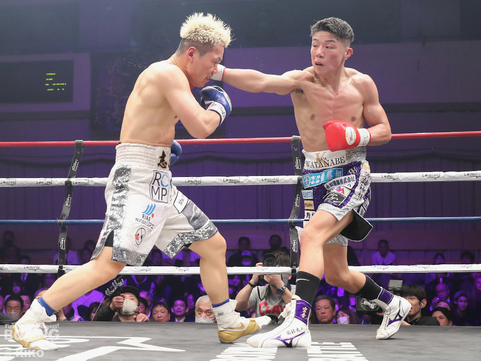 渡邊は再びジャブを軸に冷静な試合運び。4回、打ち合いに持ち込みたい新井だが、相手の左が邪魔で思い通りの展開を作れず。5回も渡邊がサークリングしながらコントロールした。6回、渡邊は左フックで効かせると一気にスパート。左アッパーで倒すとレフェリーはノーカウントでストップした。渡邊がKO勝ちでスーパーフェザー級1000万円トーナメント初戦を突破した。