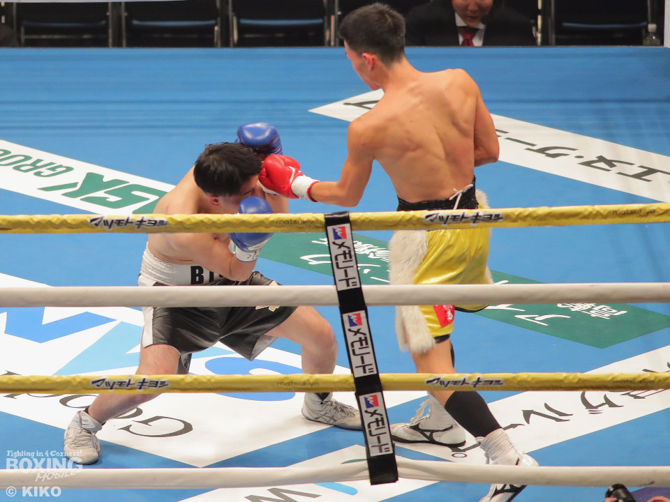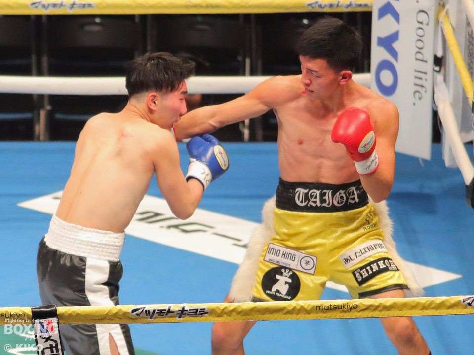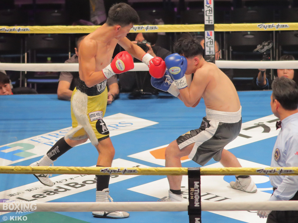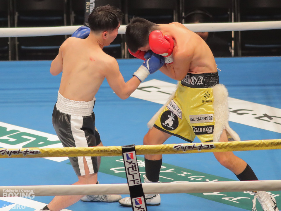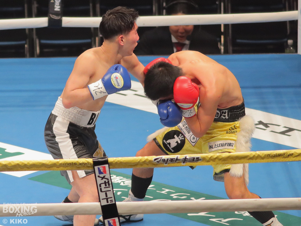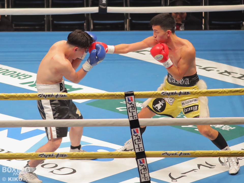 試合:澤田が距離を詰めて右ボディから仕掛けるのに対し、サウスポー為我井は、左アッパーで迎え撃ち見栄えの良さをアピール。2回、澤田はしつこく前進しながら体力を削りに行くが、為我井はワンツーで突き放しペースを維持。3回、澤田は回転力を活かした連打で反撃。しかし、為我井は左ストレートで顔を弾き譲らず。4回、為我井は要所でワンツーを決めて粘る澤田を振り切った。4勝目を挙げた為我井がB級昇格を決めた。