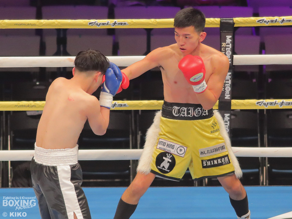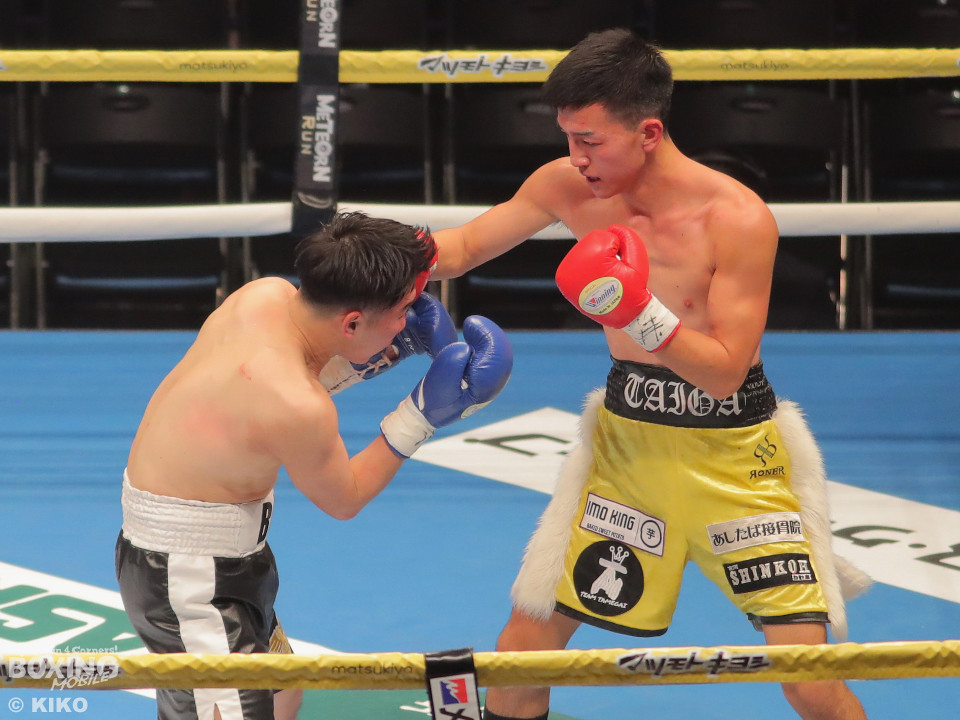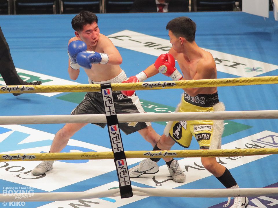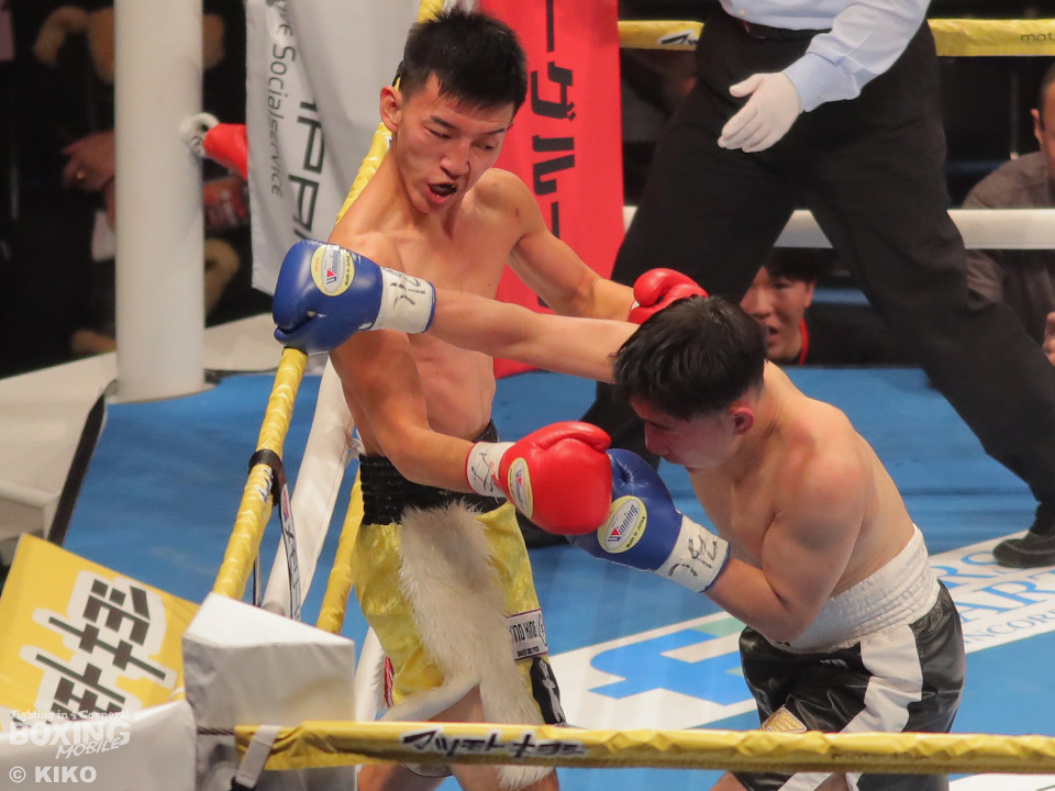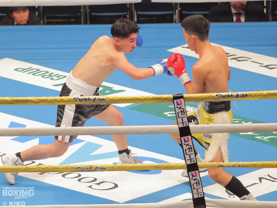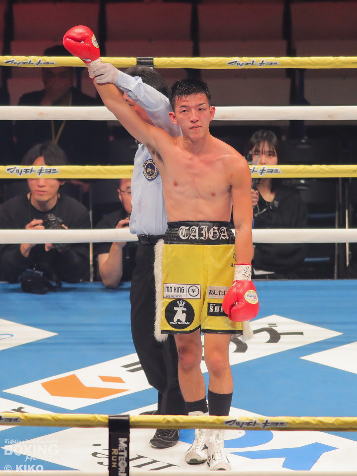 試合:澤田が距離を詰めて右ボディから仕掛けるのに対し、サウスポー為我井は、左アッパーで迎え撃ち見栄えの良さをアピール。2回、澤田はしつこく前進しながら体力を削りに行くが、為我井はワンツーで突き放しペースを維持。3回、澤田は回転力を活かした連打で反撃。しかし、為我井は左ストレートで顔を弾き譲らず。4回、為我井は要所でワンツーを決めて粘る澤田を振り切った。4勝目を挙げた為我井がB級昇格を決めた。