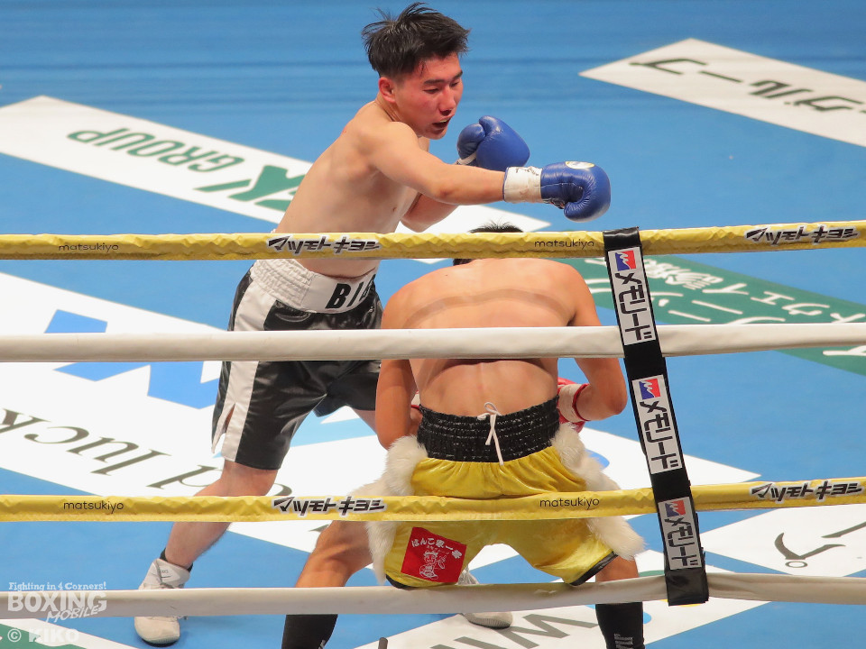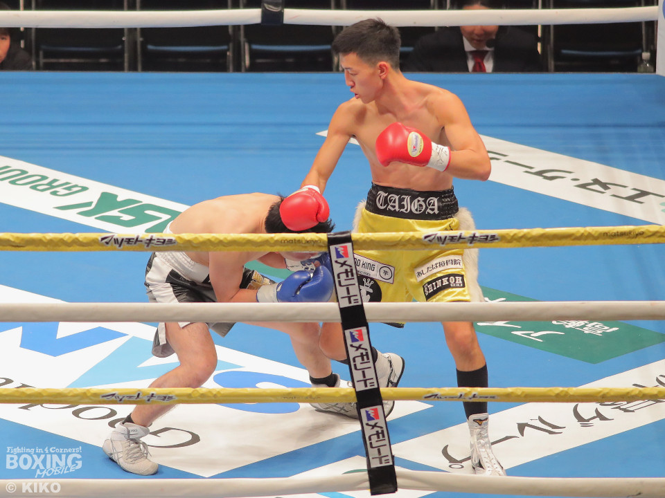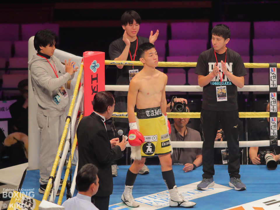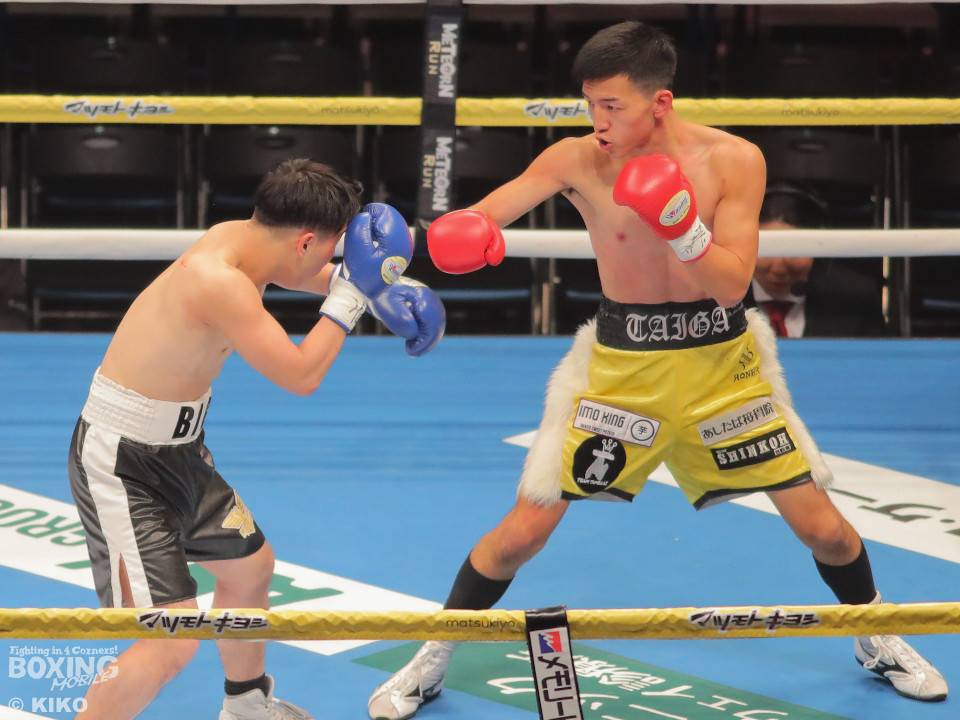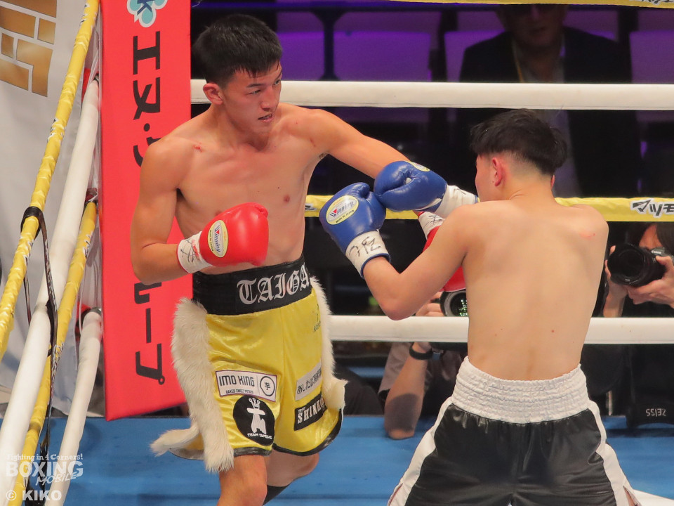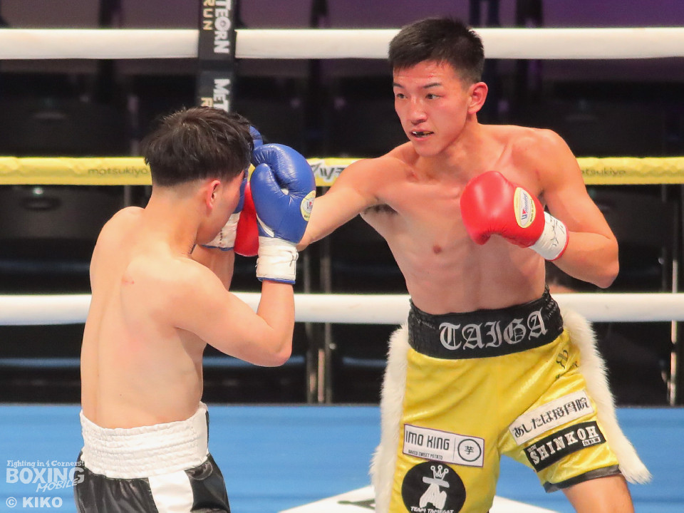 試合:澤田が距離を詰めて右ボディから仕掛けるのに対し、サウスポー為我井は、左アッパーで迎え撃ち見栄えの良さをアピール。2回、澤田はしつこく前進しながら体力を削りに行くが、為我井はワンツーで突き放しペースを維持。3回、澤田は回転力を活かした連打で反撃。しかし、為我井は左ストレートで顔を弾き譲らず。4回、為我井は要所でワンツーを決めて粘る澤田を振り切った。4勝目を挙げた為我井がB級昇格を決めた。