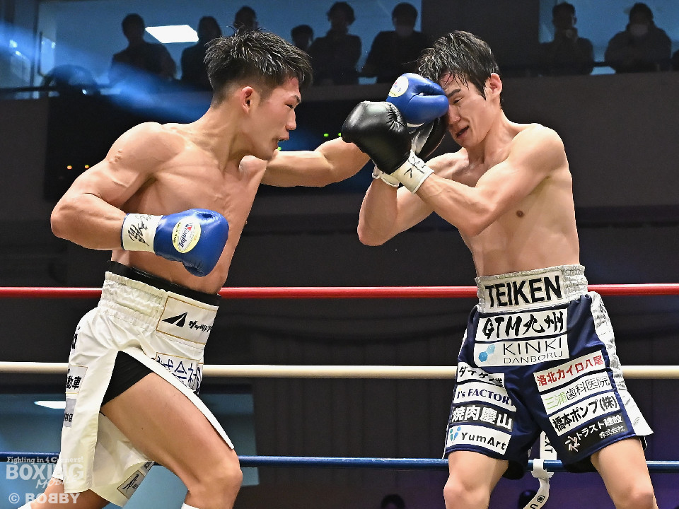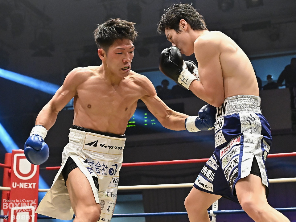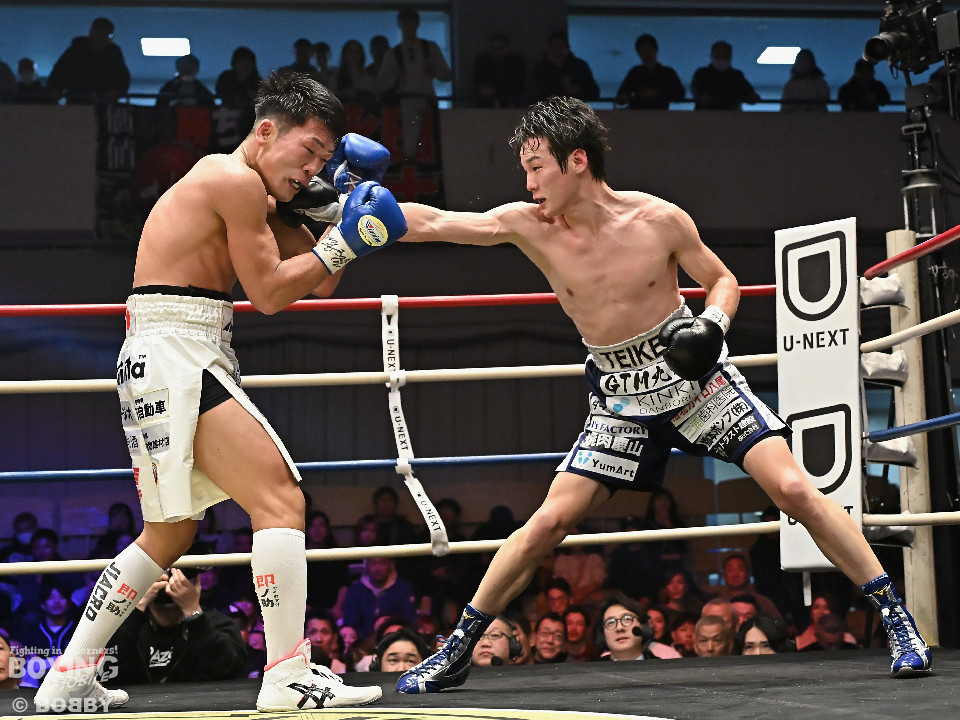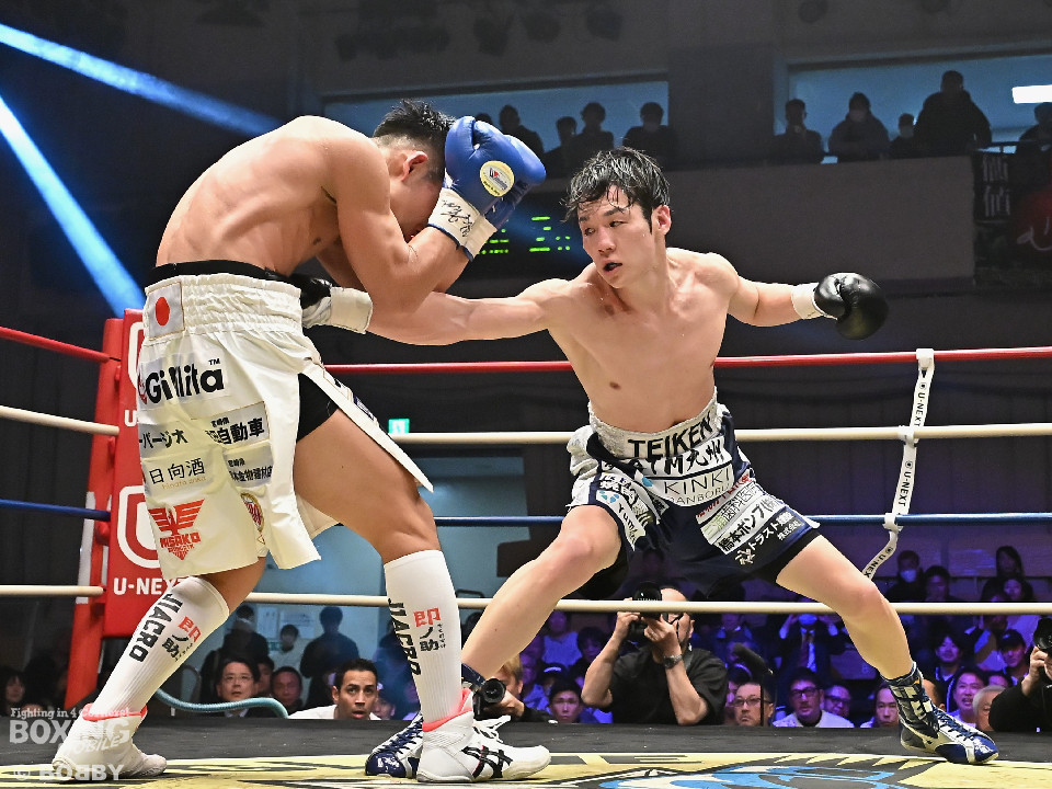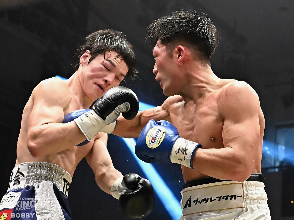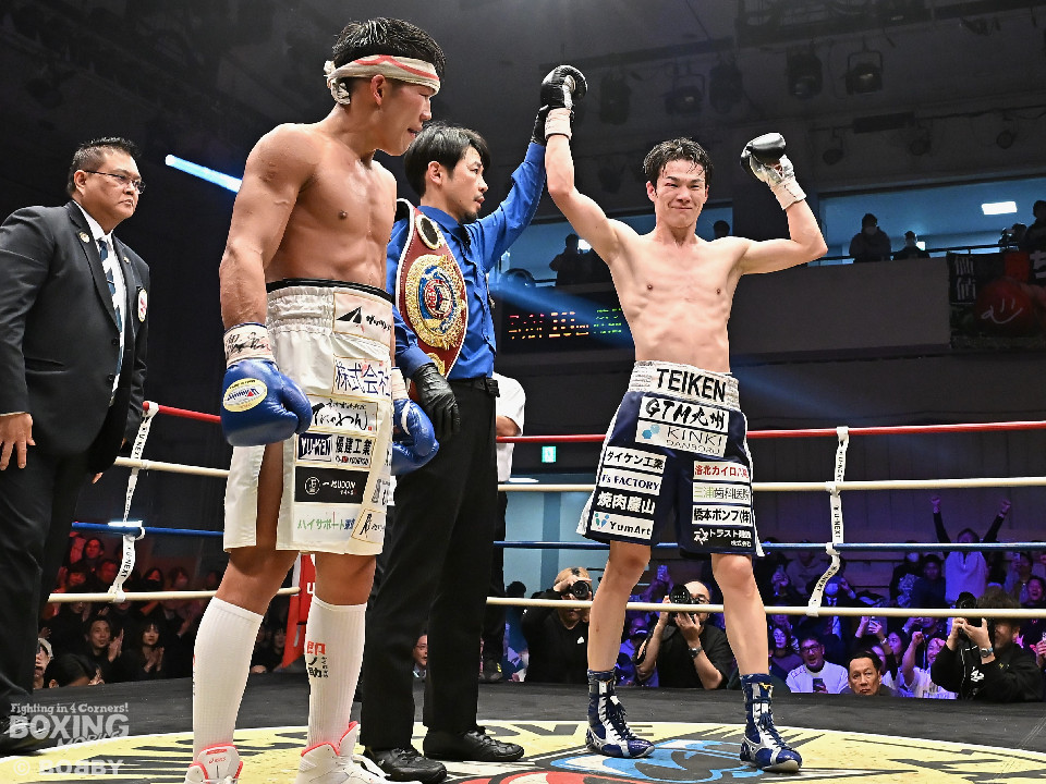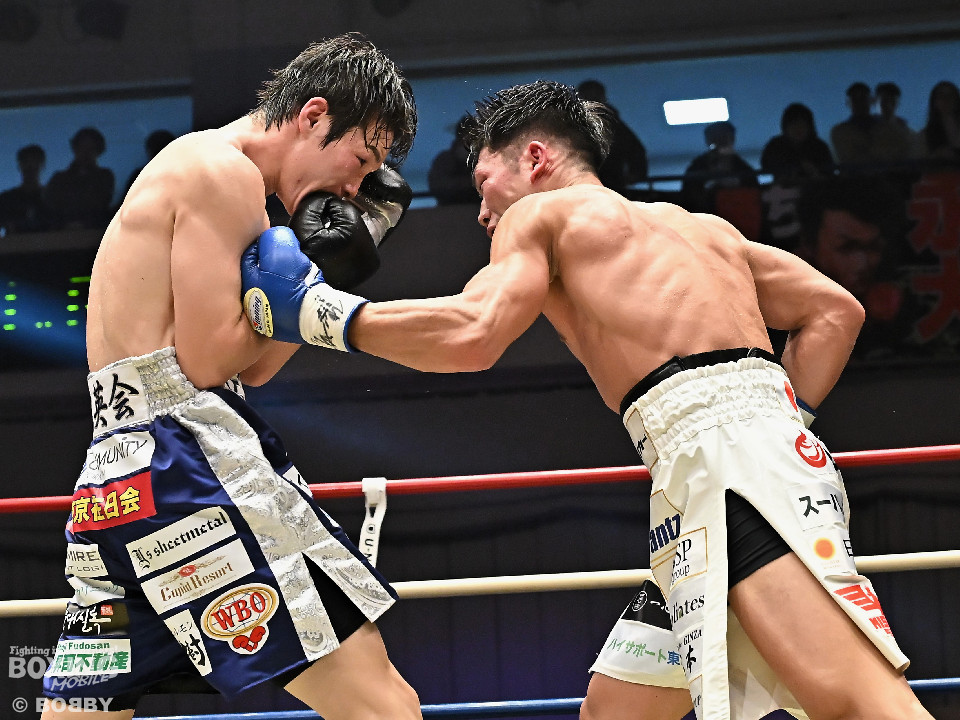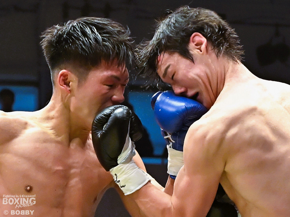 試合:空位のWBOアジアパシフィック王座を懸けて、同級1位の李健太と元OPBF・WBO-AP統一王者の永田が対峙した。スーパーライト級決戦に後楽園ホールの緊張感が高まった。サウスポー同士による一戦は、永田がグイっと前に出てボディにパンチを集めるのに対し、李は右ボディ、左アッパーで迎え撃ち応戦。2回、李は右フックで顔を弾くとワンツーで突き放しにかかる。3回、永田は被弾をものともせずボディ攻撃を徹底。李も気持ちを切らさず左アッパーからワンツー連打につなげてペースを渡さず。4回、永田はプッシュしながらボディにコツコツと集めて体力を削る作戦。5回、我慢比べの打ち合いが続く中、李が要所でまとめて攻勢を印象付けた。6回、李はサイドに回り込むとパパっとまとめた。7回も李は右アッパーを差し込むと緩急をつけて試合巧者ぶりを発揮。8回、頭がぶつかり李は前頭部を負傷。10回、偶然のバッティングで李は右目上、永田は左目上をカット。再開後、打ち合いは激しさを増す中、李が有効打で上回った。李が判定勝ちでWBO-AP新チャンピオンに輝いた。