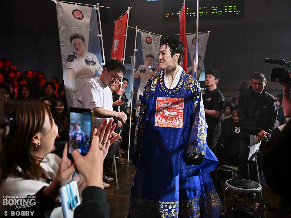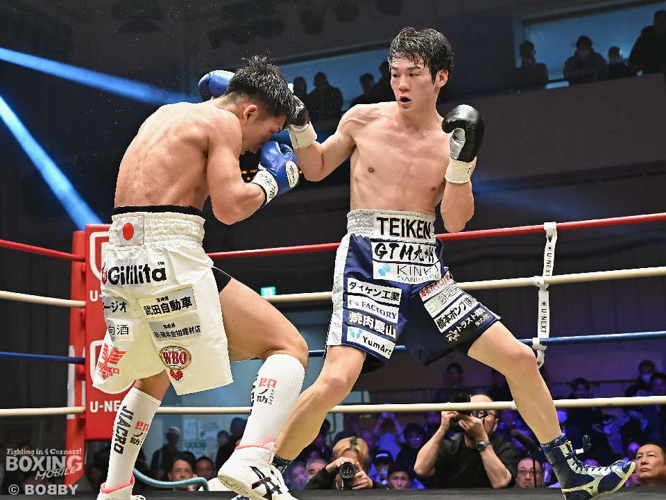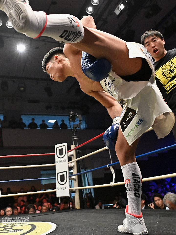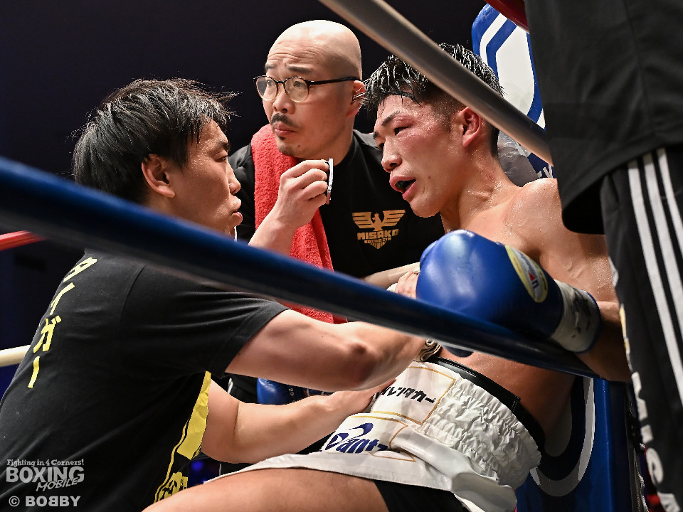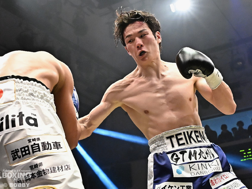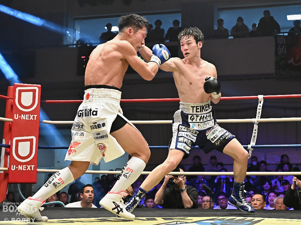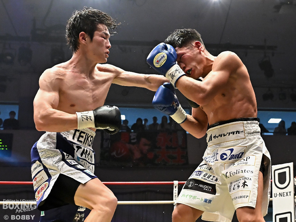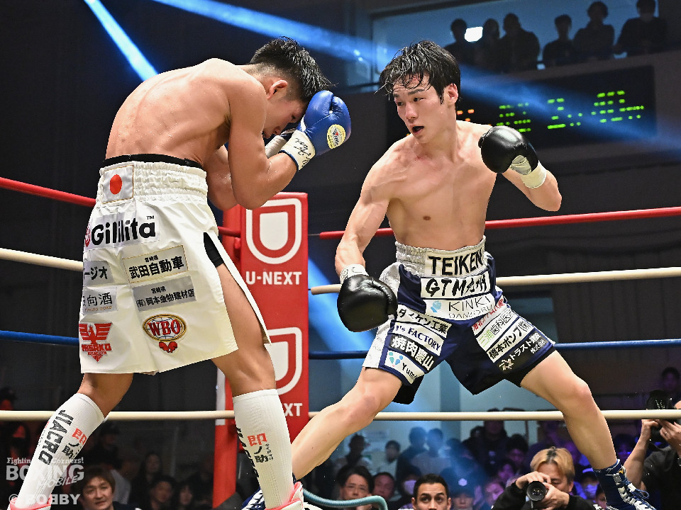 試合:空位のWBOアジアパシフィック王座を懸けて、同級1位の李健太と元OPBF・WBO-AP統一王者の永田が対峙した。スーパーライト級決戦に後楽園ホールの緊張感が高まった。サウスポー同士による一戦は、永田がグイっと前に出てボディにパンチを集めるのに対し、李は右ボディ、左アッパーで迎え撃ち応戦。2回、李は右フックで顔を弾くとワンツーで突き放しにかかる。3回、永田は被弾をものともせずボディ攻撃を徹底。李も気持ちを切らさず左アッパーからワンツー連打につなげてペースを渡さず。4回、永田はプッシュしながらボディにコツコツと集めて体力を削る作戦。5回、我慢比べの打ち合いが続く中、李が要所でまとめて攻勢を印象付けた。6回、李はサイドに回り込むとパパっとまとめた。7回も李は右アッパーを差し込むと緩急をつけて試合巧者ぶりを発揮。8回、頭がぶつかり李は前頭部を負傷。10回、偶然のバッティングで李は右目上、永田は左目上をカット。再開後、打ち合いは激しさを増す中、李が有効打で上回った。李が判定勝ちでWBO-AP新チャンピオンに輝いた。