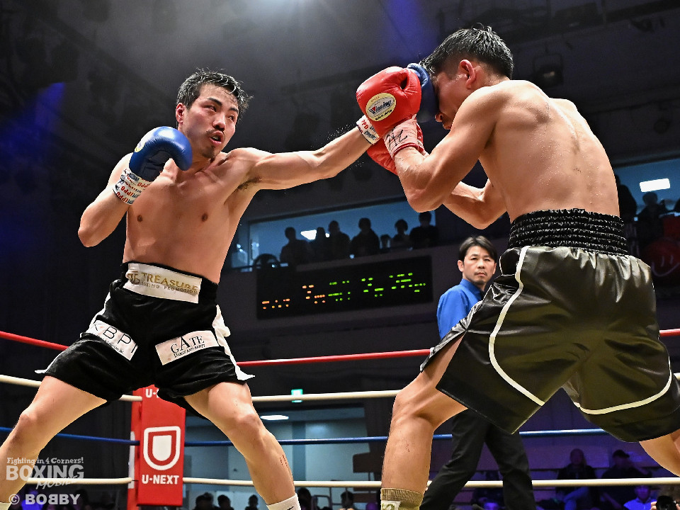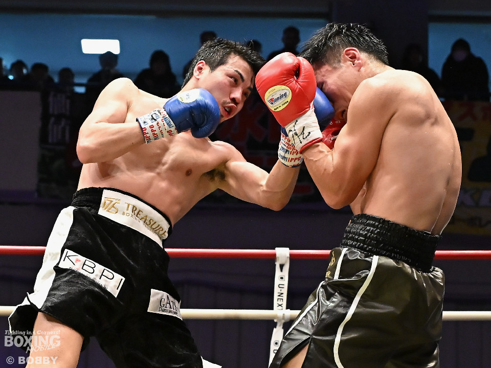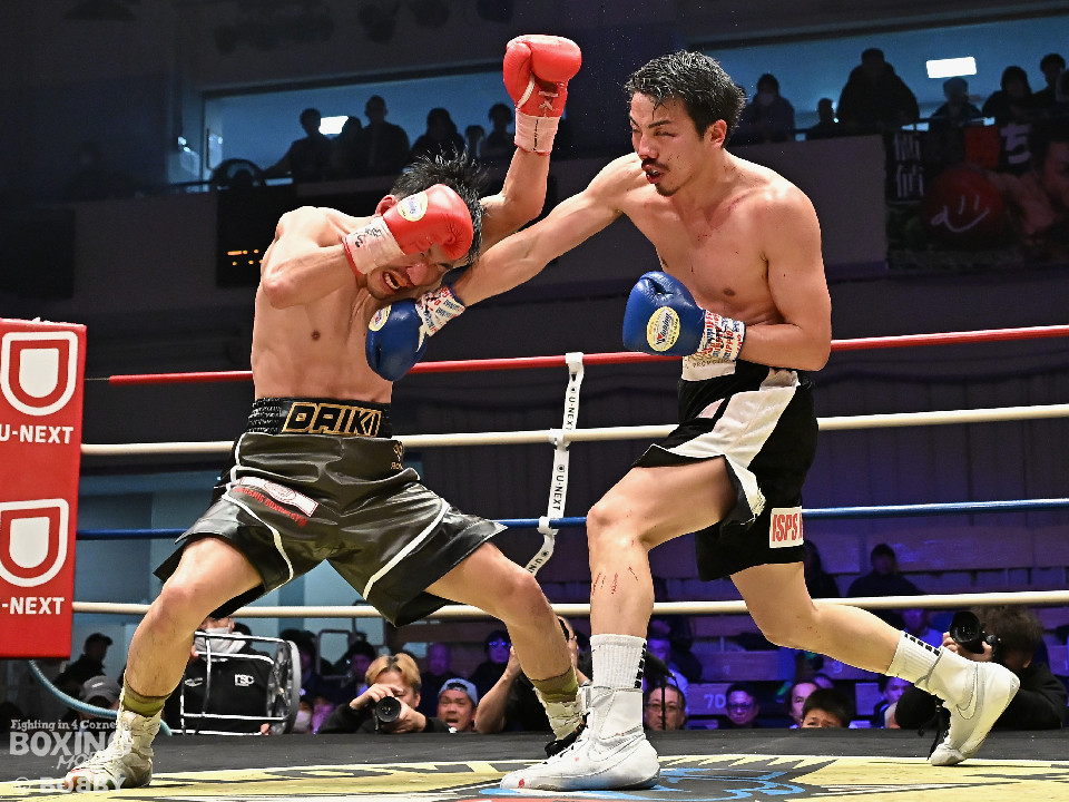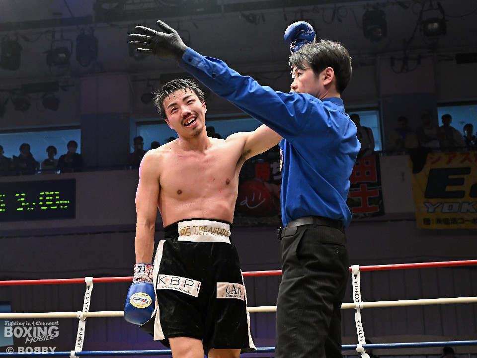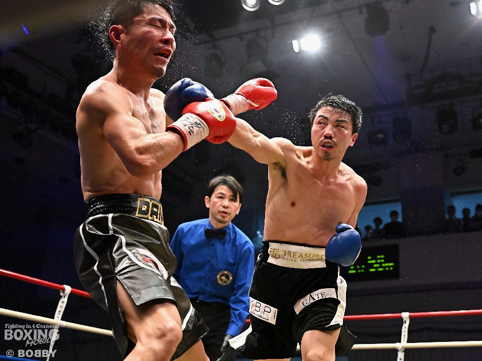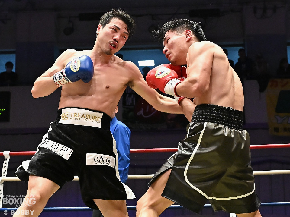 試合:中村がジャブでプレスをかけるとワンツーをヒット。2回、阪本はガードを固めながら左ボディを打ち込むが、中村はワンツーで押し込みペースを渡さず。3回、阪本はやや遅れて出てくる右フック、左ボディで積極的な攻撃。4回、阪本はジリジリと距離を詰めてコンパクトなコンビネーションで攻勢。5回、中村はジャブで立て直しを図ると左ボディを好打。6回、中村はワンツーで膝を揺らすと前に出てくる相手を突き放した。7回、中村はワンツーで顔を弾き見栄えの良さをアピール。しかし、阪本も表情を変えずコツコツと返した。8回、最後の力を振り絞り懸命の打ち合い。阪本の回転力がやや上回った。消耗戦を制した中村が3連勝を飾った。