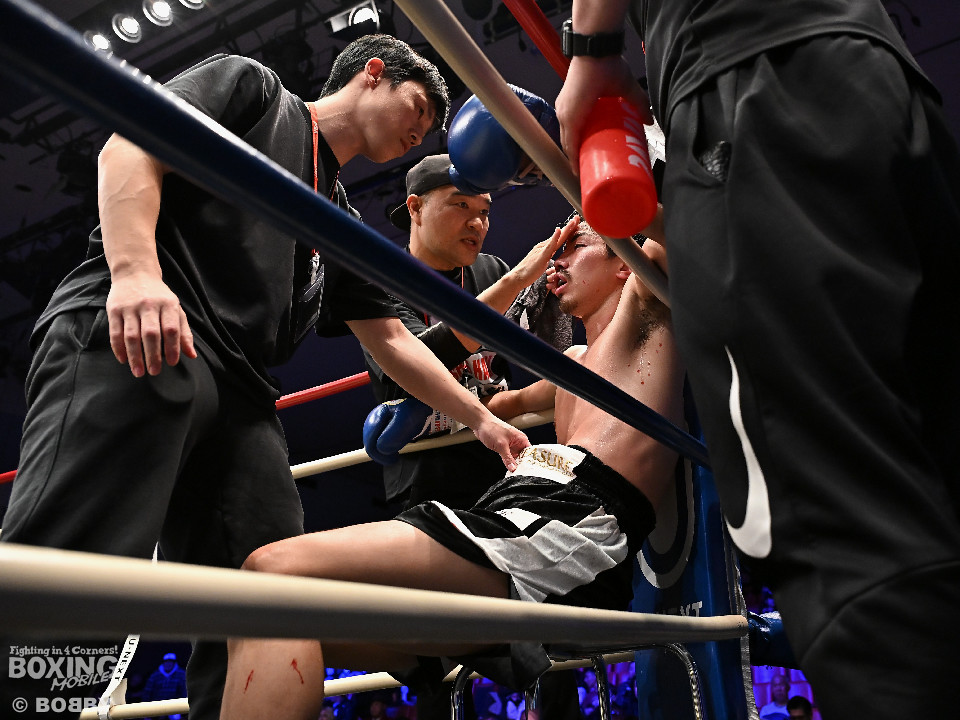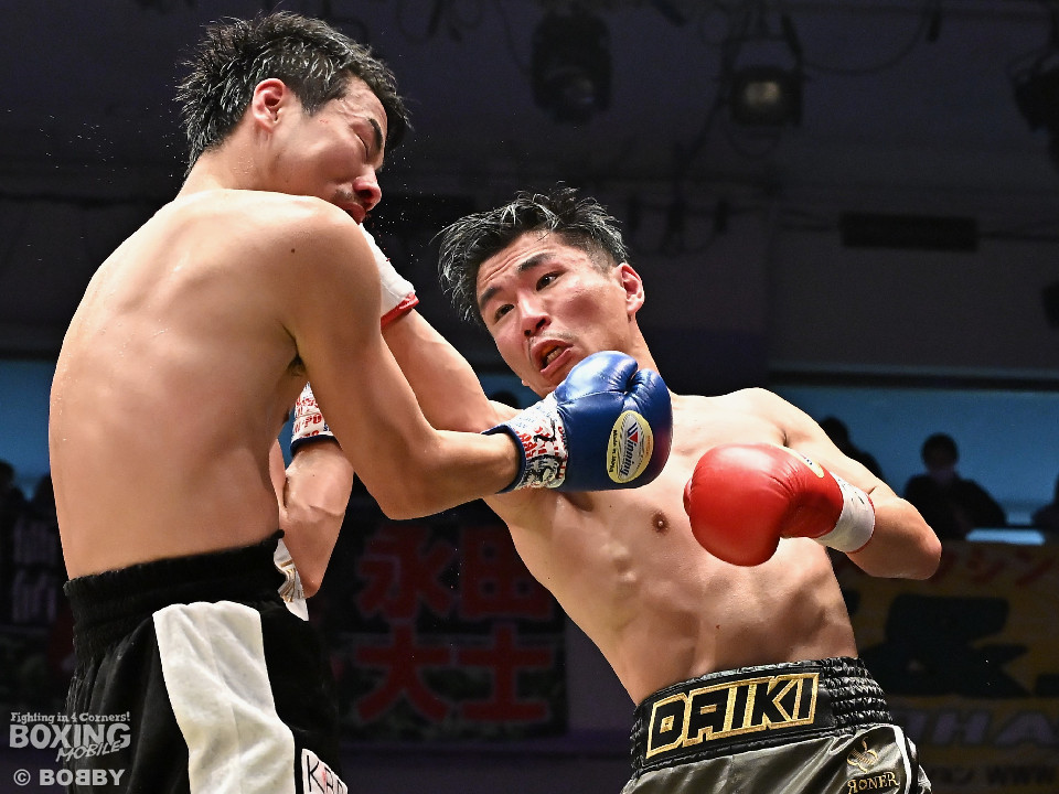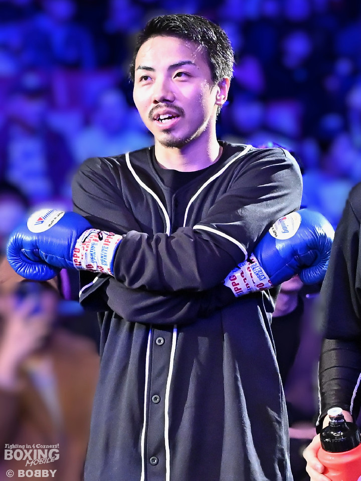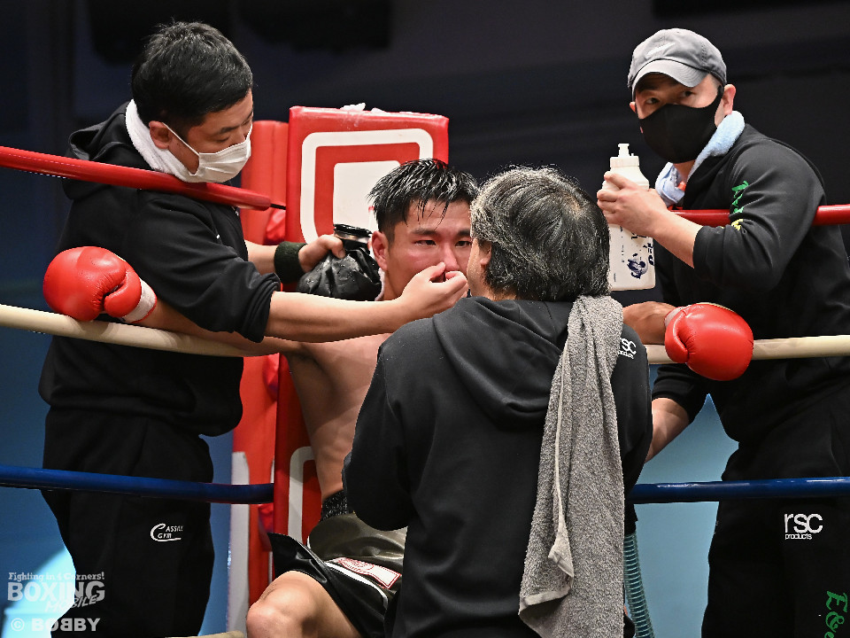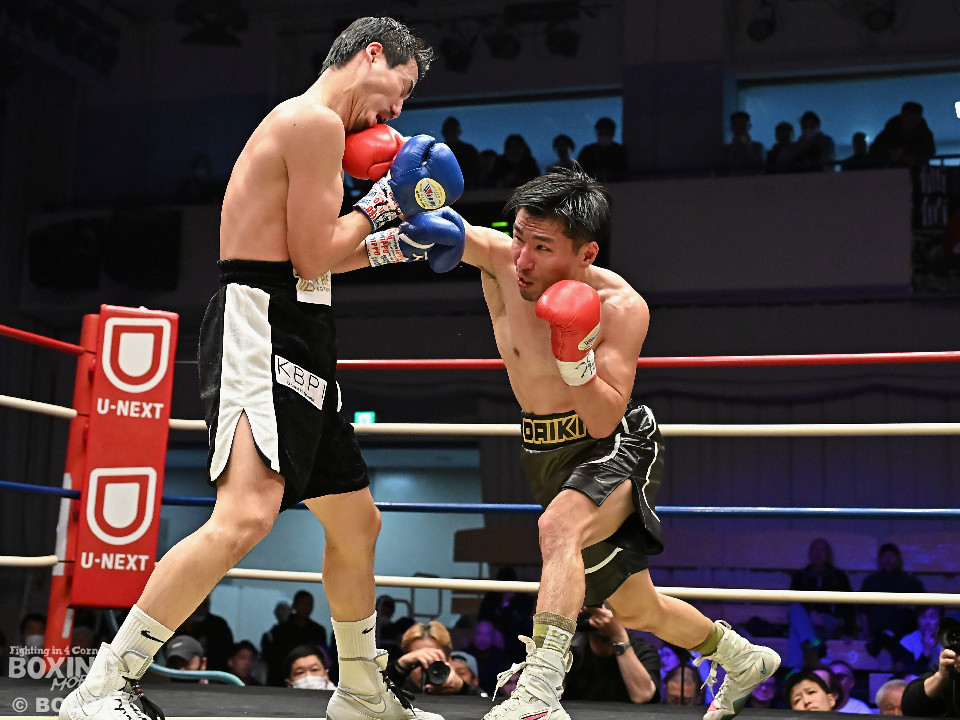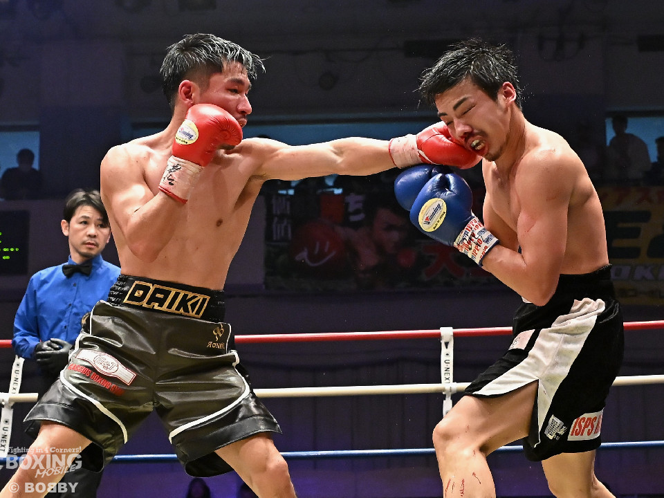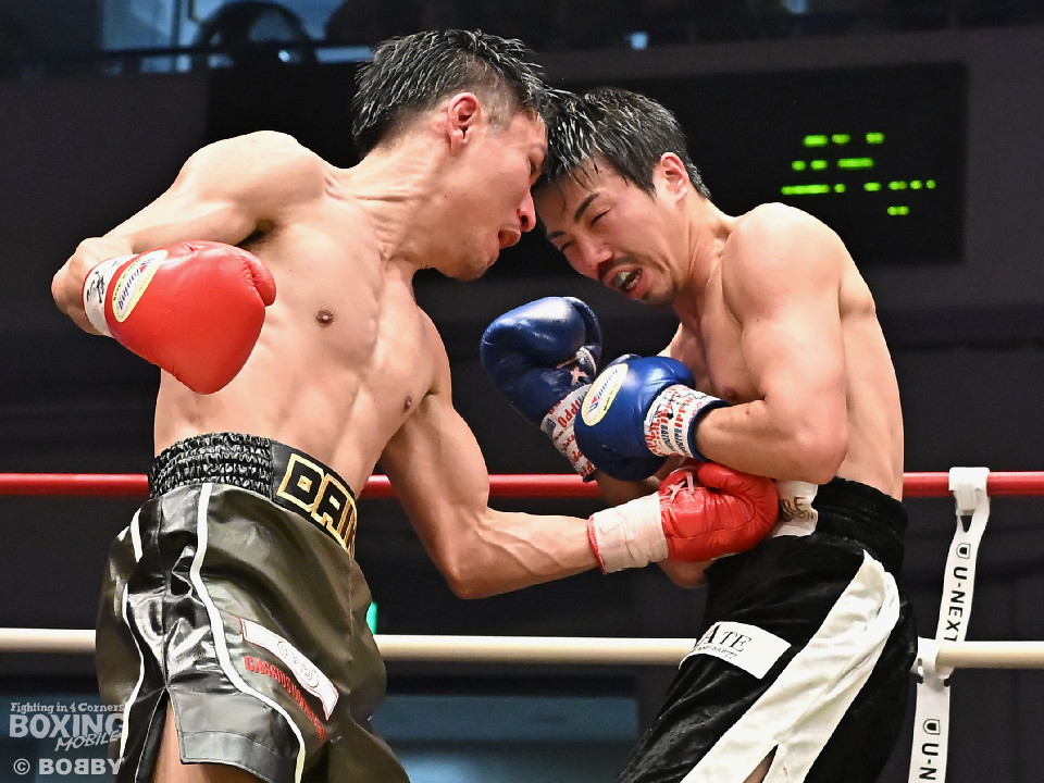 試合:中村がジャブでプレスをかけるとワンツーをヒット。2回、阪本はガードを固めながら左ボディを打ち込むが、中村はワンツーで押し込みペースを渡さず。3回、阪本はやや遅れて出てくる右フック、左ボディで積極的な攻撃。4回、阪本はジリジリと距離を詰めてコンパクトなコンビネーションで攻勢。5回、中村はジャブで立て直しを図ると左ボディを好打。6回、中村はワンツーで膝を揺らすと前に出てくる相手を突き放した。7回、中村はワンツーで顔を弾き見栄えの良さをアピール。しかし、阪本も表情を変えずコツコツと返した。8回、最後の力を振り絞り懸命の打ち合い。阪本の回転力がやや上回った。消耗戦を制した中村が3連勝を飾った。