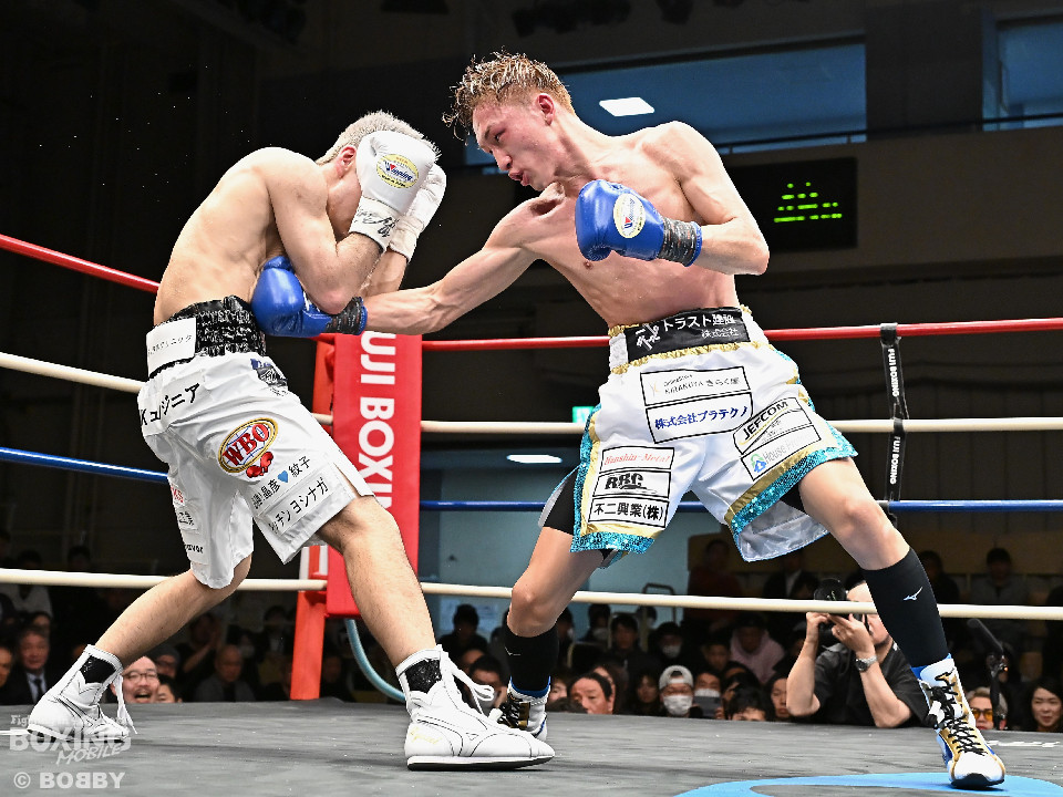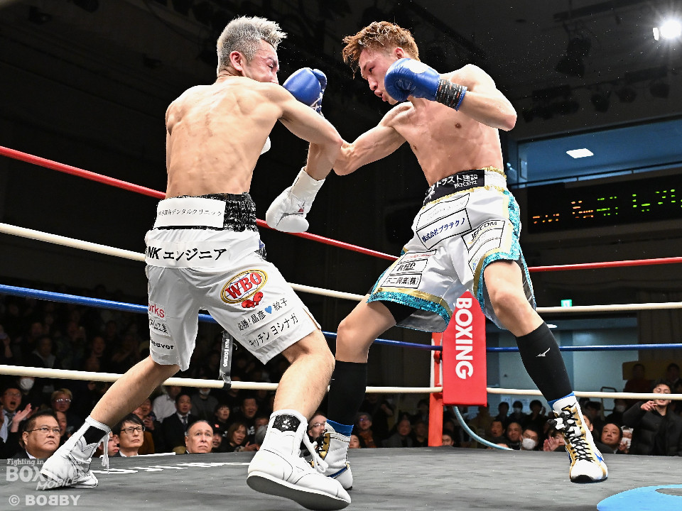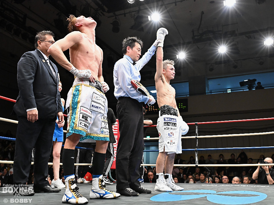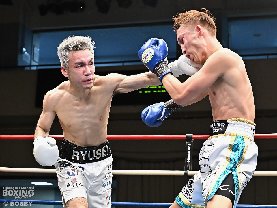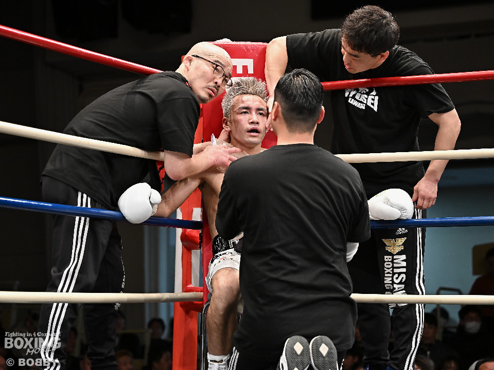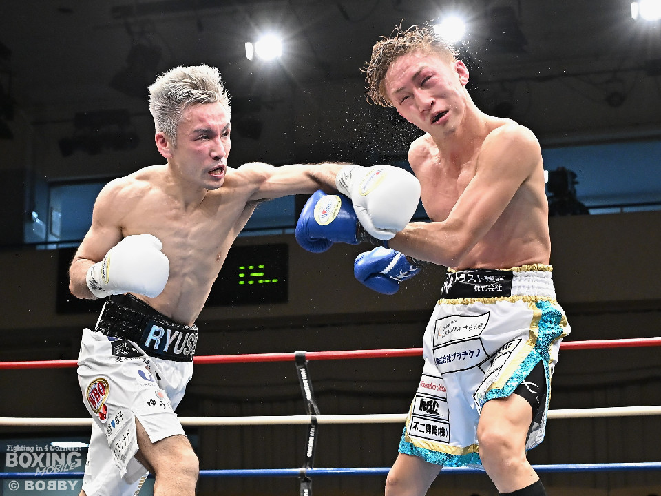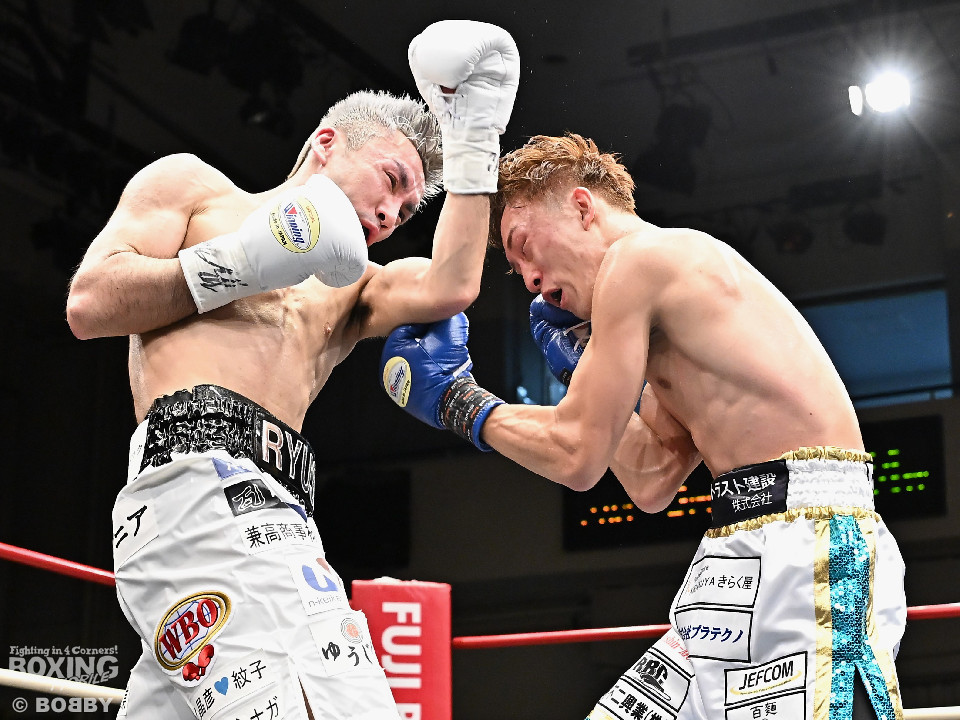 試合:WBOアジアパシフィック・スーパーフライ級王者の川浦の3度目の防衛戦。挑戦者は世界ランカーの韓。サウスポー同士による一戦は、韓がジャブから左ストレートを叩きつけて先制。対する川浦もリターンの右ボディで対抗。初回からハイレベルな攻防を繰り広げた。2回、韓は左ストレートを上下に打ち分けると返しの左をブロック。3回、韓は打ち下ろしの左ストレート、左アッパーで攻め立てるが、川浦は左カウンターでガクッと腰を沈めさせると上下に打ち分け、一気に流れを掴む。4回、韓はジャブからワンツーにつなげて強気に攻めるが、川浦は打ち終わりに左ストレートを好打。5回、韓はボディに的を絞り体力を削る作戦。6回、一進一退の攻防で消耗戦が続いた。7回、川浦はワンツーをねじ込むと要所で右ボディを好打。8回、川浦は距離を詰めてきた相手に左ショートを顔を弾く。我慢強くボディを叩く韓とカウンターを返す川浦。9回、韓は距離を潰してボディ打ちを徹底。10回、「龍生」「リャンホ」コールが交錯する中、韓がしつこくボディを叩けば、川浦も必死にワンツーを返した。採点は割れたがジャッジ2者の支持を得た川浦がベルトを死守した。