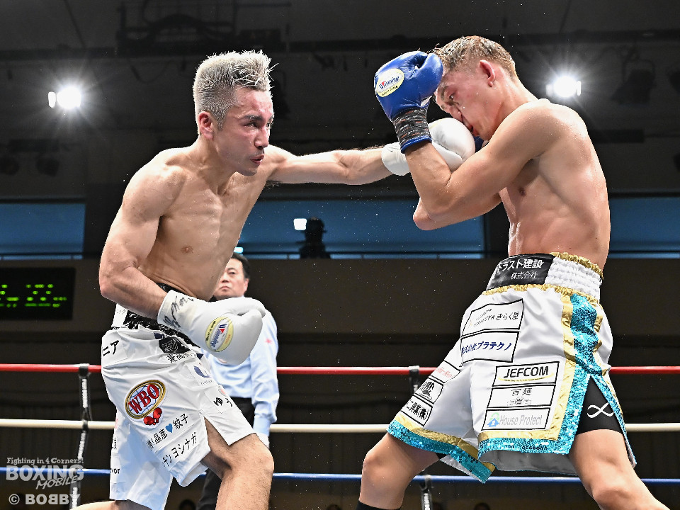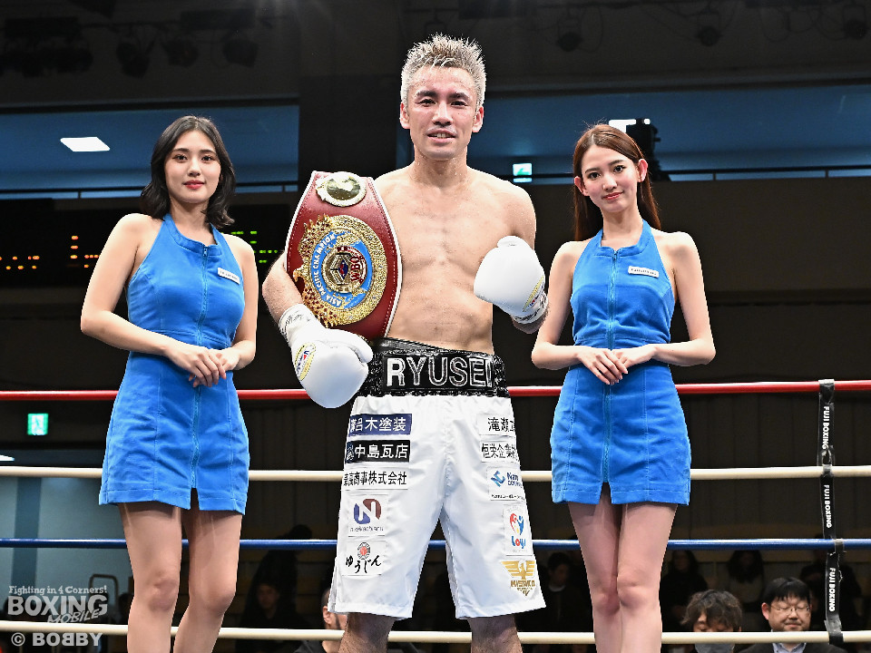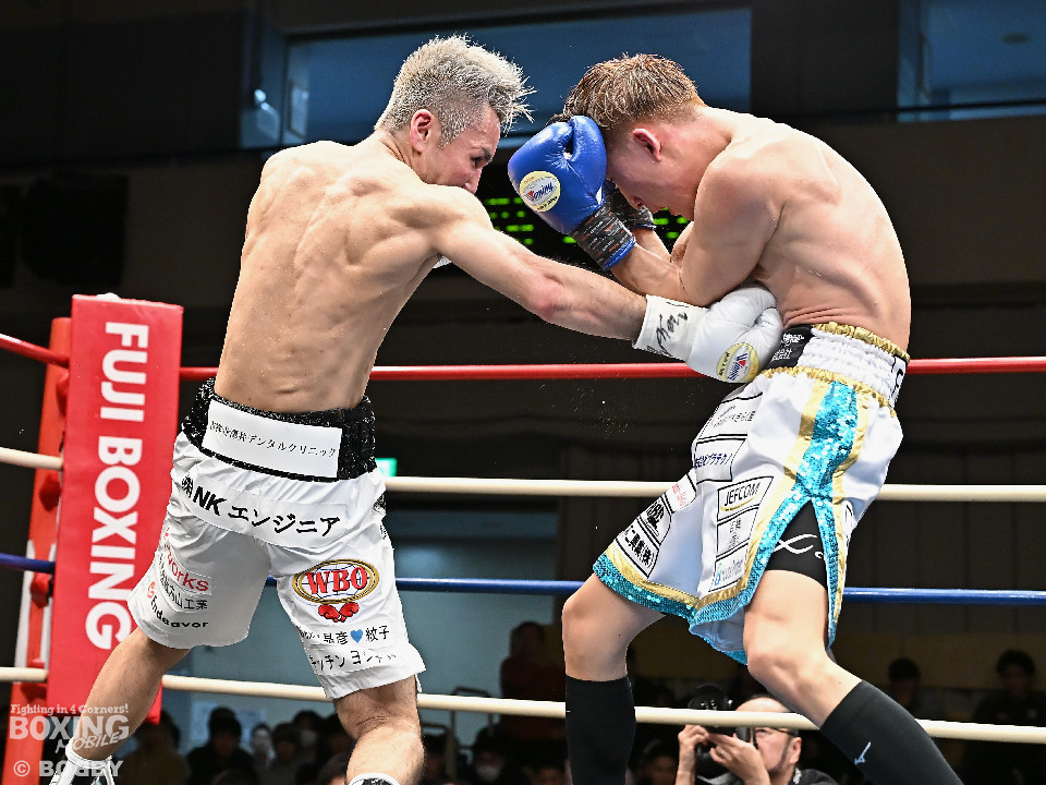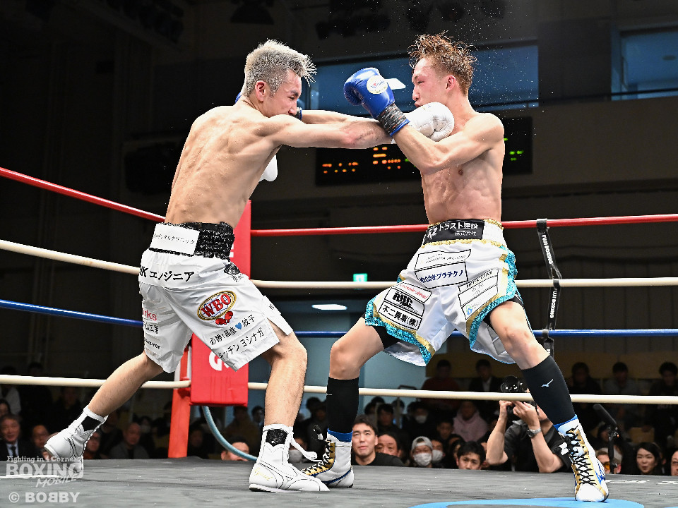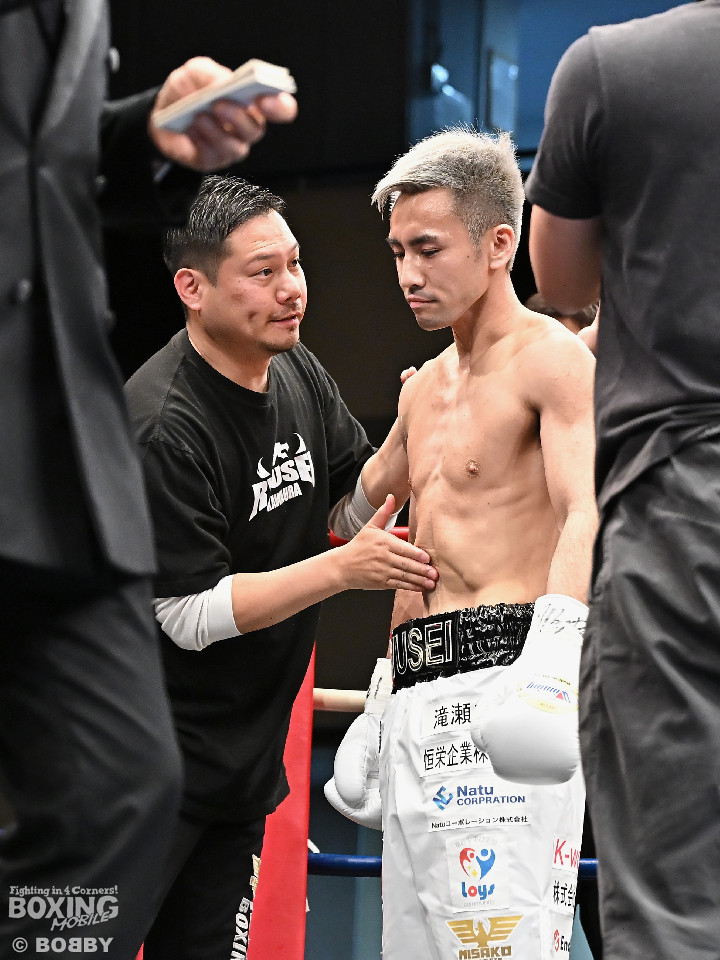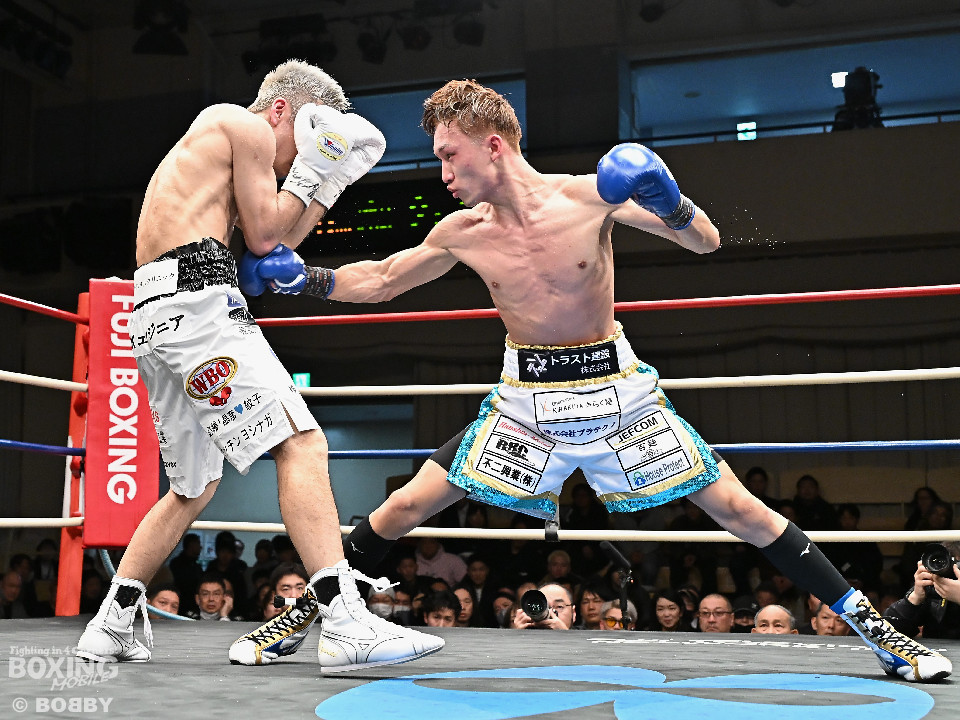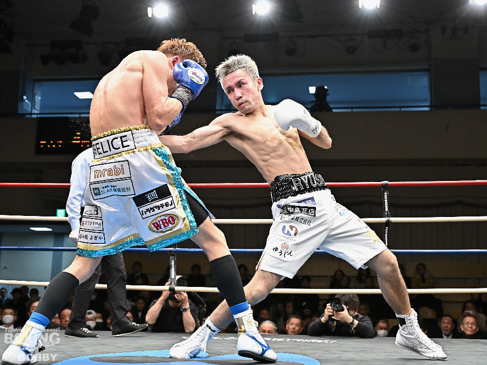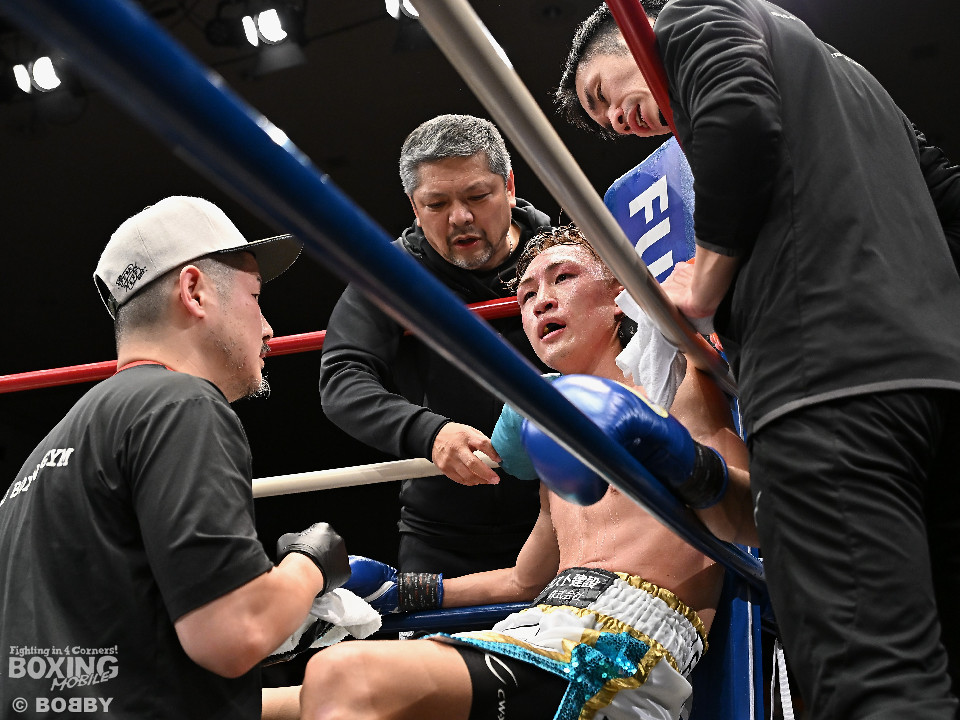 試合:WBOアジアパシフィック・スーパーフライ級王者の川浦の3度目の防衛戦。挑戦者は世界ランカーの韓。サウスポー同士による一戦は、韓がジャブから左ストレートを叩きつけて先制。対する川浦もリターンの右ボディで対抗。初回からハイレベルな攻防を繰り広げた。2回、韓は左ストレートを上下に打ち分けると返しの左をブロック。3回、韓は打ち下ろしの左ストレート、左アッパーで攻め立てるが、川浦は左カウンターでガクッと腰を沈めさせると上下に打ち分け、一気に流れを掴む。4回、韓はジャブからワンツーにつなげて強気に攻めるが、川浦は打ち終わりに左ストレートを好打。5回、韓はボディに的を絞り体力を削る作戦。6回、一進一退の攻防で消耗戦が続いた。7回、川浦はワンツーをねじ込むと要所で右ボディを好打。8回、川浦は距離を詰めてきた相手に左ショートを顔を弾く。我慢強くボディを叩く韓とカウンターを返す川浦。9回、韓は距離を潰してボディ打ちを徹底。10回、「龍生」「リャンホ」コールが交錯する中、韓がしつこくボディを叩けば、川浦も必死にワンツーを返した。採点は割れたがジャッジ2者の支持を得た川浦がベルトを死守した。