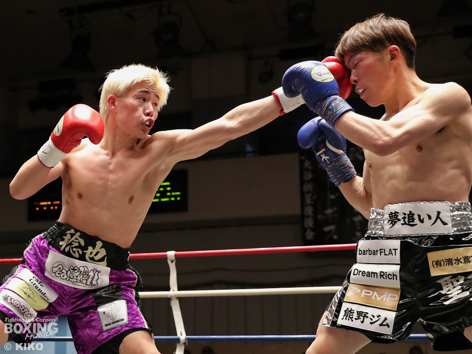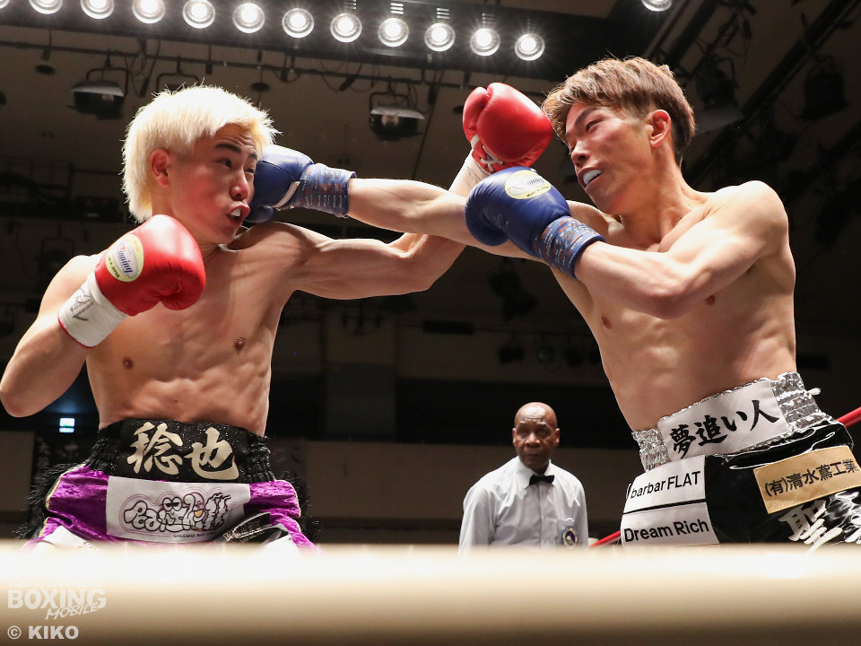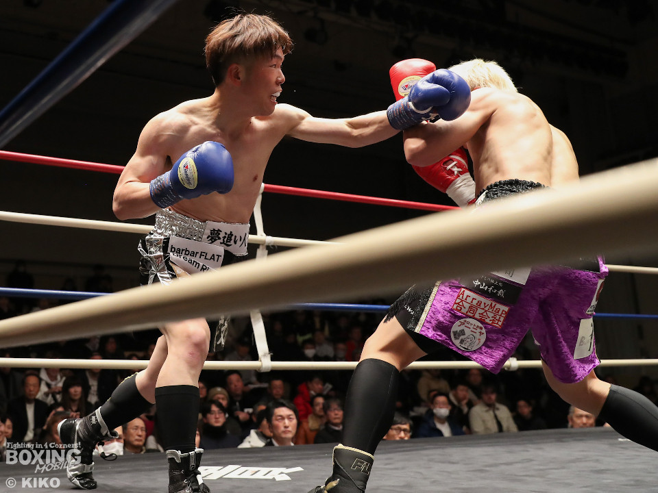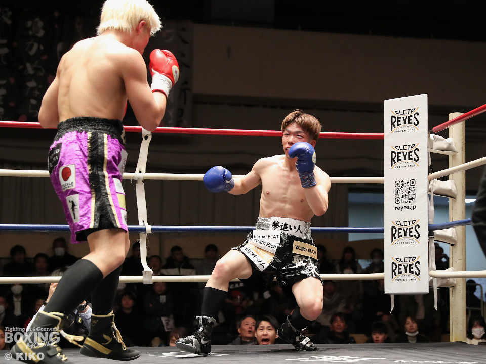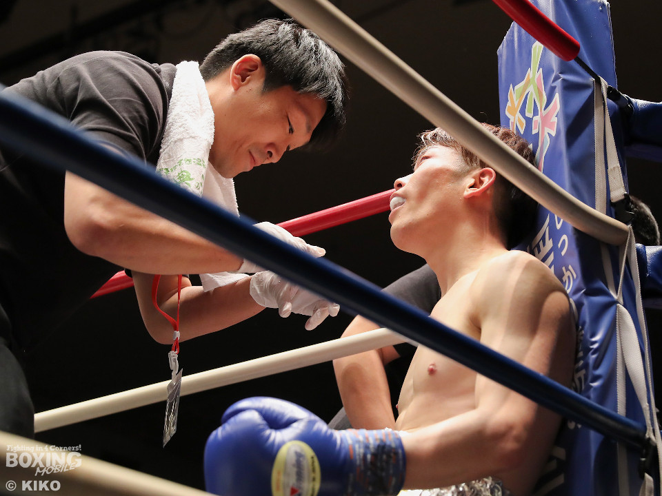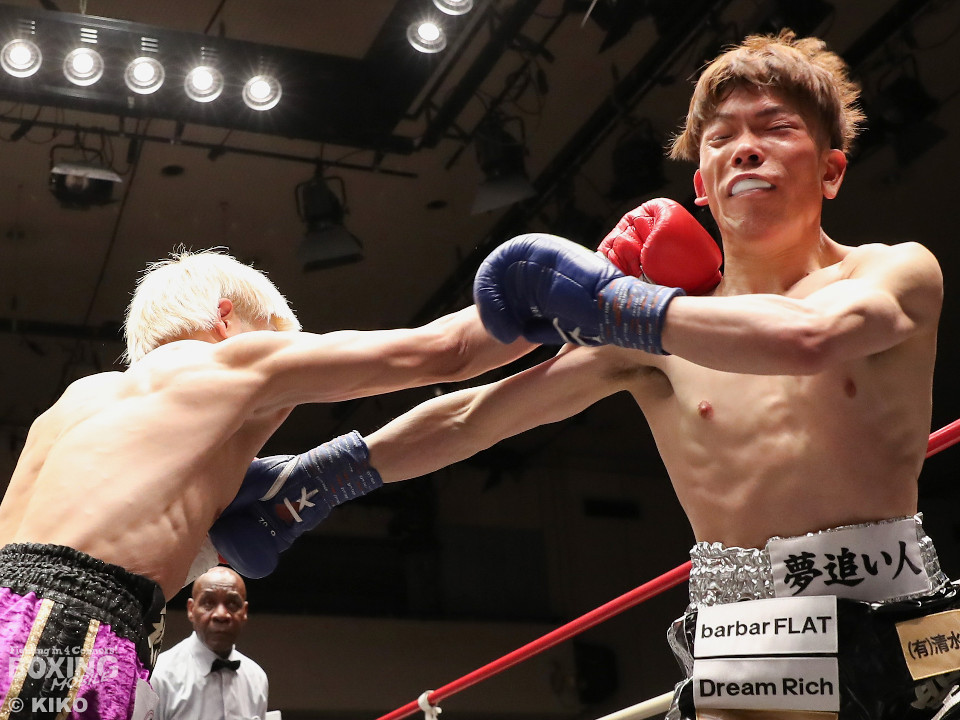 試合:藤井が右カウンターでで顔を弾くと左で揺さぶりをかけながらジワリジワリと攻め立てる。サウスポー浅海はジャブを飛ばして距離を探るが左ストレートにつなげられず。手数が少ない藤井だがラウンド終盤、ワンツーを好打。3回も藤井はジリジリと距離を詰めてワンツーをヒットしポイントを加点。勝負が決まったのは4回、藤井は伸びのある右ストレートで顔を弾いたところでレフェリーが割って入った。