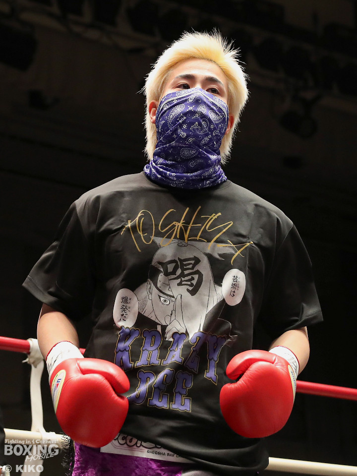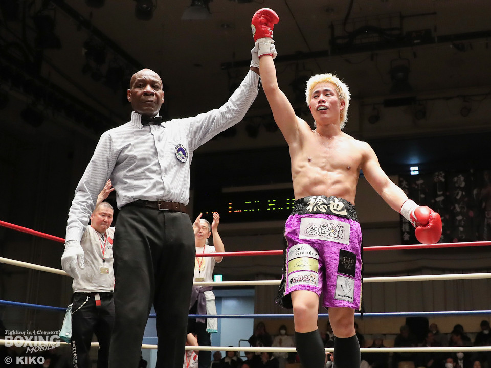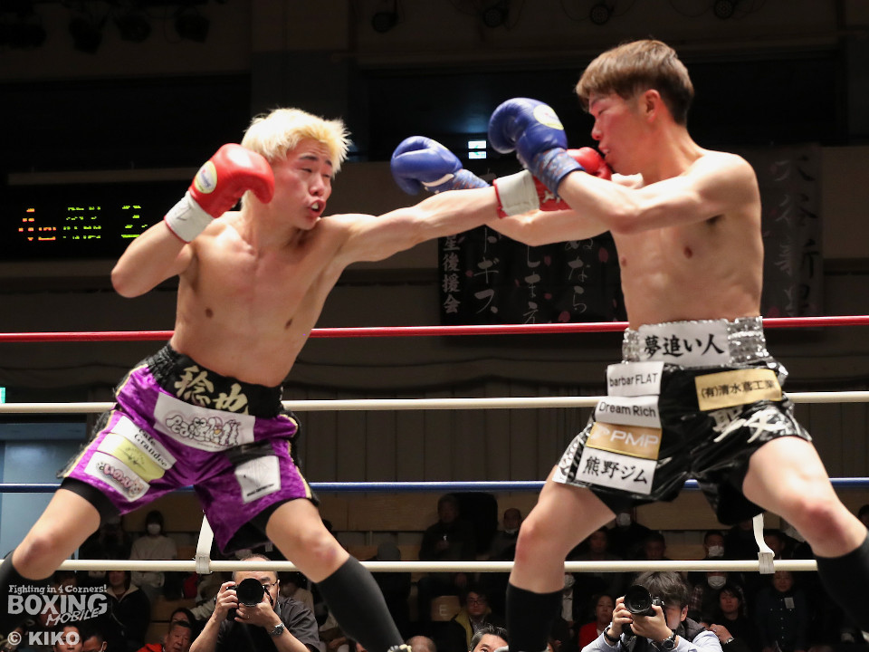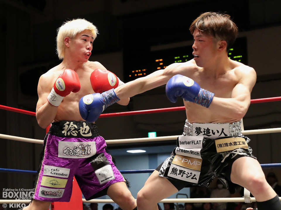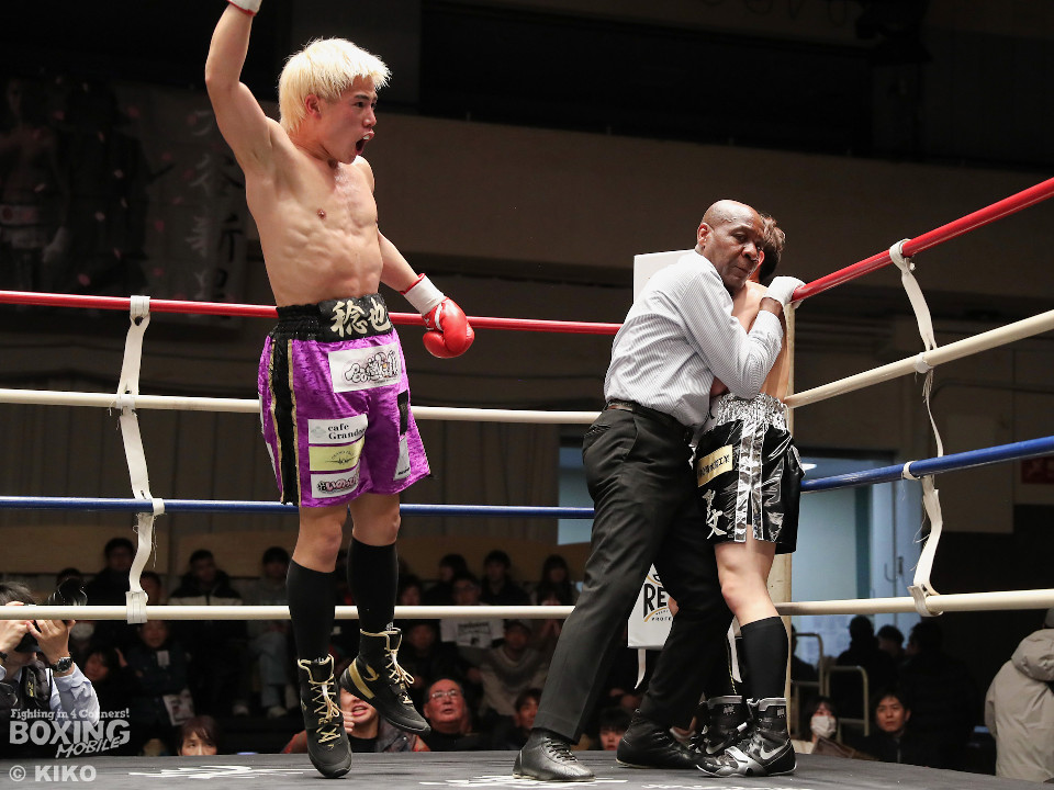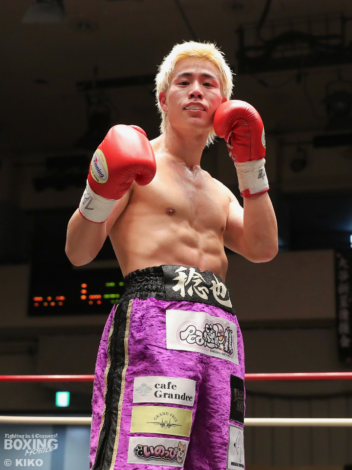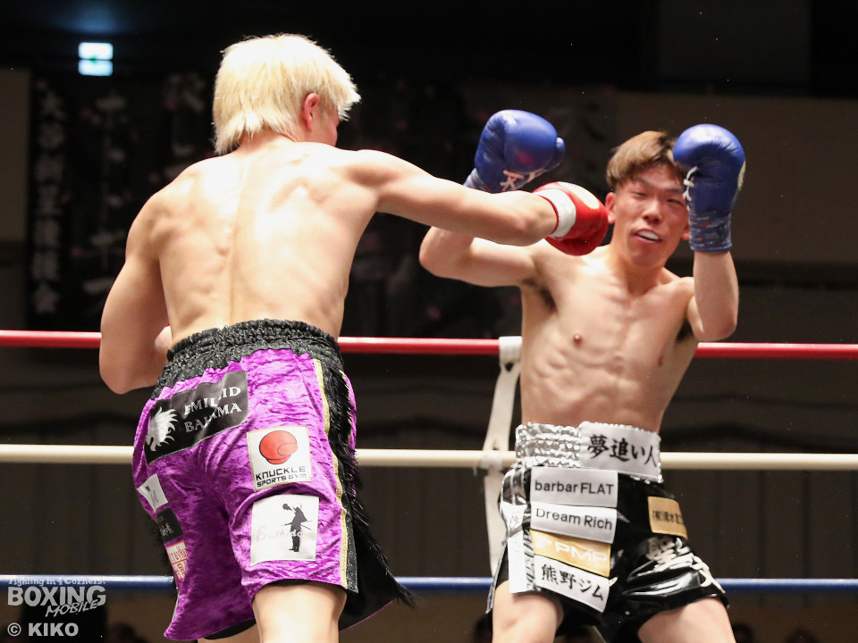 試合:藤井が右カウンターでで顔を弾くと左で揺さぶりをかけながらジワリジワリと攻め立てる。サウスポー浅海はジャブを飛ばして距離を探るが左ストレートにつなげられず。手数が少ない藤井だがラウンド終盤、ワンツーを好打。3回も藤井はジリジリと距離を詰めてワンツーをヒットしポイントを加点。勝負が決まったのは4回、藤井は伸びのある右ストレートで顔を弾いたところでレフェリーが割って入った。