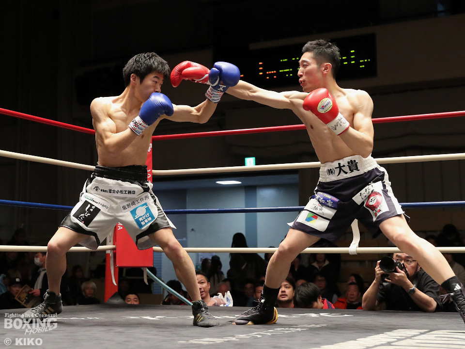 試合:サウスポー菅原が独特のタイミングの左ストレートをヒット。動きに硬さがみられる相手を攻め立てるとワンツーでダウンを奪取。ファイティングポーズを取った森山だったが、ダメージの深さを考慮したレフェリーは10カウントを数え上げた。初回KO勝ちした菅原にはKO賞として10万円が贈られた。