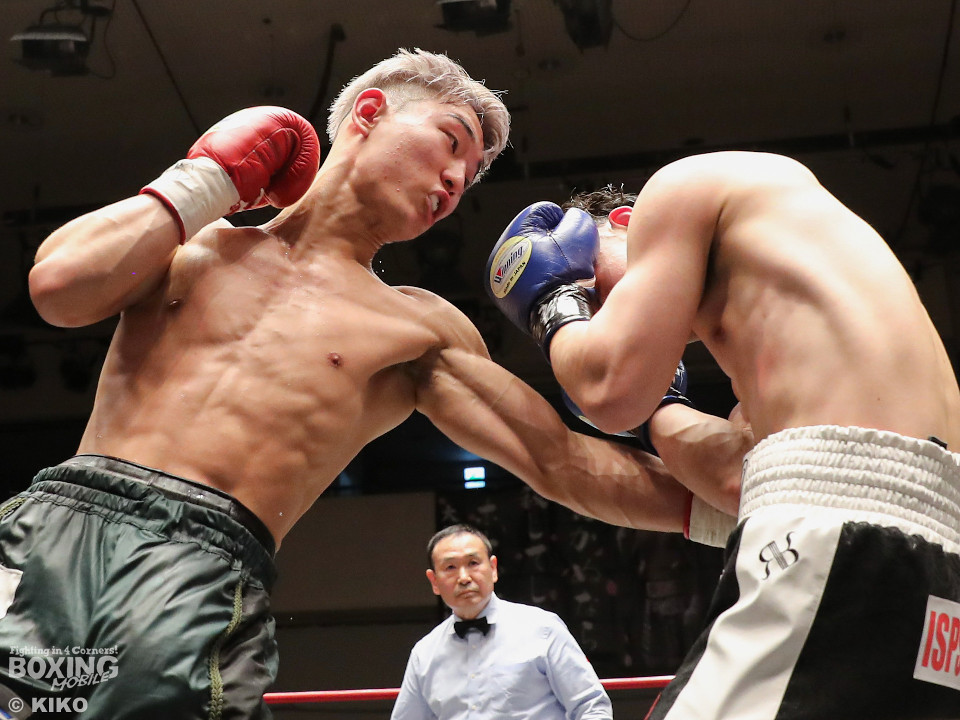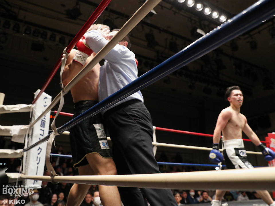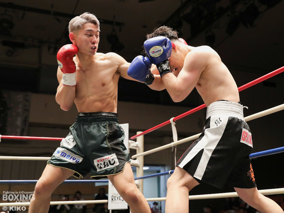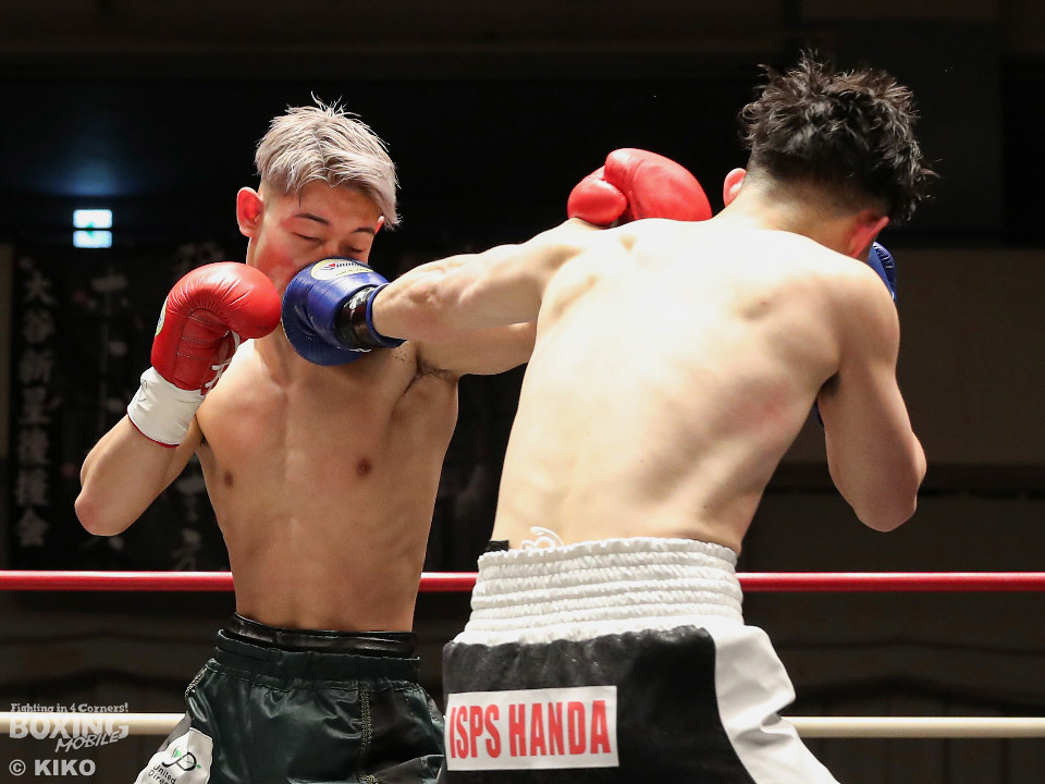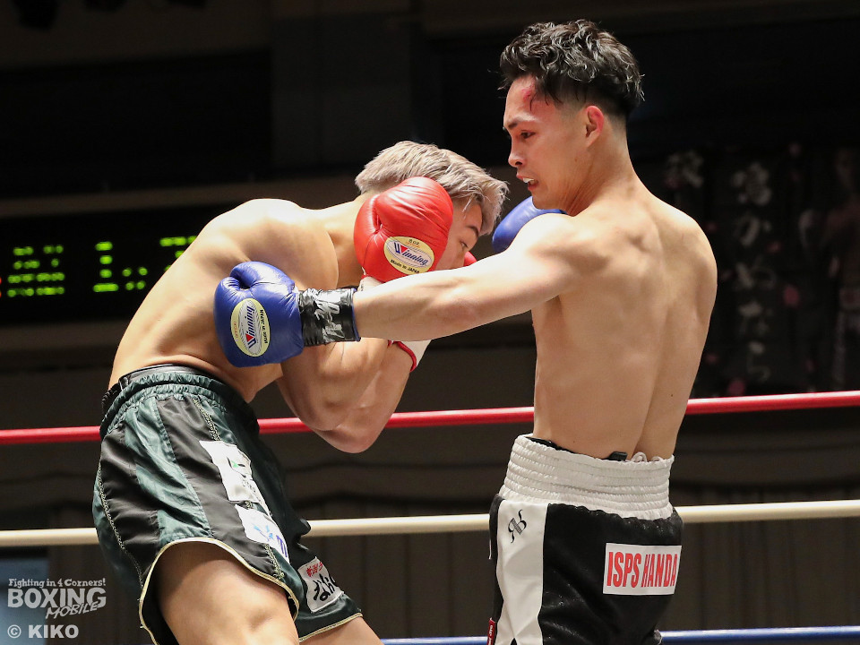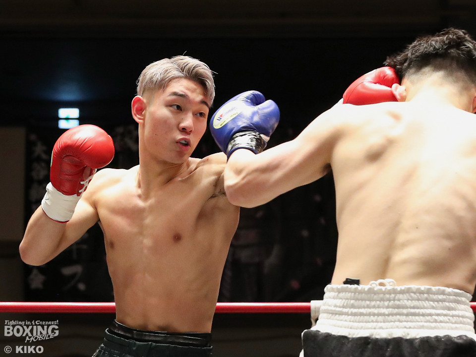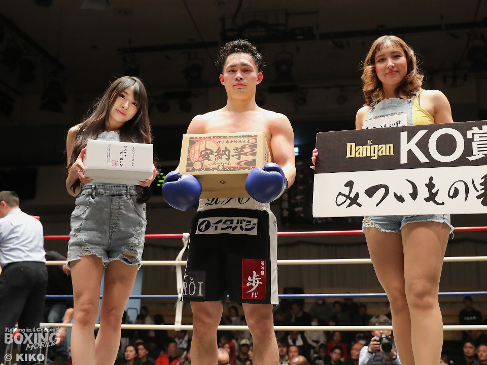 試合:塩崎が右オーバーハンド、左ボディを叩き込むが、古殿はガッチリとガードすると左ボディを好打。相手の強打に対し冷静に対応した。2回、古殿は打ち終わりを狙うと左フックを引っかけてダウンを奪った。立ち上った塩崎はお構いなしとばかりにグイグイと攻め込むが、相手の硬いガードを崩せず。3回、古殿は右ショートで腰を沈めさせるとチャンスとばかりにパンチを畳みかけてレフェリーストップに持ち込んだ。3ラウンドKO勝ちした古殿にはKO賞2万円をゲットした。