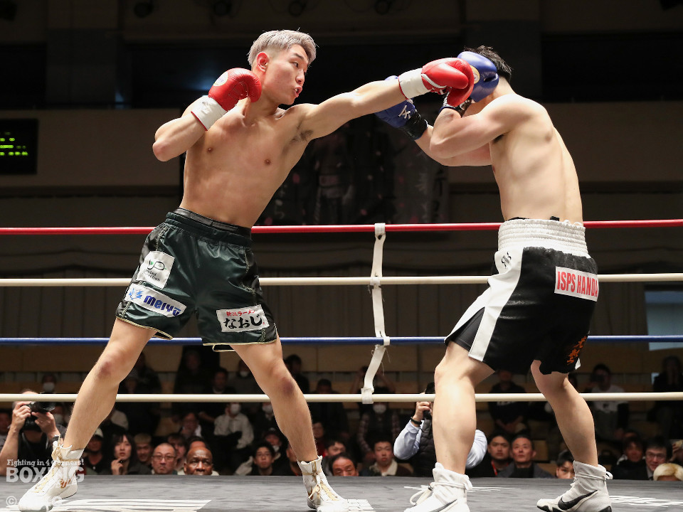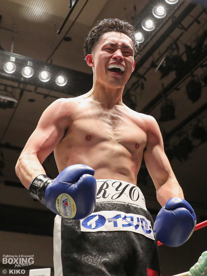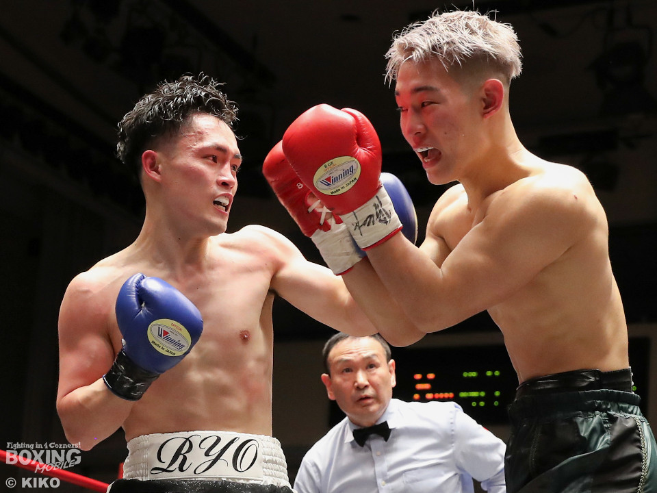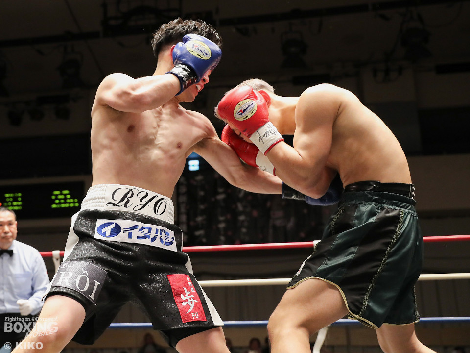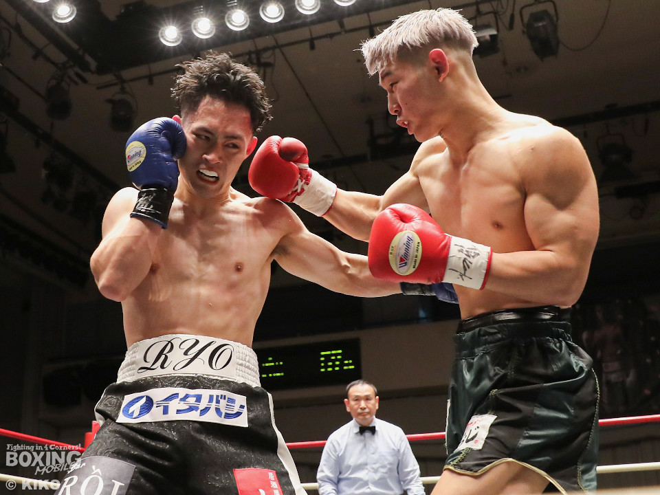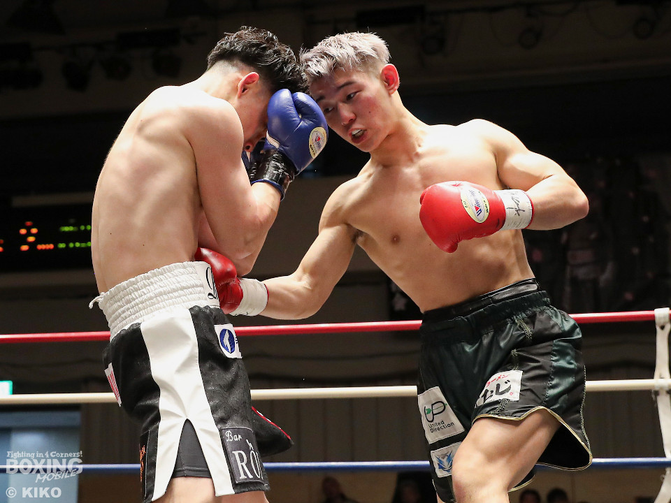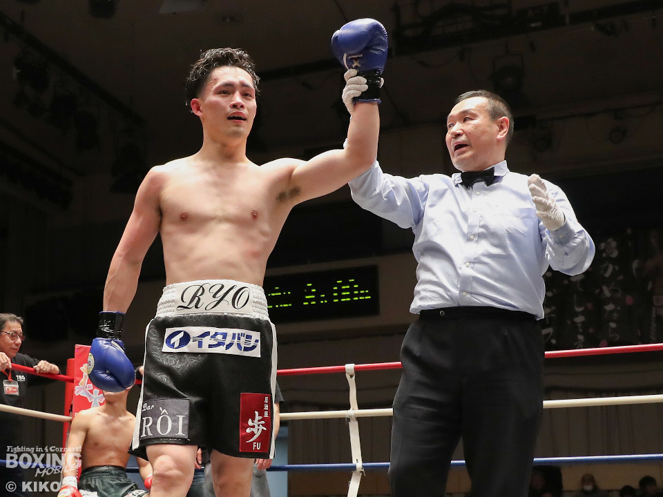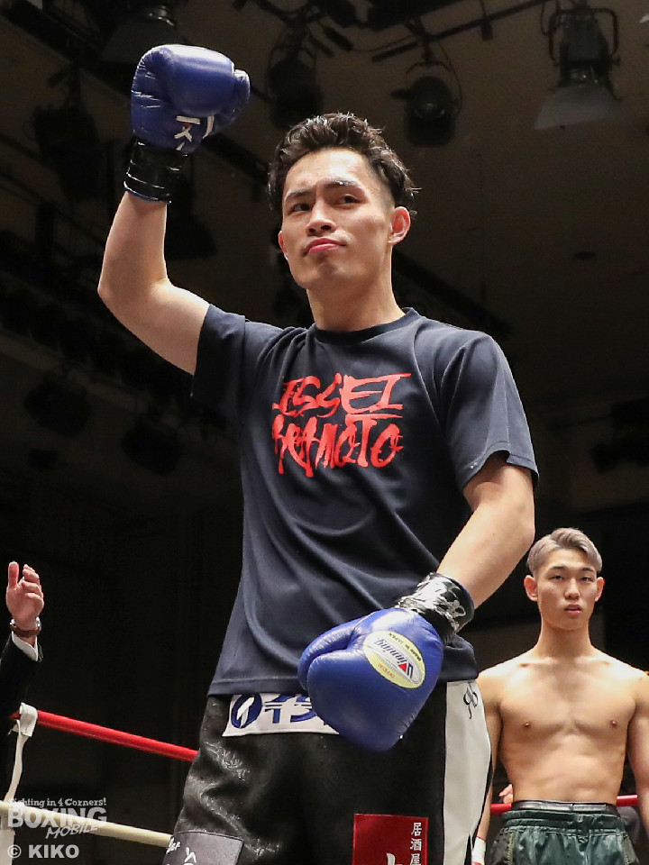試合:塩崎が右オーバーハンド、左ボディを叩き込むが、古殿はガッチリとガードすると左ボディを好打。相手の強打に対し冷静に対応した。2回、古殿は打ち終わりを狙うと左フックを引っかけてダウンを奪った。立ち上った塩崎はお構いなしとばかりにグイグイと攻め込むが、相手の硬いガードを崩せず。3回、古殿は右ショートで腰を沈めさせるとチャンスとばかりにパンチを畳みかけてレフェリーストップに持ち込んだ。3ラウンドKO勝ちした古殿にはKO賞2万円をゲットした。