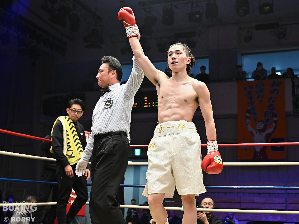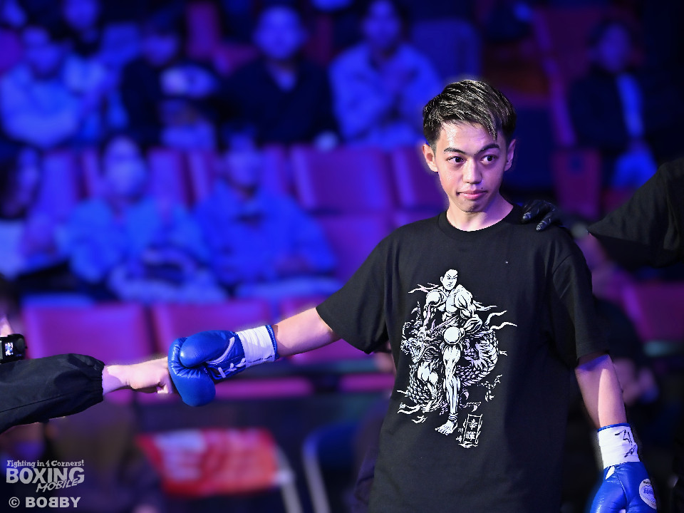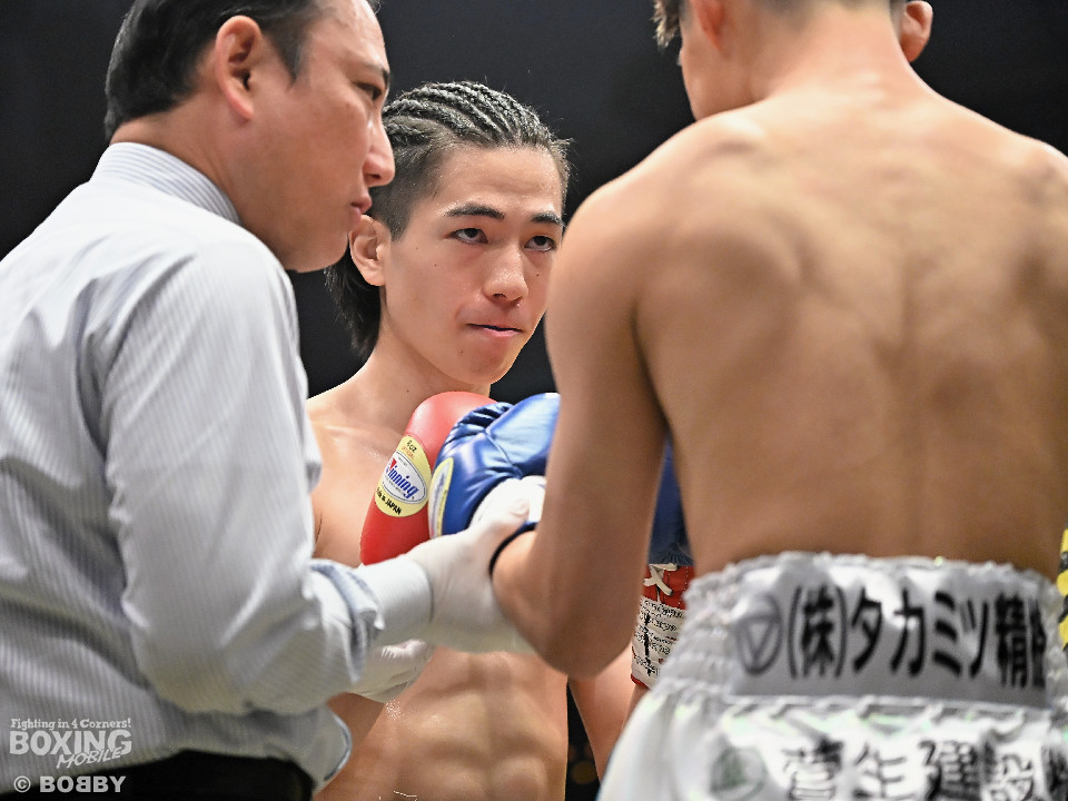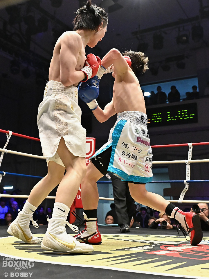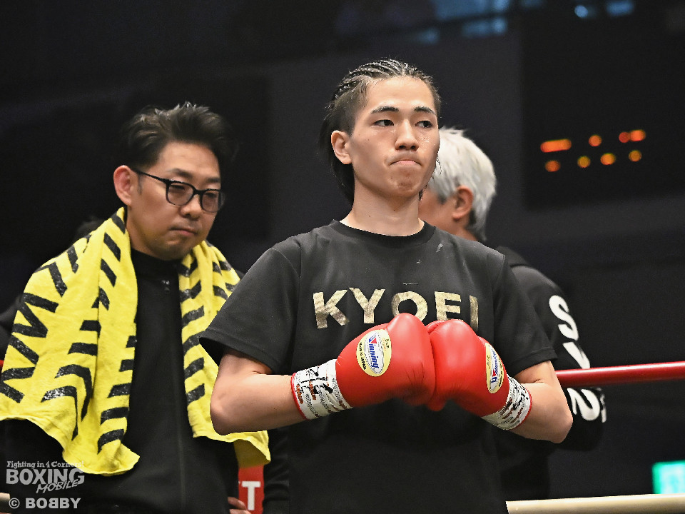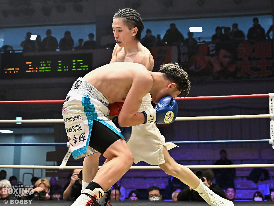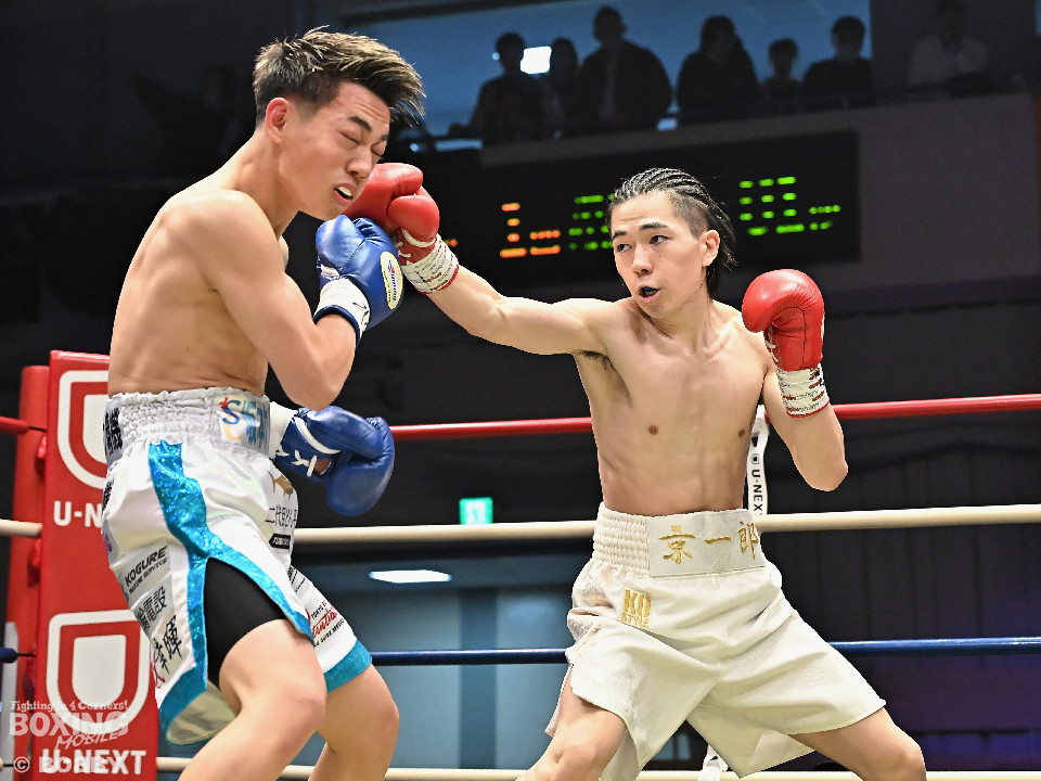 試合:草野がサイドに切って右から切り込むが、サウスポー下村は左ストレートを上下にヒット。距離をキープしながら落ち着いた試合運びを見せた。2回、打ち合いに持ち込みたい草野だが、相手の左が邪魔で思い通りの展開を作れず。3回、下村は左カウンターでダウンを先取。再開後、攻め急がず左ボディアッパーを織り交ぜてペースを維持した。4回、逆転を狙う草野は最後まで果敢に攻めたが、下村は左ストレートで顔を弾くとレフェリーが割って入った。