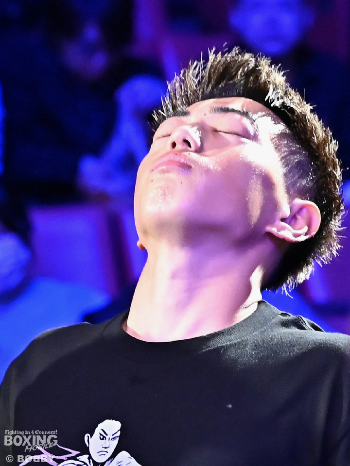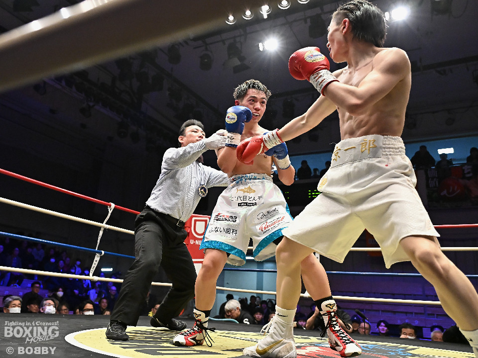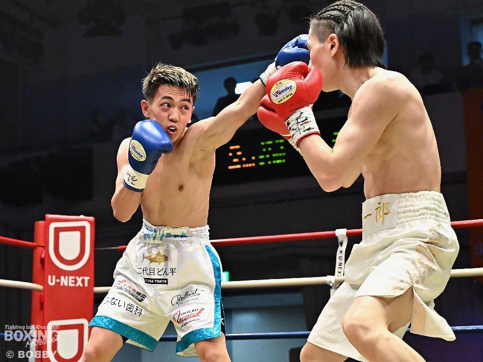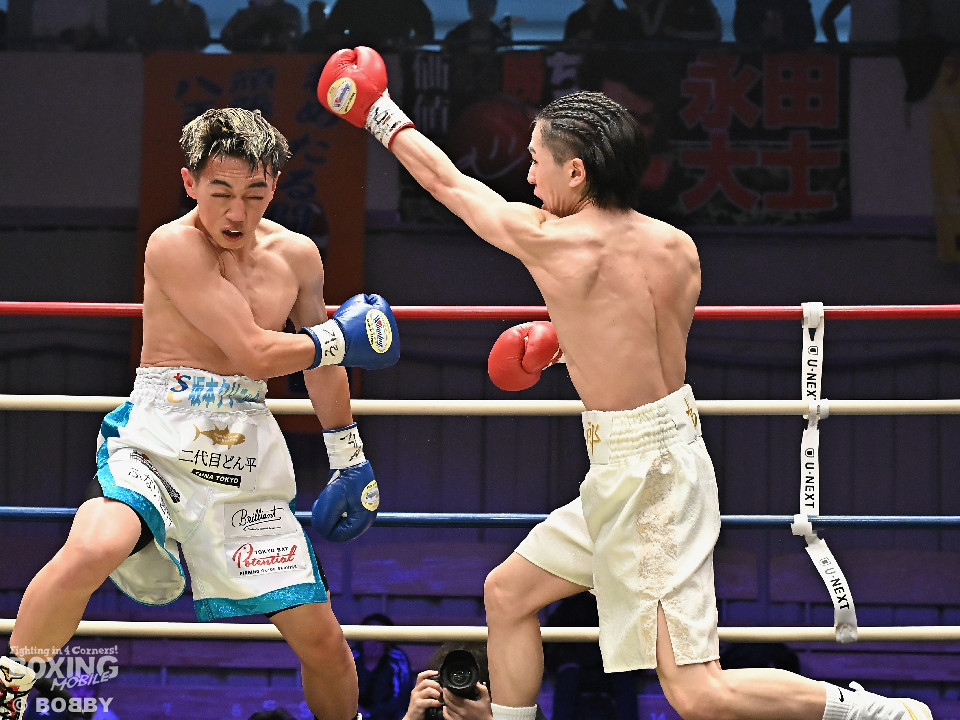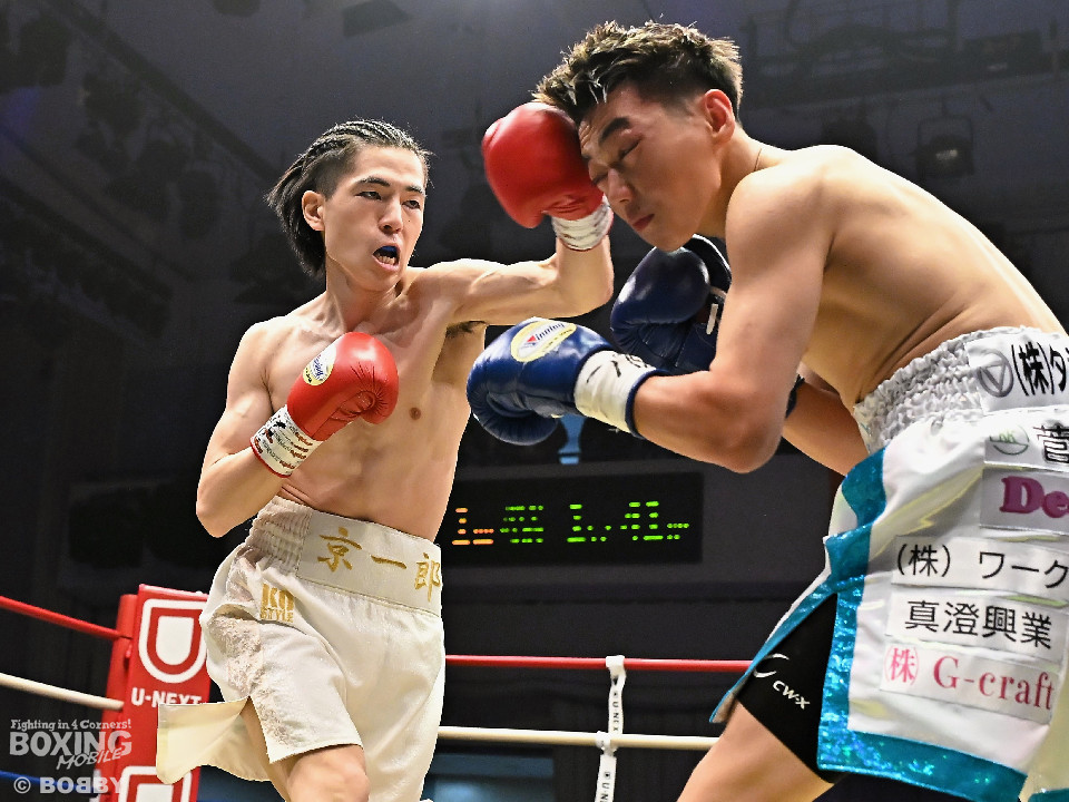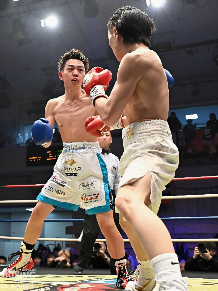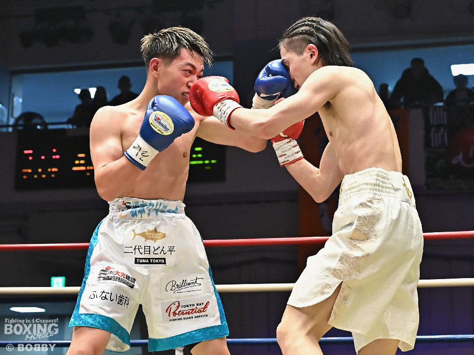 試合:草野がサイドに切って右から切り込むが、サウスポー下村は左ストレートを上下にヒット。距離をキープしながら落ち着いた試合運びを見せた。2回、打ち合いに持ち込みたい草野だが、相手の左が邪魔で思い通りの展開を作れず。3回、下村は左カウンターでダウンを先取。再開後、攻め急がず左ボディアッパーを織り交ぜてペースを維持した。4回、逆転を狙う草野は最後まで果敢に攻めたが、下村は左ストレートで顔を弾くとレフェリーが割って入った。