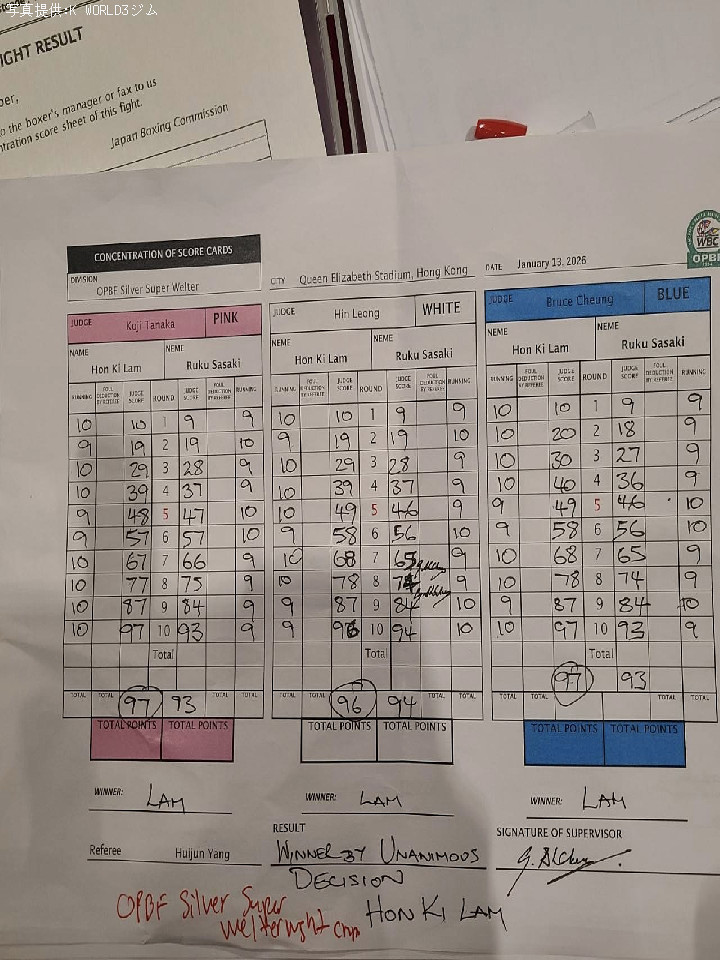 試合:日本ユース・スーパーウェルター級王者の佐々木が香港でOPBFシルバー王座決定戦に出場。初回、佐々木がジャブを突きながら左ボディを好打し先制攻撃。2回、ラムはインサイドからのショートアッパーで反撃。3回も激しい打撃戦が続く。ラムが左右フックを叩きつければ、佐々木も要所で左ボディをヒット。4回、佐々木は上体でリズムを取りながら左のダブルのコンビネーションをヒット。5回、佐々木は右フックで顔を弾くとギアを上げて攻勢。6回、火が出るようにな打ち合いが続き消耗戦に。7回、ラムは中間距離でジャブを軸にコントロール。8回、佐々木はグイっと前に出て右フックを強振。9回、佐々木は思い切りの良い右フックで後退させて見栄えの良さをアピール。10回、佐々木は右フックをブン!ラムは打ち終わりに右ストレートを合わせた。試合終了のゴングが鳴ると両者とも手を挙げて勝利をアピールした。ジャッジに委ねられた採点はラムを支持。勝利したラムはリングで歓喜の涙を流した。最後まで果敢に攻めた佐々木だが、悔しい結果となった。