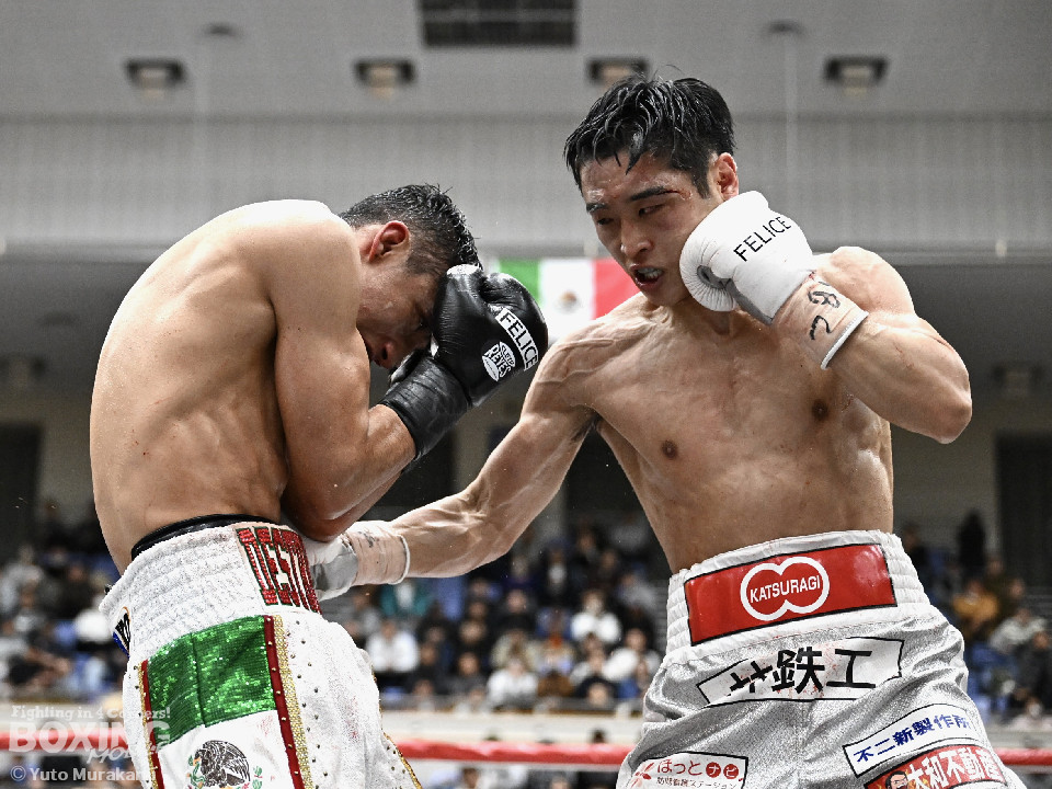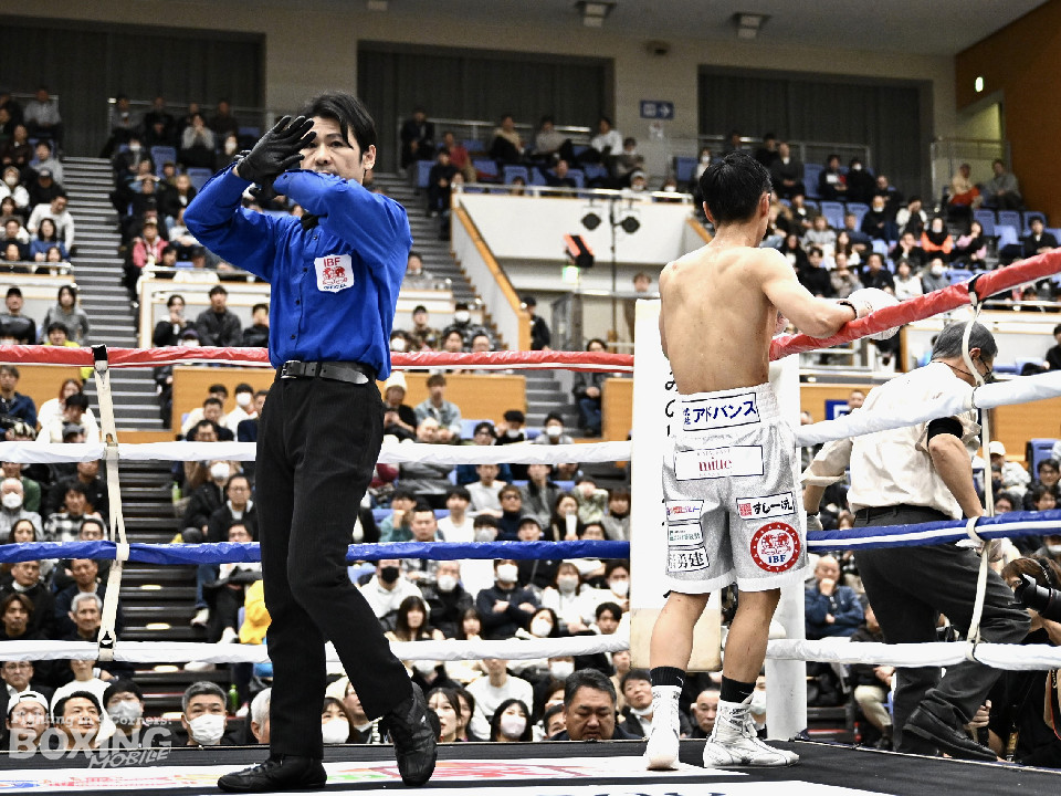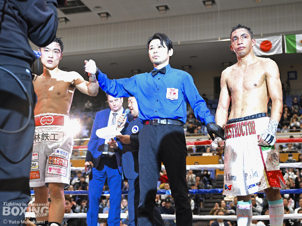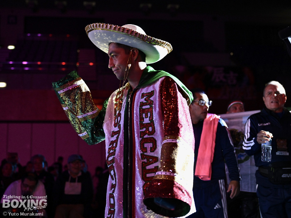 IBF世界スーパーバンタム級挑戦者決定戦。世界2階級制覇を狙う西田とメキシコ期待の新鋭メルカドが対峙した。両国の国歌が流れると会場がキュッと引き締まった。静寂に包まれる中スタートした試合は、メルカドが頭を振りながら右フックを強振するが、サウスポー西田は冷静に対応。要所で左ボディストレートを差し込み先手を奪った。2回、偶然のバッティングで西田は左目上、メルカドは左額をカット。再開後、メルカドは左右フックを叩きつけるが、西田は負けん気の強さを見せて左ボディアッパー、右フックを好打。3回、西田は角度を変えながら左ストレートを決めるとリターンの右をブロックで回避。4回も西田のラウンド。左ボディアッパーで迎え撃つと折りを見て左フックをヒット。5回、西田は左ボディアッパーで動きを止めると連打で攻勢。メルカドはヒッティングで右目上をカット。6回、「西田」コールが沸き起こる中、強弱をつけた上下のコンビネーションでダメージを与えた。7回、西田はボディ攻撃を徹底。しかし、メルカドも気持ちの強さを見せて打ち返した。しかし、西田の傷が深くなり、2度目のドクターチェックの末、レフェリーはこれ以上の試合を不能と判断しストップ。勝負は負傷判定へと持ち込まれた。ジャッジ3者ともに5ポイント差をつけた西田が世界王座挑戦権を獲得した。