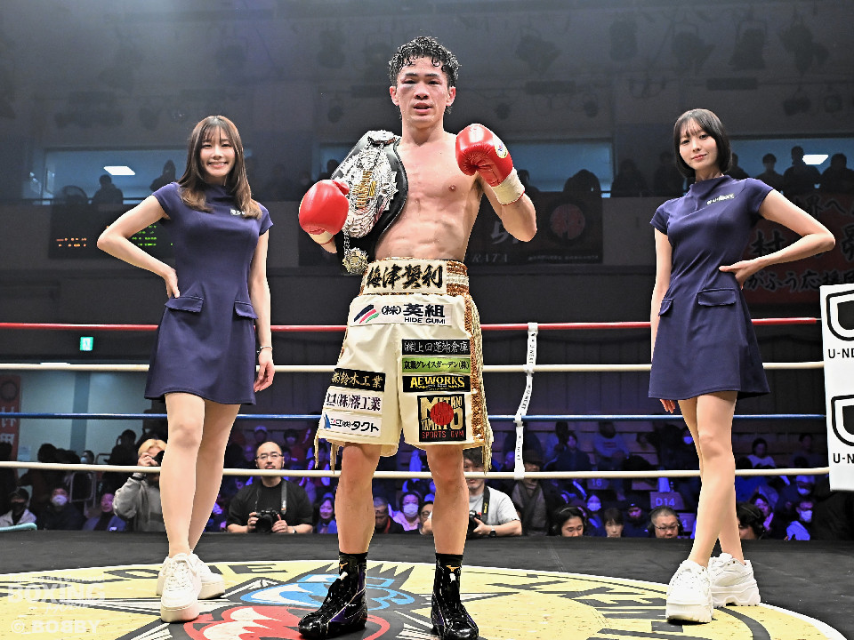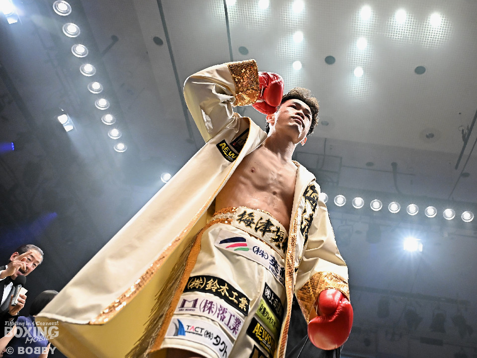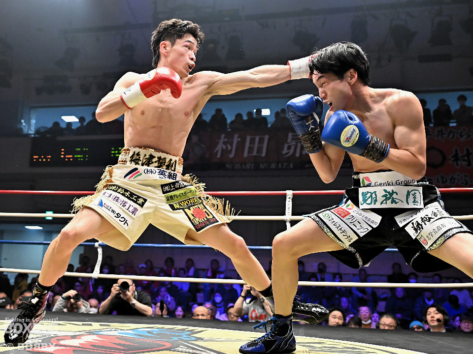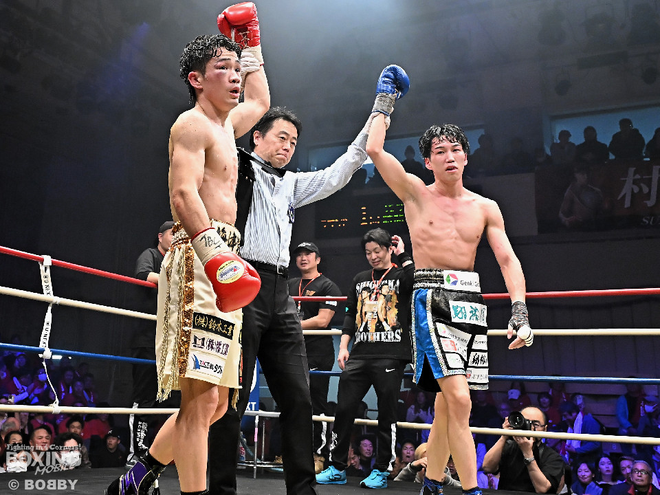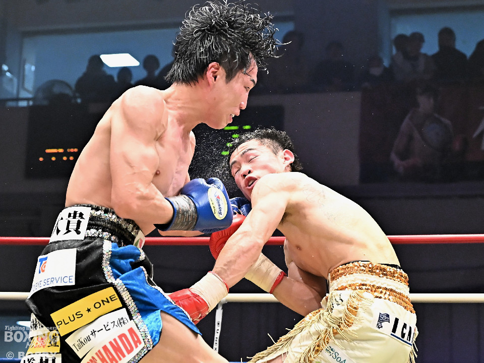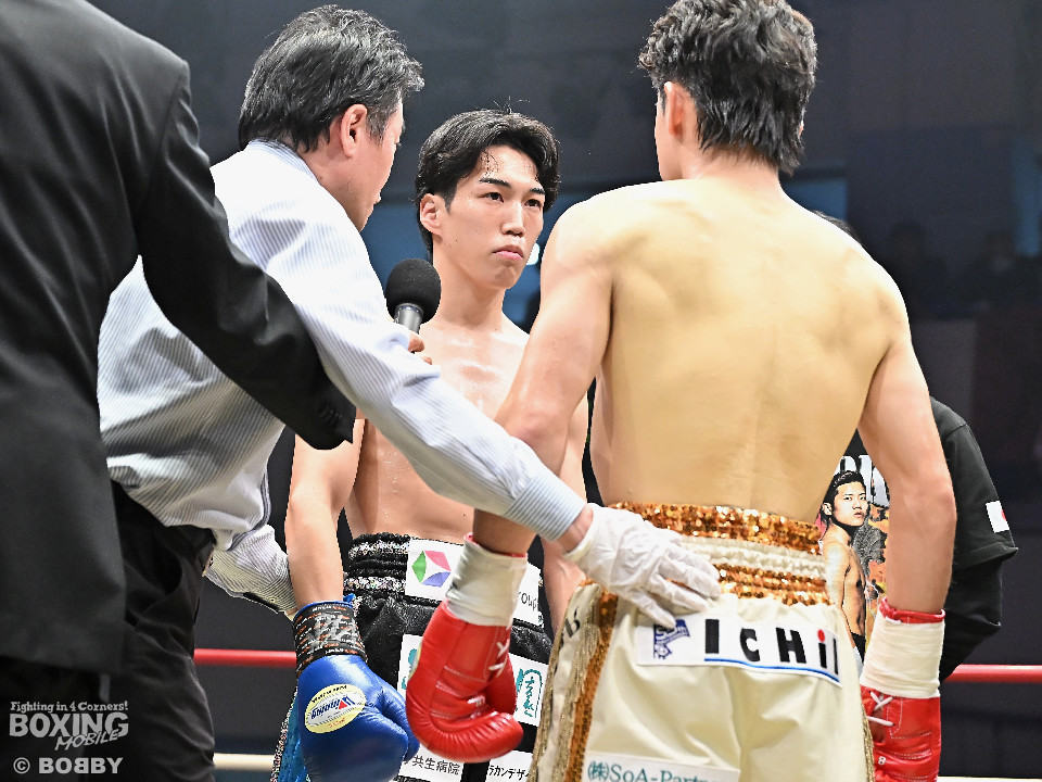 試合:日本バンタム級王者の梅津が元日本王者でランキング1位の富施を迎え撃った。映画「ロッキー」のテーマ曲で入場してきた梅津は、コーナー下で気持ちを高めると颯爽とリングイン。挑戦者は対角線上の相手を一点に見つめて静かに闘志を燃やした。開始早々、梅津がステップインから右ボディストレートで先制。しかし、サウスポー富施は慌てる素振りを見せず左オーバーハンド、右アッパーをヒット。2回、梅津はプッシュしながらボディにパンチを集めてグイグイと攻め込み消耗戦へ。3回、富施はノーモーションの左ストレートを好打し見栄えの良さをアピール。4回、梅津はロープに詰めてラッシュ。ピンチの富施はここを乗り切ると左ストレートを返した。梅津は、ヒッティングで右目下を腫らした。5回、ギアを上げた梅津は手数で押し込み攻勢。要所でワンツーをねじ込んだ富施だが、勢いを止めるまでには至らず。前半終了時の公開採点は、48ー47×2(梅津)、48-47(富施)と割れた。6回、富施は左ボディアッパー、左ストレートを打ち分け。お互いに気持ちがこもった打撃戦で日本一を争うにふさわしい戦いを繰り広げた。7回、偶然バッティングで梅津は右目上をカット。8回、富施は距離をキープしながらワンツーをヒット。このラウンド、梅津はやや手数が減った印象。9回、梅津はプレスをかけて回転力を上げた。10回、最後の力を振り絞り、渾身の打ち合い。試合終了のゴングが割ると割れんばかりの歓声に包まれた。ジャッジに委ねられた採点は三者三様の引き分け。ベルトを死守した梅津が初防衛に成功した。