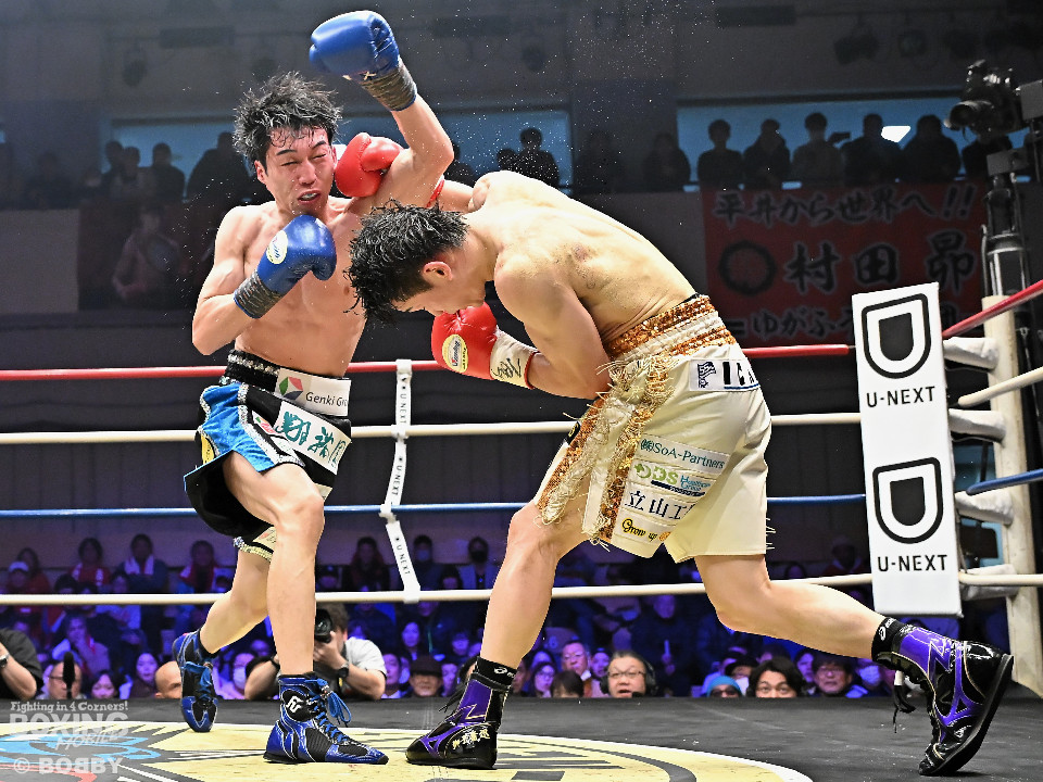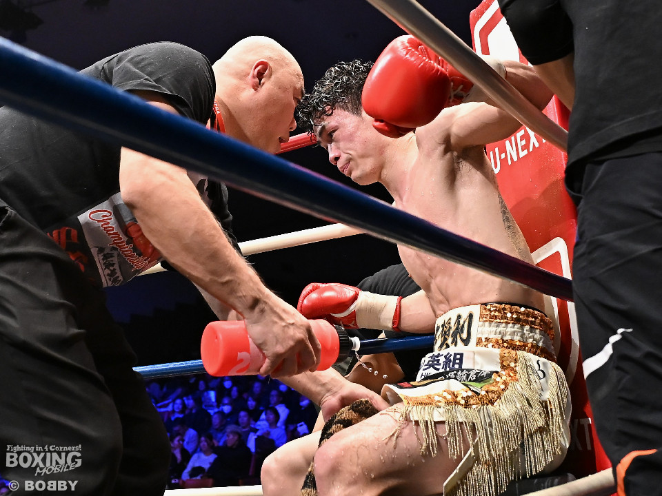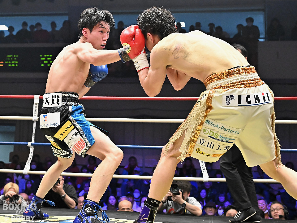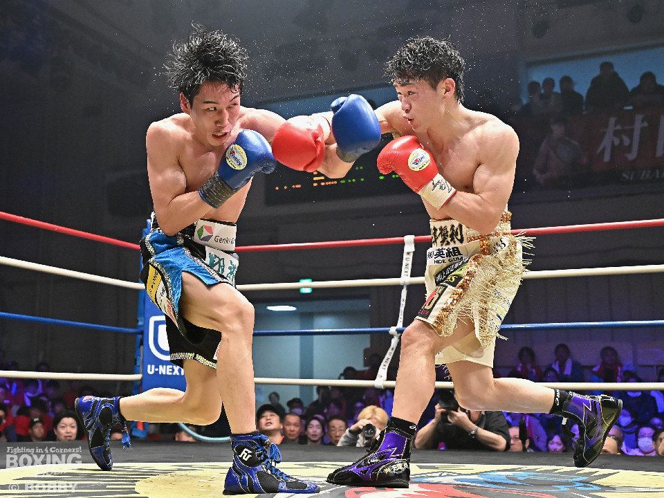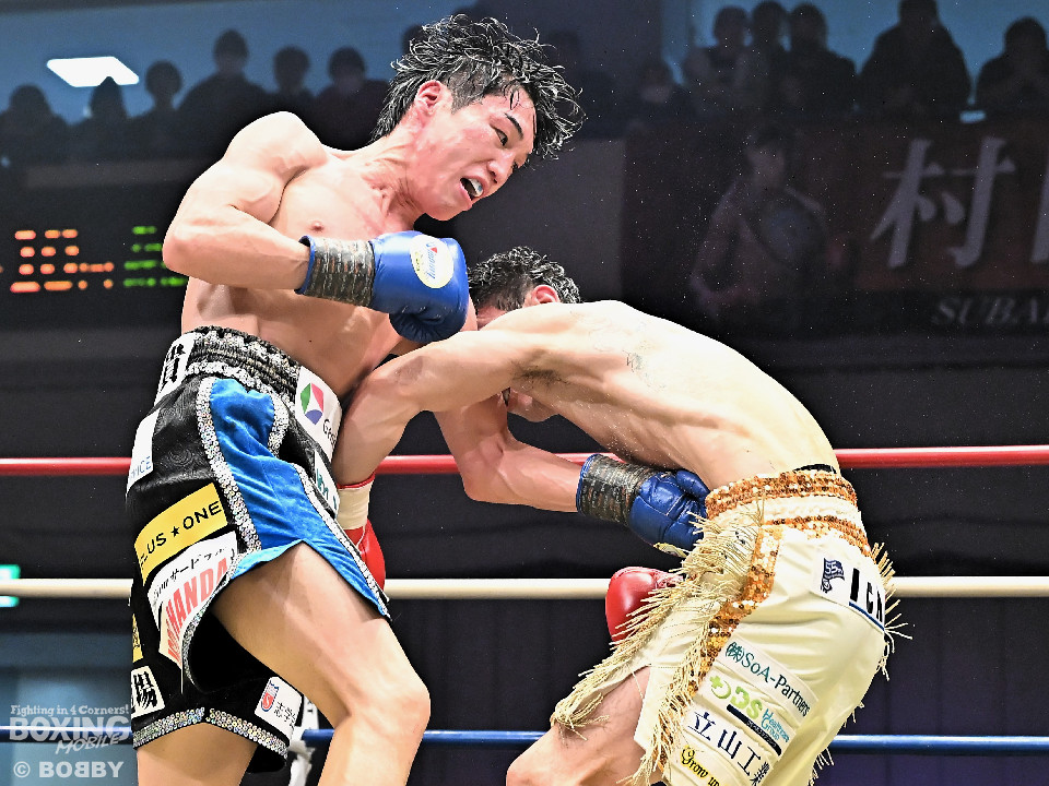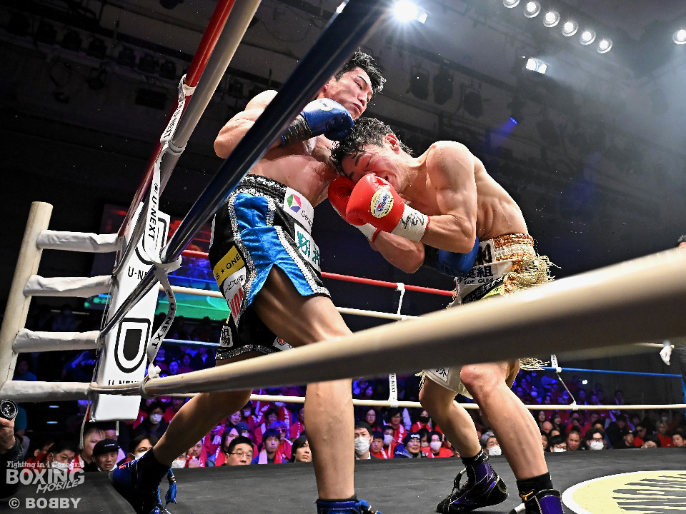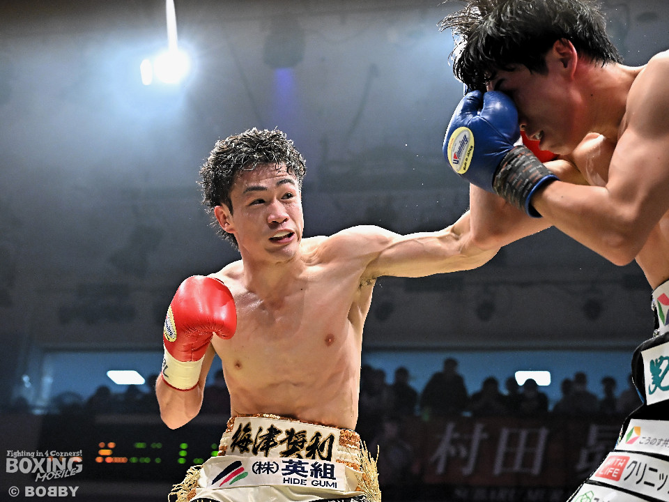 試合:日本バンタム級王者の梅津が元日本王者でランキング1位の富施を迎え撃った。映画「ロッキー」のテーマ曲で入場してきた梅津は、コーナー下で気持ちを高めると颯爽とリングイン。挑戦者は対角線上の相手を一点に見つめて静かに闘志を燃やした。開始早々、梅津がステップインから右ボディストレートで先制。しかし、サウスポー富施は慌てる素振りを見せず左オーバーハンド、右アッパーをヒット。2回、梅津はプッシュしながらボディにパンチを集めてグイグイと攻め込み消耗戦へ。3回、富施はノーモーションの左ストレートを好打し見栄えの良さをアピール。4回、梅津はロープに詰めてラッシュ。ピンチの富施はここを乗り切ると左ストレートを返した。梅津は、ヒッティングで右目下を腫らした。5回、ギアを上げた梅津は手数で押し込み攻勢。要所でワンツーをねじ込んだ富施だが、勢いを止めるまでには至らず。前半終了時の公開採点は、48ー47×2(梅津)、48-47(富施)と割れた。6回、富施は左ボディアッパー、左ストレートを打ち分け。お互いに気持ちがこもった打撃戦で日本一を争うにふさわしい戦いを繰り広げた。7回、偶然バッティングで梅津は右目上をカット。8回、富施は距離をキープしながらワンツーをヒット。このラウンド、梅津はやや手数が減った印象。9回、梅津はプレスをかけて回転力を上げた。10回、最後の力を振り絞り、渾身の打ち合い。試合終了のゴングが割ると割れんばかりの歓声に包まれた。ジャッジに委ねられた採点は三者三様の引き分け。ベルトを死守した梅津が初防衛に成功した。